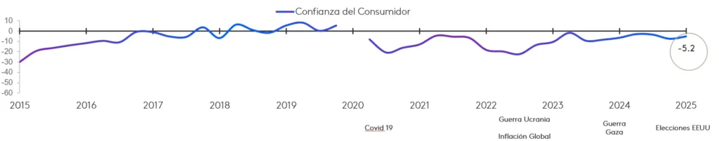 A pesar de que, durante el primer trimestre de 2025, la economía mundial ha mantenido un crecimiento estable, continúa la desconfianza del consumidor en la valoración de la situación económica actual de la Eurozona. Las tensiones por los conflictos territoriales, las medidas arancelarias de EE.UU. y su impacto en regiones clave como China y la Unión Europea generan una gran incertidumbre a corto plazo en el consumidor.
