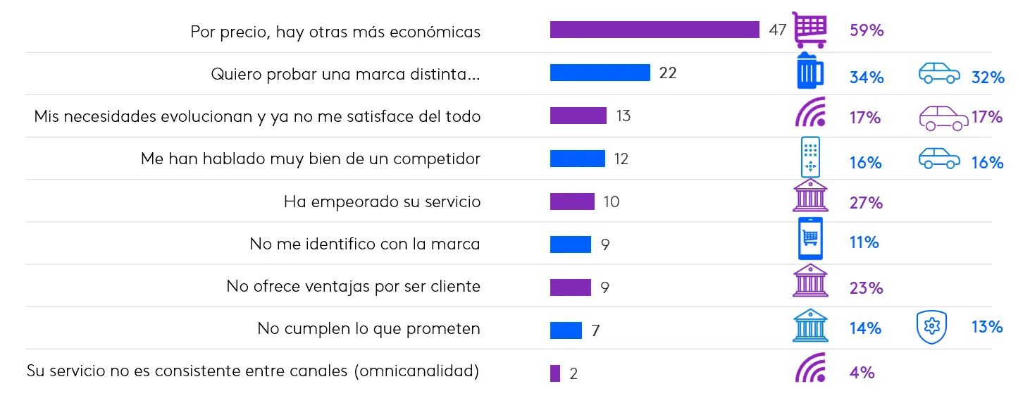 El precio el principal motivo para el cambio, mencionado por una media del 47% de los consumidores. Es especialmente relevante en categorías como supermercados, aseguradoras, energéticas y proveedores de internet. La novedad y el deseo de probar una marca distinta (22%) también juegan un papel fundamental, especialmente en las categorías de bebidas y coches. Otros motivos para el cambio son satisfacer nuevas necesidades (13%) y el boca a boca, mencionado por el 12% de los consumidores.