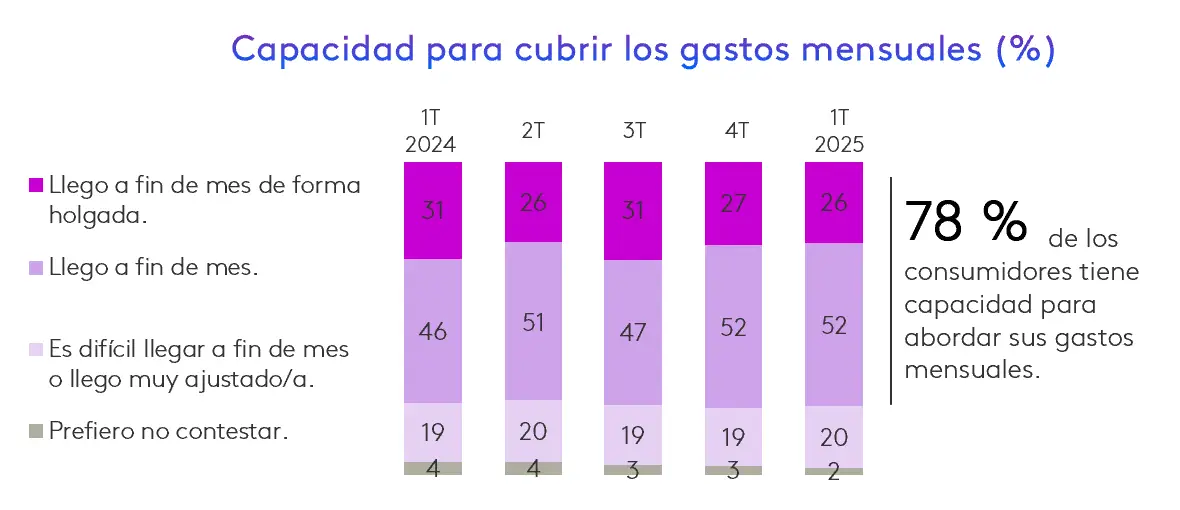La capacidad de los hogares para cubrir sus gastos mensuales se ha mantenido estable, con un 78% de los consumidores que mencionan llegar a fin de mes. Sin embargo, continúa existiendo una cifra constante de consumidores, en torno al 20%, para los que es difícil llegar a fin de mes o llegan de forma muy ajustada.