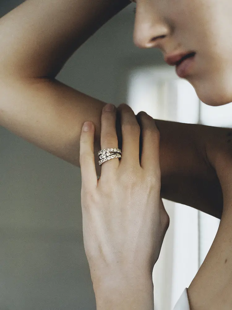 Más allá de los anillos, 4EVER IS 4EVER se abre a nuevas tipologías de producto como casquetes, chokers, pulseras y collares elaborados en tela con cristales o perlas, además de pendientes y collares pensados para completar el look en el día más especial. Estas piezas han sido desarrolladas en colaboración con el diseñador Betto García, cuyo conocimiento técnico y experiencia de taller han sido clave para trabajar estas nuevas materialidades, aportando soluciones artesanales y constructivas que amplían el universo de compromiso de Aristocrazy sin perder su sello estético y espíritu aspiracional.