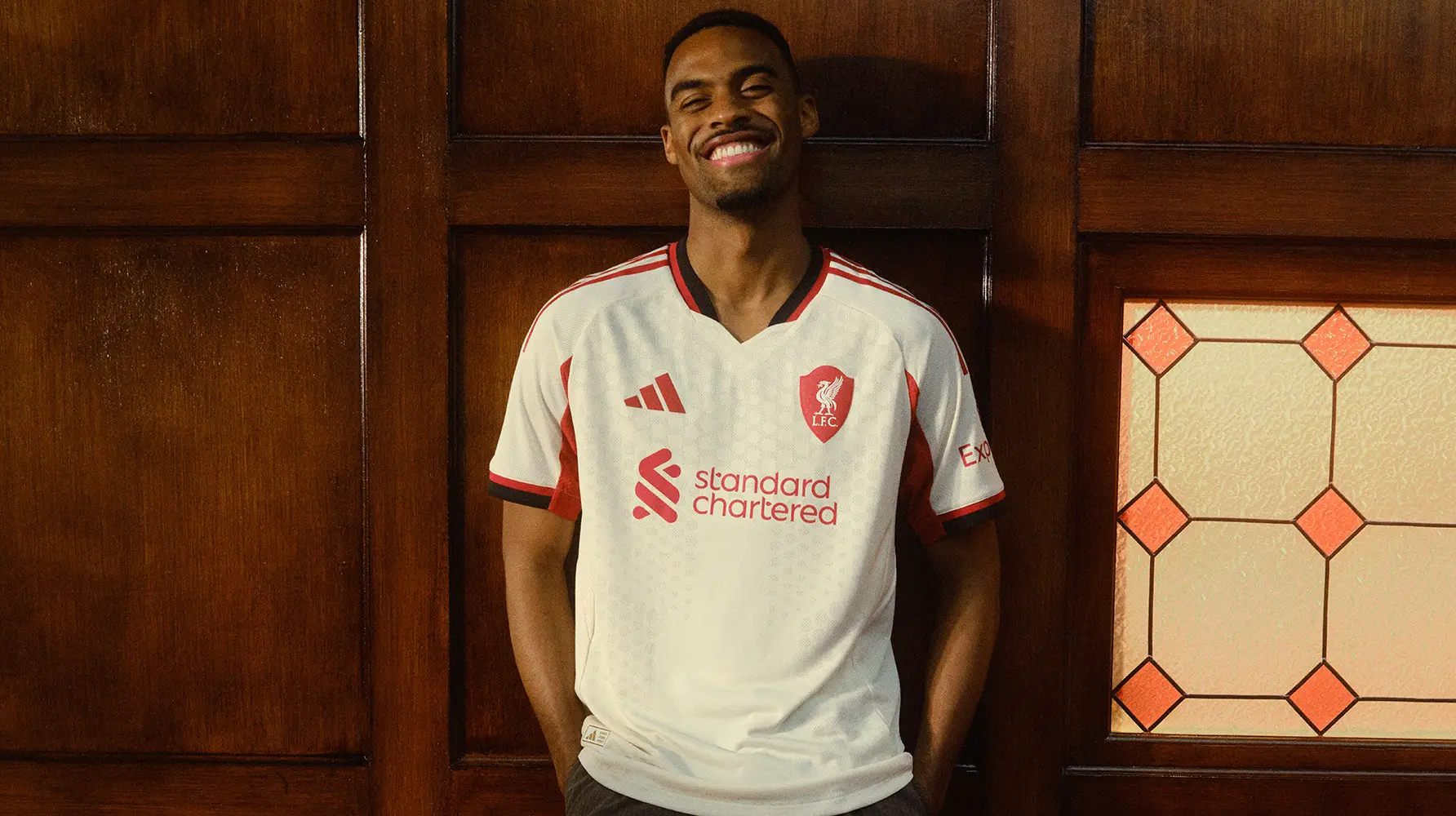 La camiseta visitante, por su parte, se presenta en un tono crema roto con detalles en negro y rojo, una paleta de colores que evoca históricas equipaciones del club. El escudo del Liver Bird aparece esta vez dentro de un escudo estilizado, cuyo contorno está inspirado en la forma de la grada principal original del estadio de Anfield, construida en 1906.