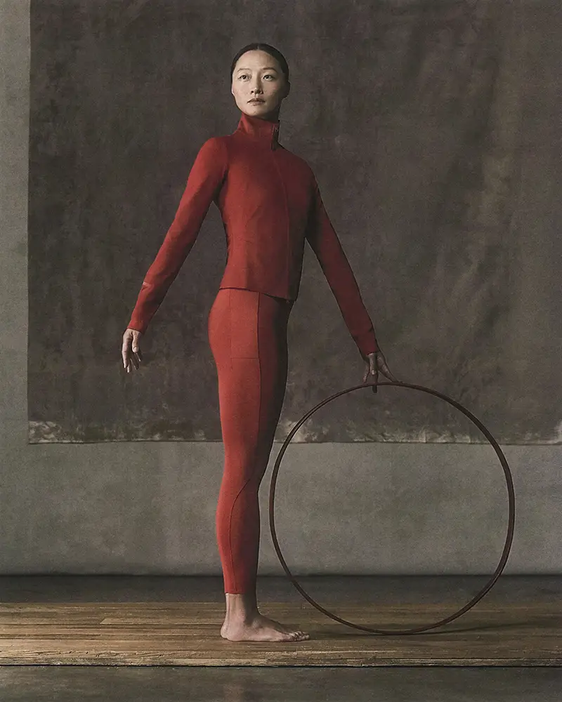 Cada prenda ha sido concebida como parte de un conjunto versátil, diseñado para mezclarse y adaptarse, fiel al principio creativo de Entire Studios. El cuidado por el detalle se refleja también en la paleta cromática: tonos neutros y apagados que remiten a la estética característica de la firma angelina, complementados con un intenso color granate que evoca energía, ritmo y potencia de movimiento.