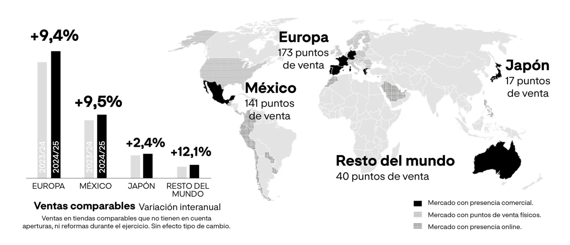 Las ventas comparables de Adolfo Domínguez crecen en moneda local en todos los países en los que opera, con aumentos del 9,4% en Europa, 9,5% en México, 2,4% en Japón y del 12,1% en el resto de los mercados en los que está presente.