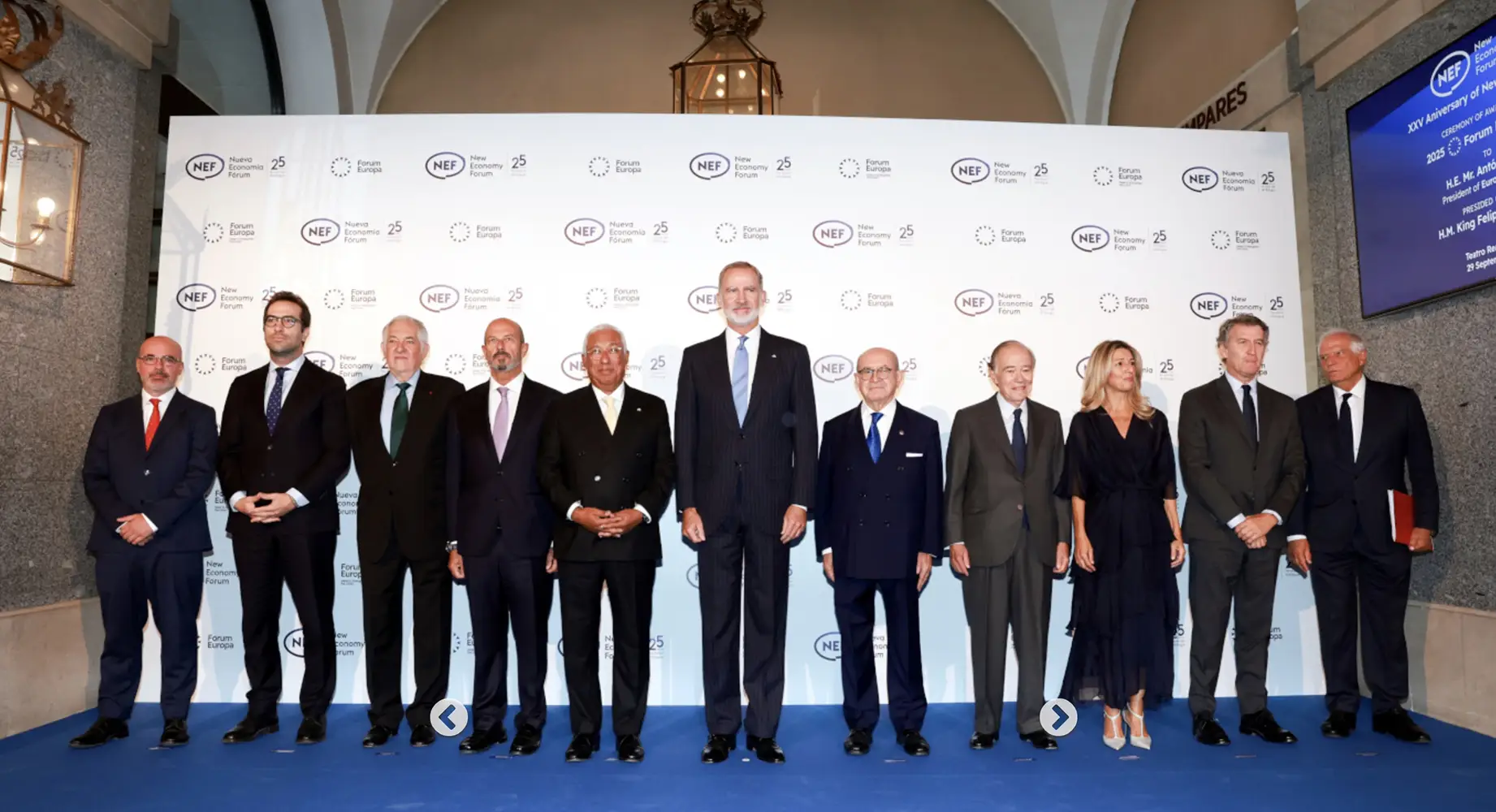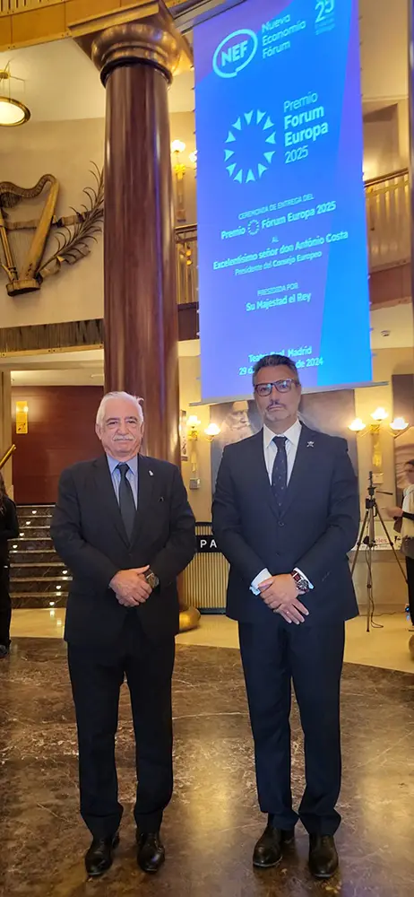 El presidente de la Asociación de Empresas Cincuentenarias y de Prestigio de la Comunidad de Madrid Don Luis Guichot y el secretario general Don Rafael Salvador asistieron la semana pasada como invitados expresamente con confirmación de asistencia al XXV Aniversario de Nueva Economía Fórum Europa. El evento, que presidió su majestad el Rey Don Felipe VI el día 25 de septiembre hizo entrega del premio Fórum Europa 2025 a Don Antonio Costa, presidente del Consejo Europeo, en el Teatro Real de Madrid.