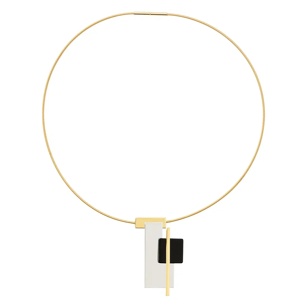 Este conjunto incluye collar, broche, pendientes y anillo, realizados en plata de ley de 925 milésimas chapada en oro de 18 quilates, combinada con láminas de ónix. El collar incorpora además una cadena de acero galvanizado, reforzando el carácter geométrico y constructivista de la colección, en sintonía con el lenguaje visual de Lissitzky.