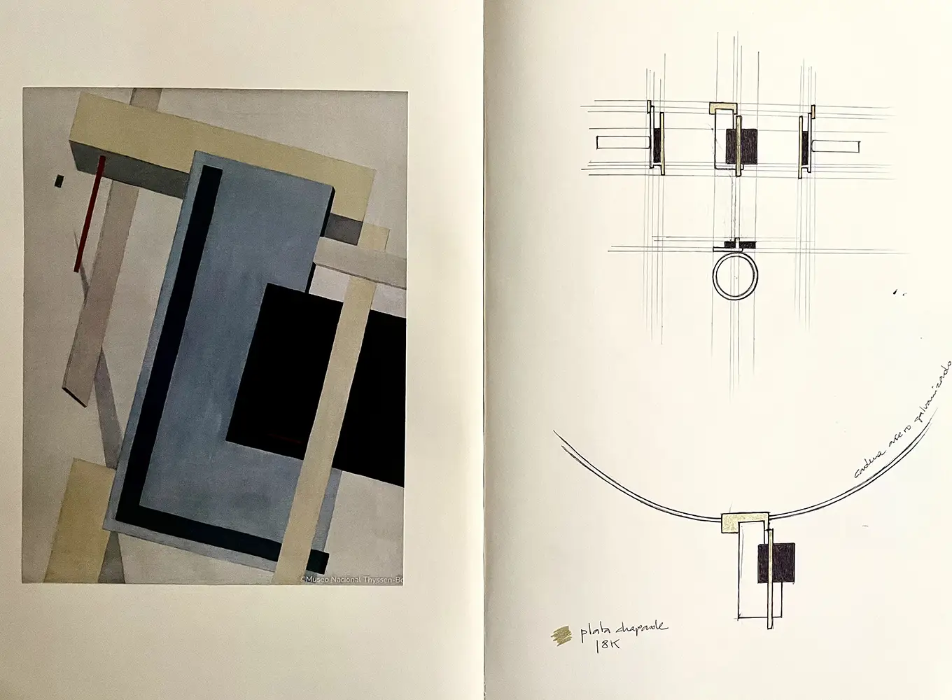 Actualmente, la tienda del Museo Thyssen ofrece dos conjuntos de joyas diseñados por Belén Bajo, concebidos como extensiones contemporáneas de obras icónicas de la historia del arte. El primero de ellos está inspirado en “PROUN 4B” de El Lissitzky, figura clave de las vanguardias del siglo XX y referente del suprematismo, el diseño gráfico y la arquitectura.