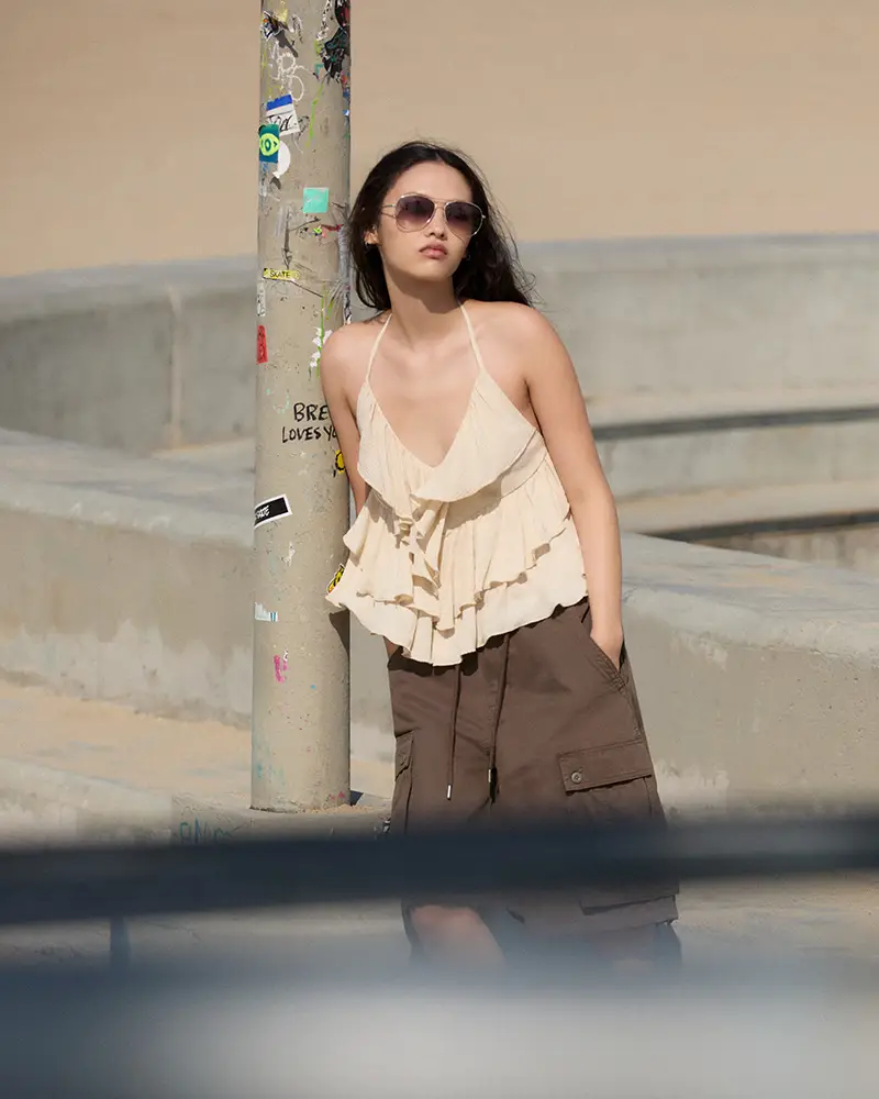 La propuesta femenina es una combinación entre el boho más romántico—con volantes, tejidos ligeros y detalles artesanales—y el universo callejero de los 2000: bermudas cargo, baggy jeans, gorras y camisetas con fit relajado. Una mezcla intuitiva, un poco desordenada y, por eso mismo, completamente actual. El resultado es una silueta fluida que canaliza a esa chica entre street poet y underground muse.