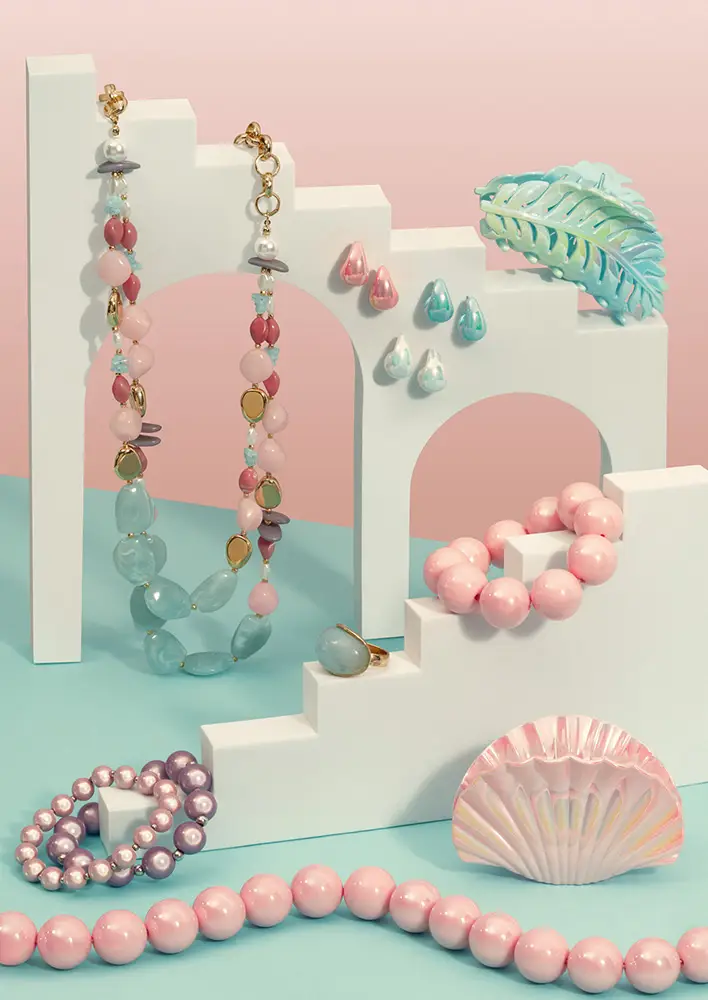 La inspiración para los Pool Pastels más cool fueron las piscinas que brillan en distintos matices de azul y turquesa. Las cadenas de bolas grandes y ajustadas brillan misteriosamente. Combina a la perfección pulseras de esferas en delicado rosa o vainilla. Los pendientes en forma de gota son refrescantes. Sujetamos el pelo únicamente con pinzas adorables, como las versiones de delfín o mariposa. Las cintas para el pelo en tonos pastel están muy de moda.