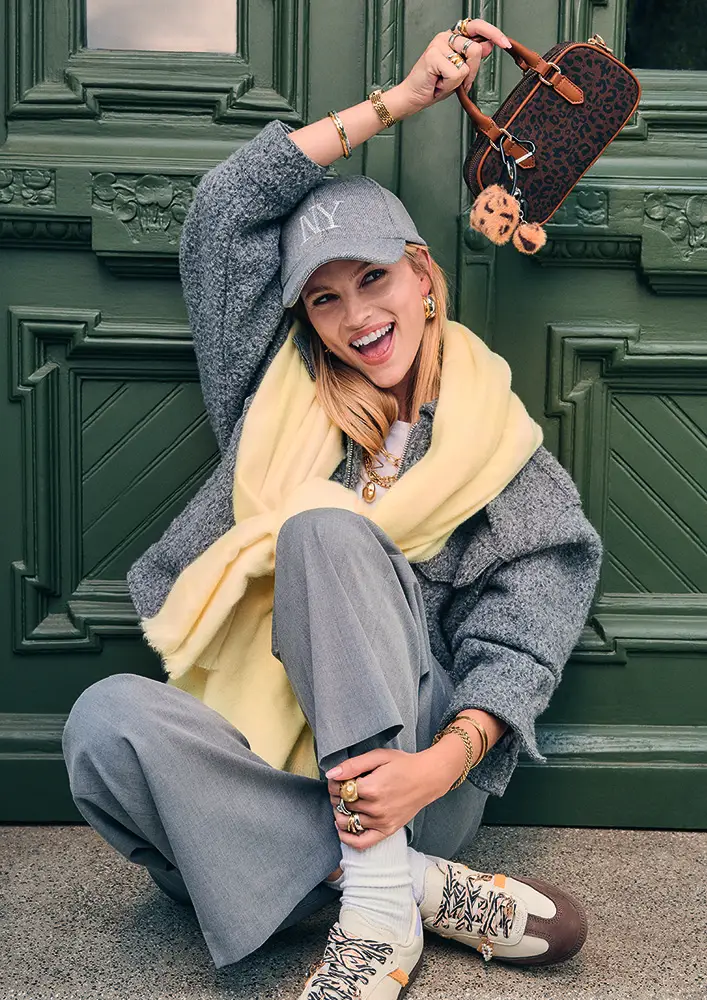 El cómodo sombrero de pescador con estampado de leopardo atrae todas las miradas. La bisutería, ya sea plateada o dorada, apuesta claramente por el chunky style y el diseño de leopardo. Las piezas de moda combinan a la perfección con complementos lisos en gris y amarillo. Las bufandas, el gorro y el bolso de cuero sintético negro con detalles de suave leopardo convierten el paseo otoñal en una pasarela.