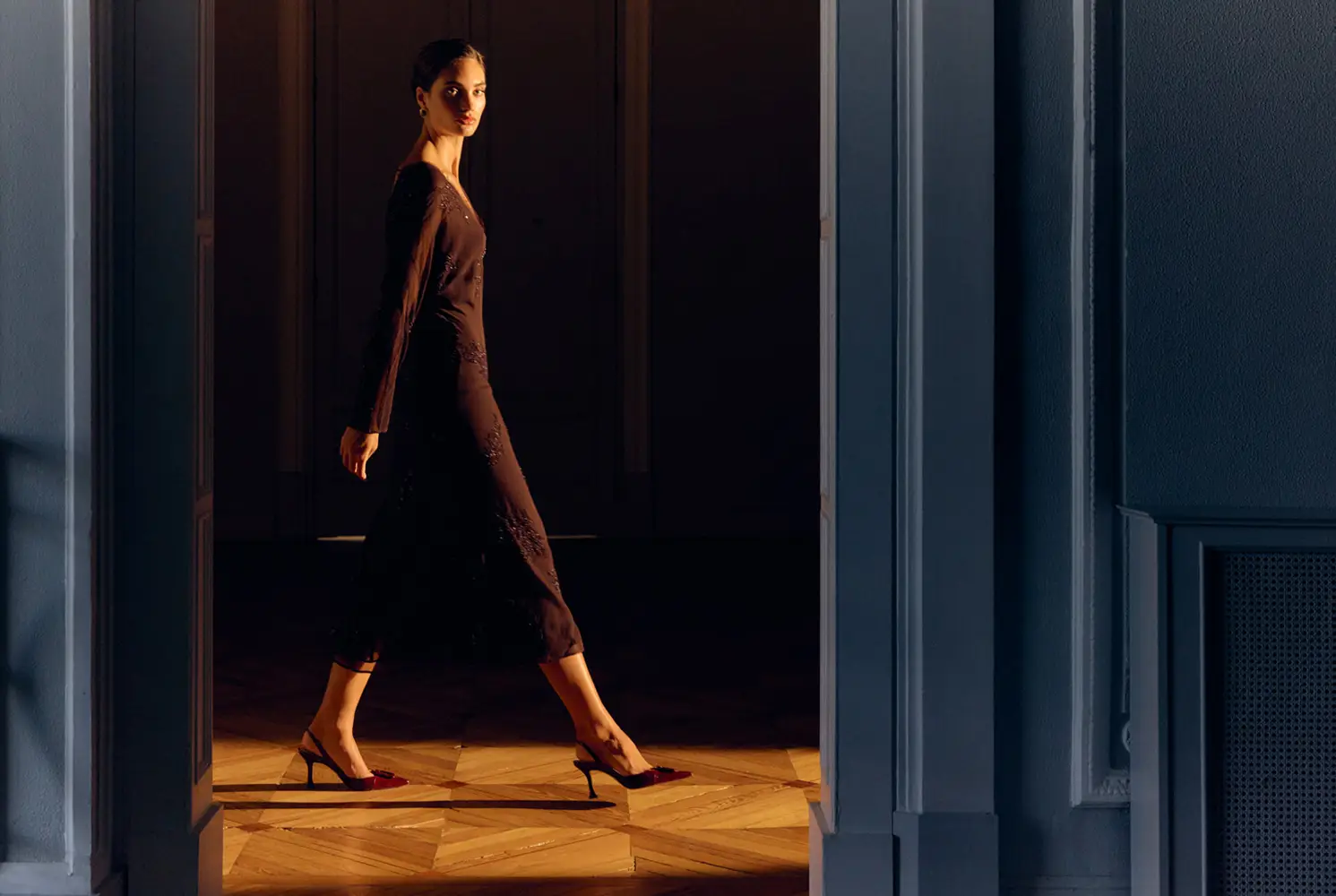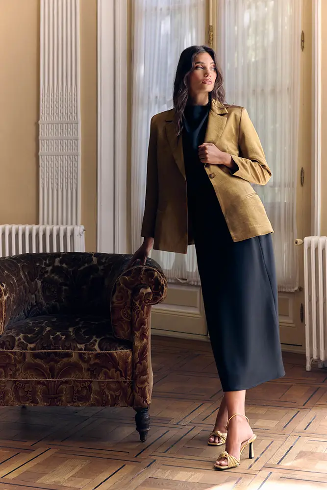 Pensada para los eventos de la temporada, la colección combina tejidos satinados, terciopelos y lentejuelas que se entrelazan en siluetas que reflejan la luz en cada movimiento. Los trajes reinterpretan estructuras de sastrería clásica con líneas elevadas y proporciones contemporáneas, mientras que los vestidos revelan una feminidad natural a través de cortes precisos y fluidos. Unos diseños para celebrar el invierno con sofisticación.