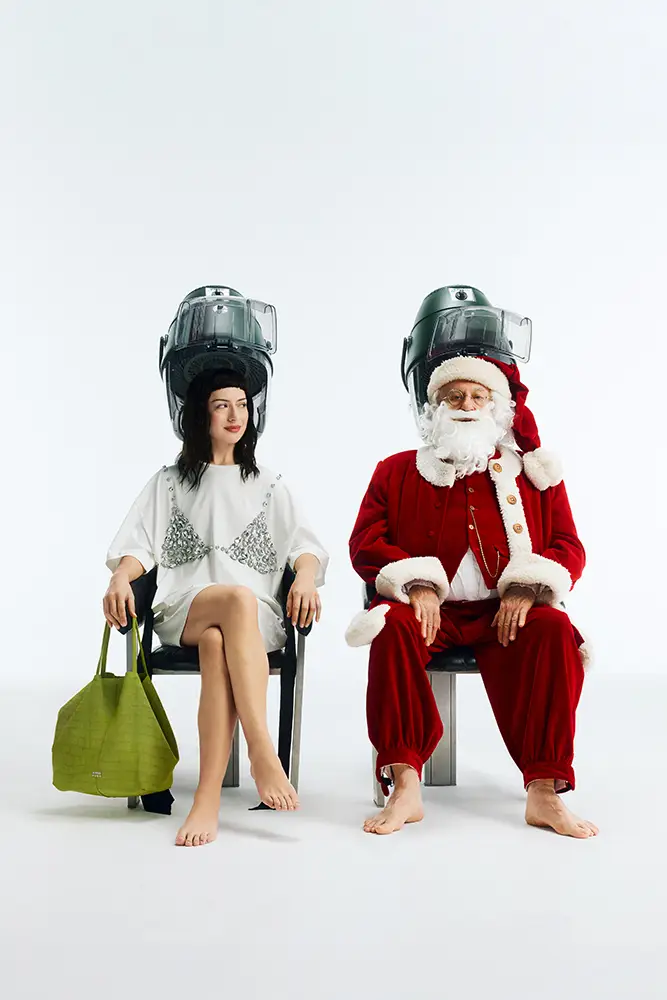 Siguiendo la estela de iconos como Rossy de Palma y Pamela Anderson, Bottle se zambulle en escenas tan ingeniosas como estéticas: una sesión de spinning con vestido de pelo tan suave como la nieve; un peinado XXL en forma de abeto junto a un jersey rojo —un guiño cool al Rockin’ Around the Christmas Tree— o incluso una visita a la peluquería de Papá Noel, luciendo un vestido-camiseta con bra “joya” integrado en trampantojo.