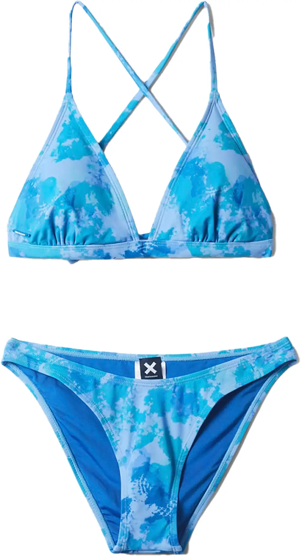 Lucía es reconocida por su destacada trayectoria en el surf competitivo donde ha sido dos veces campeona de España en categoría absoluta. En los últimos años, Lucía se ha enfocado en proyectos que la sacan de su zona de confort y le permiten explorar nuevas facetas del surf. Su propuesta con Blue Banana consta de un bikini estampado en tono azul con forma de triángulo y parte inferior de corte clásico junto a una camisa de manga corta de 100% rayón y cuello camp.