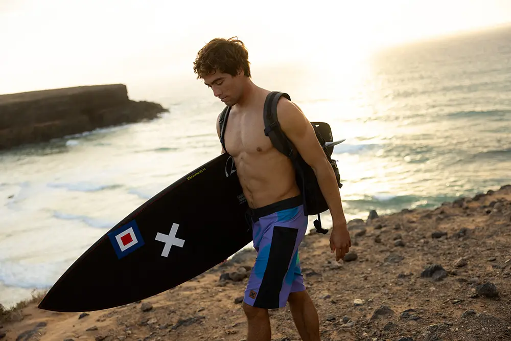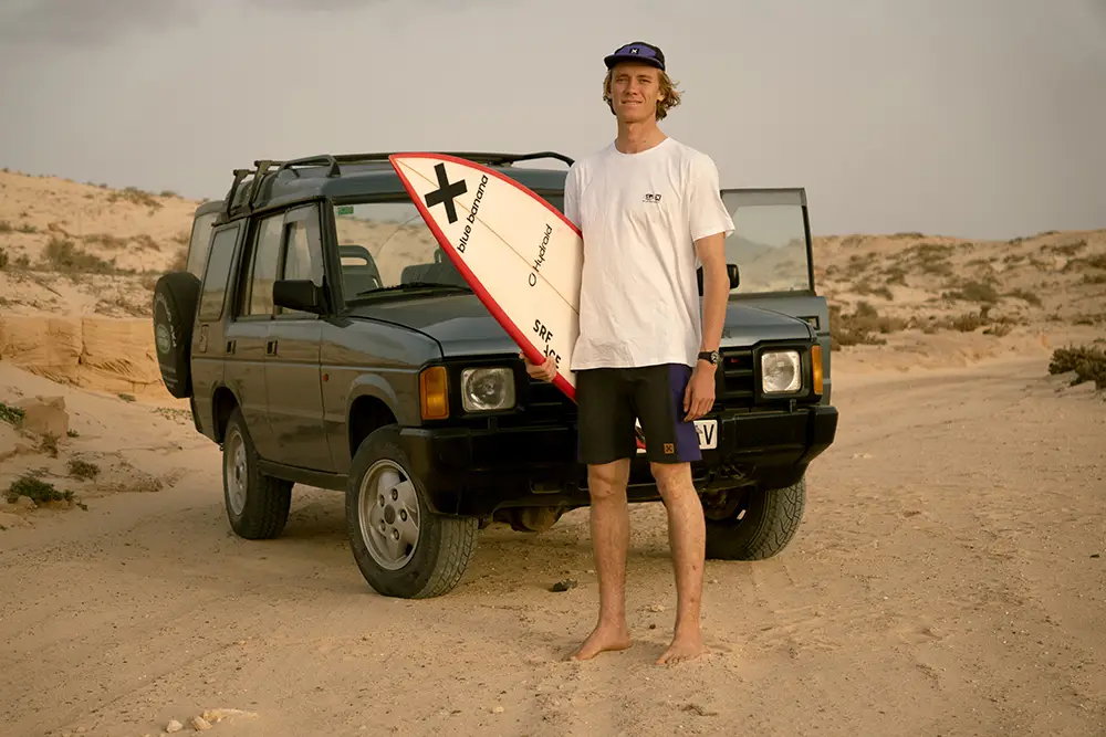 Nacido en Fuerteventura en 2003, desde pequeño moldeó su estilo técnico y valiente. Dos veces campeón de Canarias en categorías junior y campeón de España por selecciones autonómicas con el equipo canario, en 2025 sufrió tres lesiones consecutivas que limitaron su tiempo en el agua y representaron un gran reto mental. Con una actitud resiliente y una conexión profunda con el océano, Tim Elter continúa su camino hacia la élite del surf mundial. Su colección con la firma de ropa está compuesta de un bañador de poliéster reciclado de paneles laterales a contraste, cintura fija, cierre con cordón y bolsillo lateral; junto con una gorra de algodón orgánico de panel frontal y vibeado a contraste con visera recta.