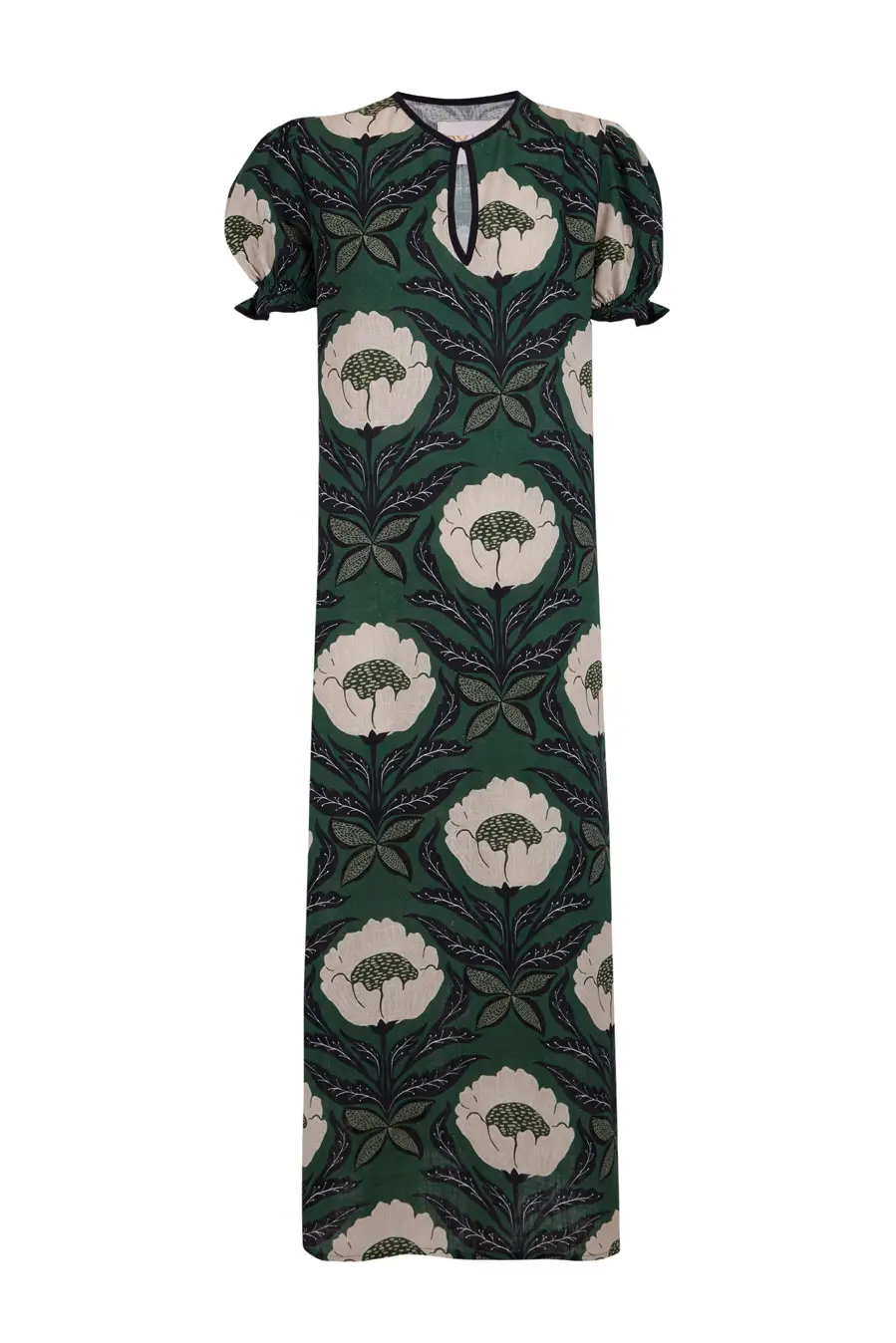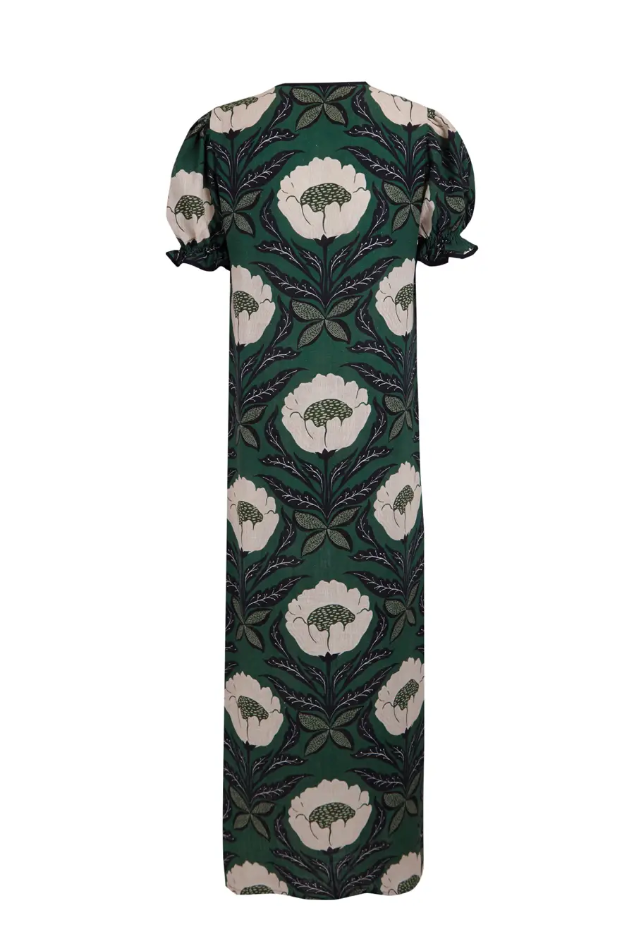 El vestido Lago deslumbra con un delicado estampado floral en tonos verdes y flores blancas, evocando la frescura y ligereza de la temporada. Combinado con unas sandalias planas, se convierte en la opción ideal para un look sofisticado y único.