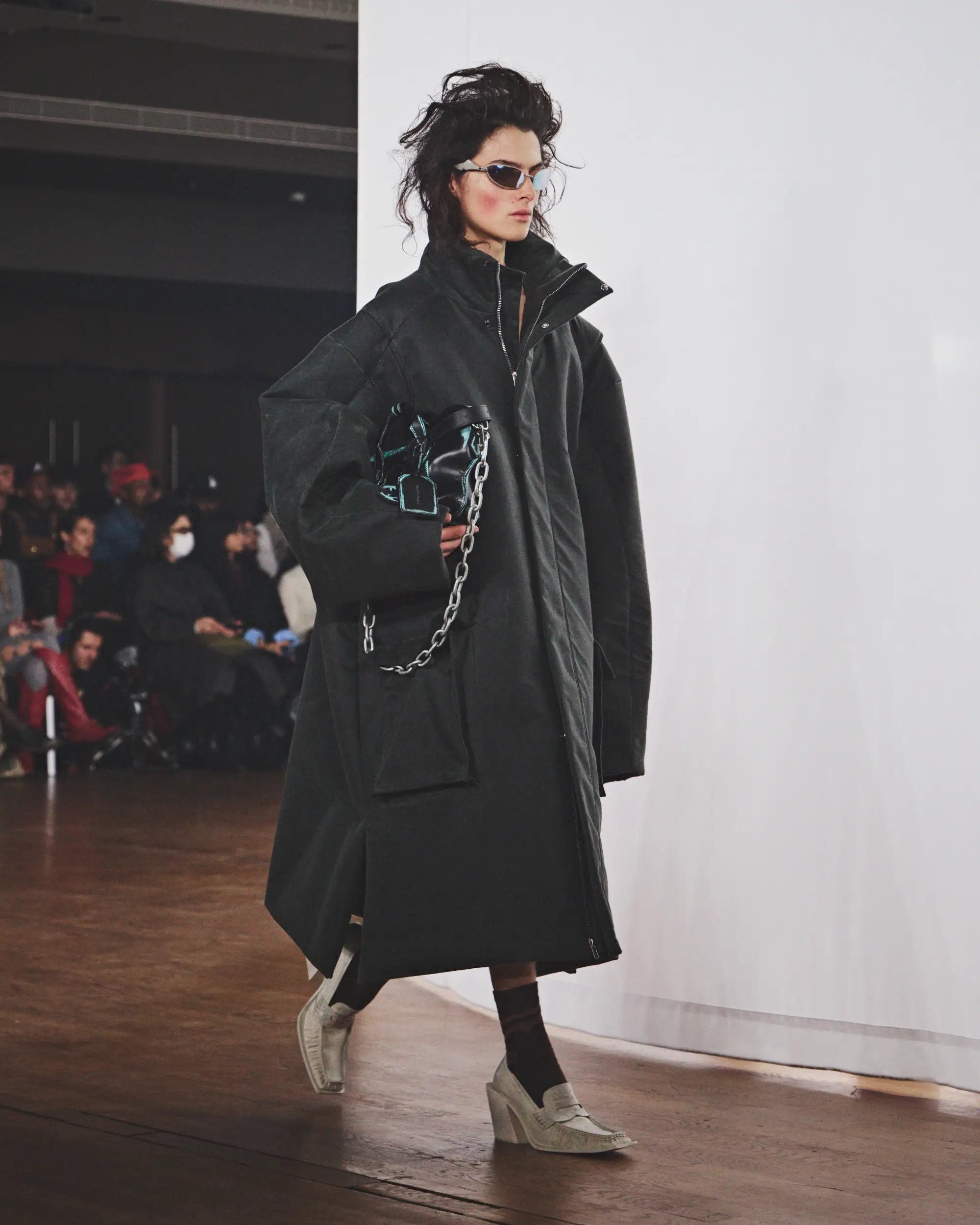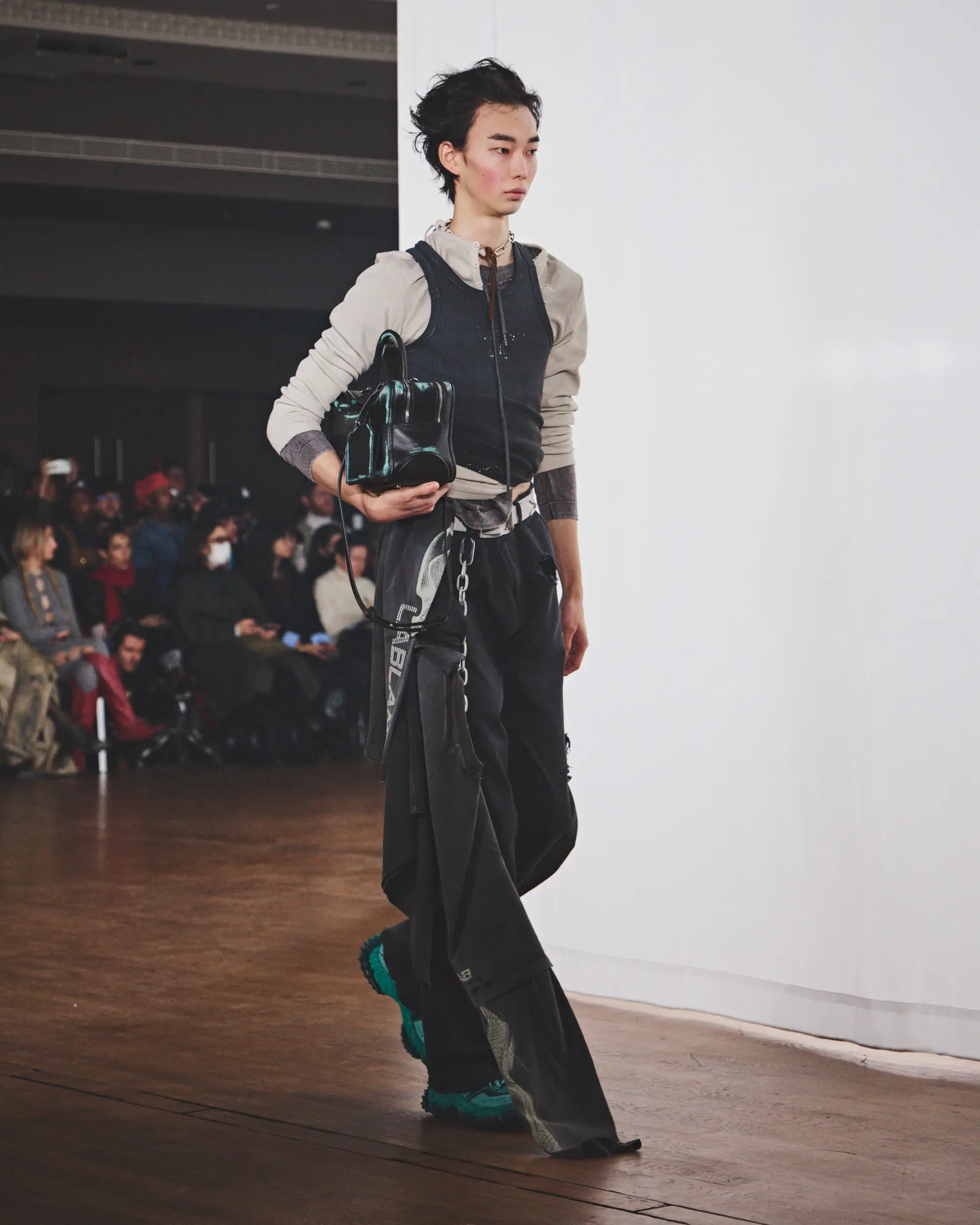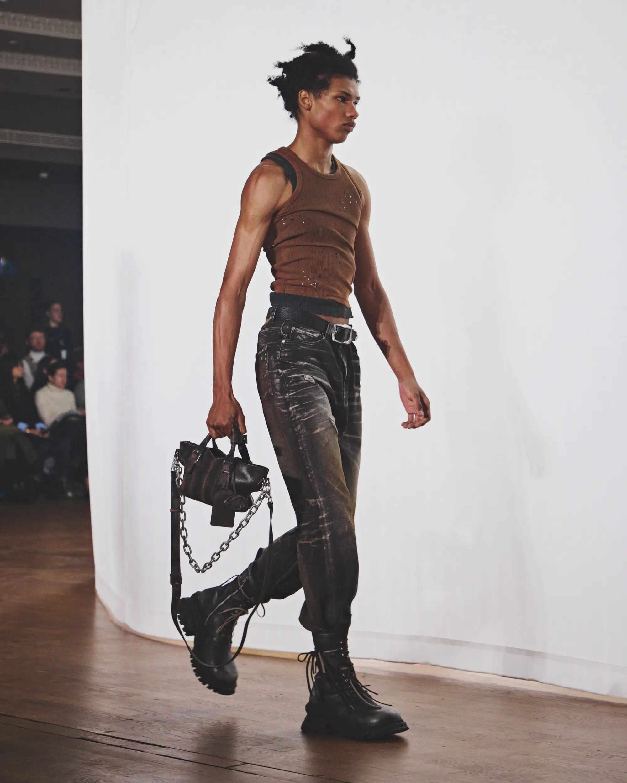 El desolado viaje se ve reforzado por un paisaje sonoro original compuesto por Pandora’s Jukebox, que intensifica la sensación de frío y aislamiento. El desfile concluye con una cruda y sobrecogedora actuación en directo de Annahstasia (Enuke), cuya voz oscura e hipnótica acompaña la salida de los personajes del escenario.