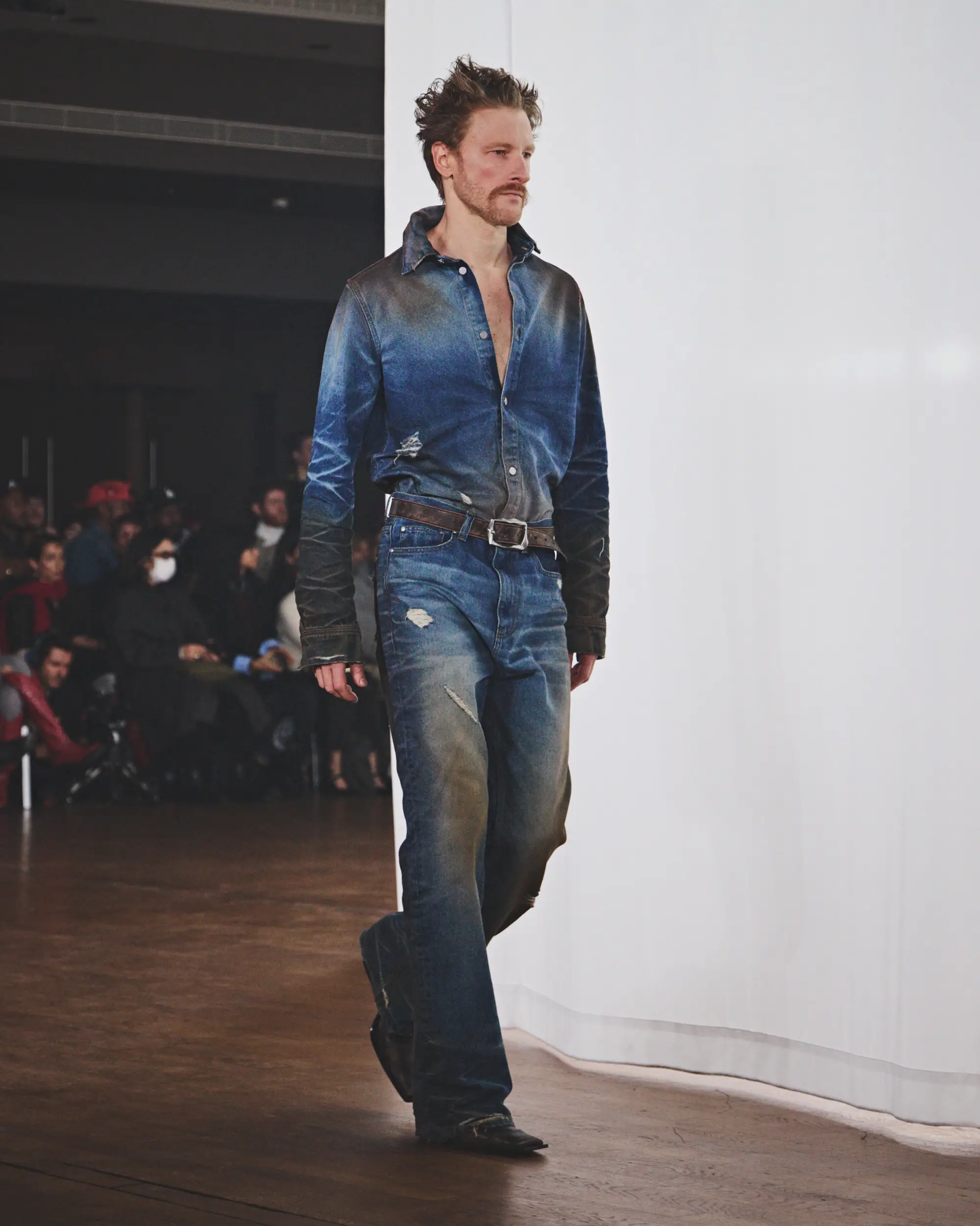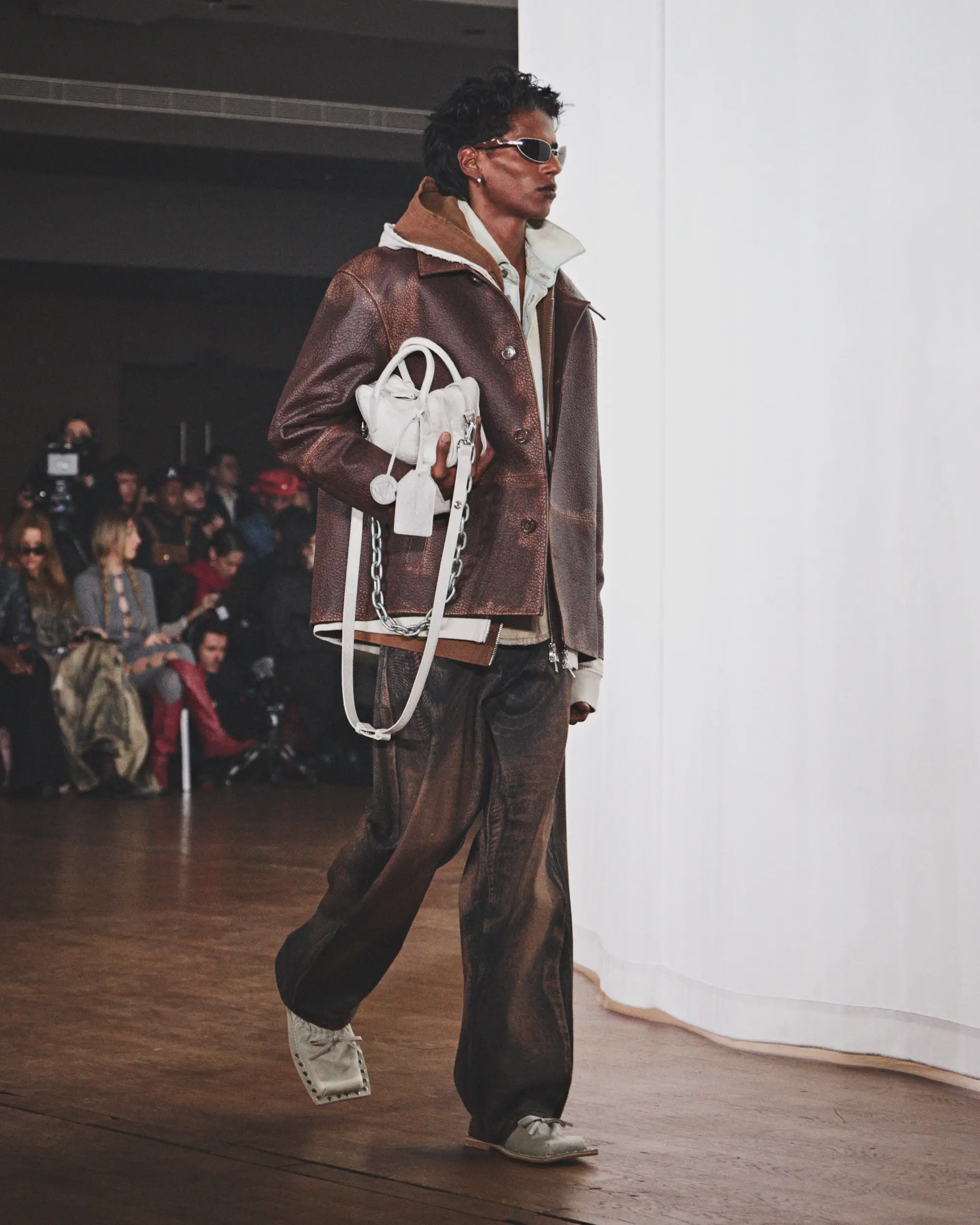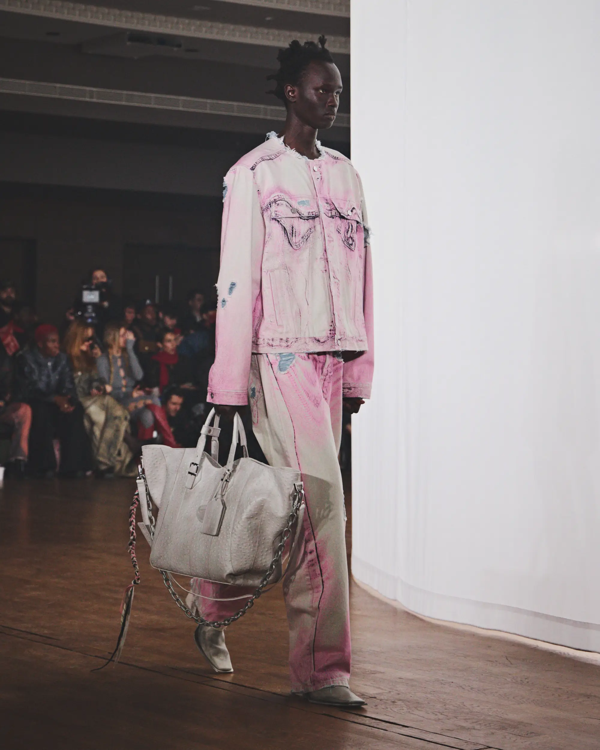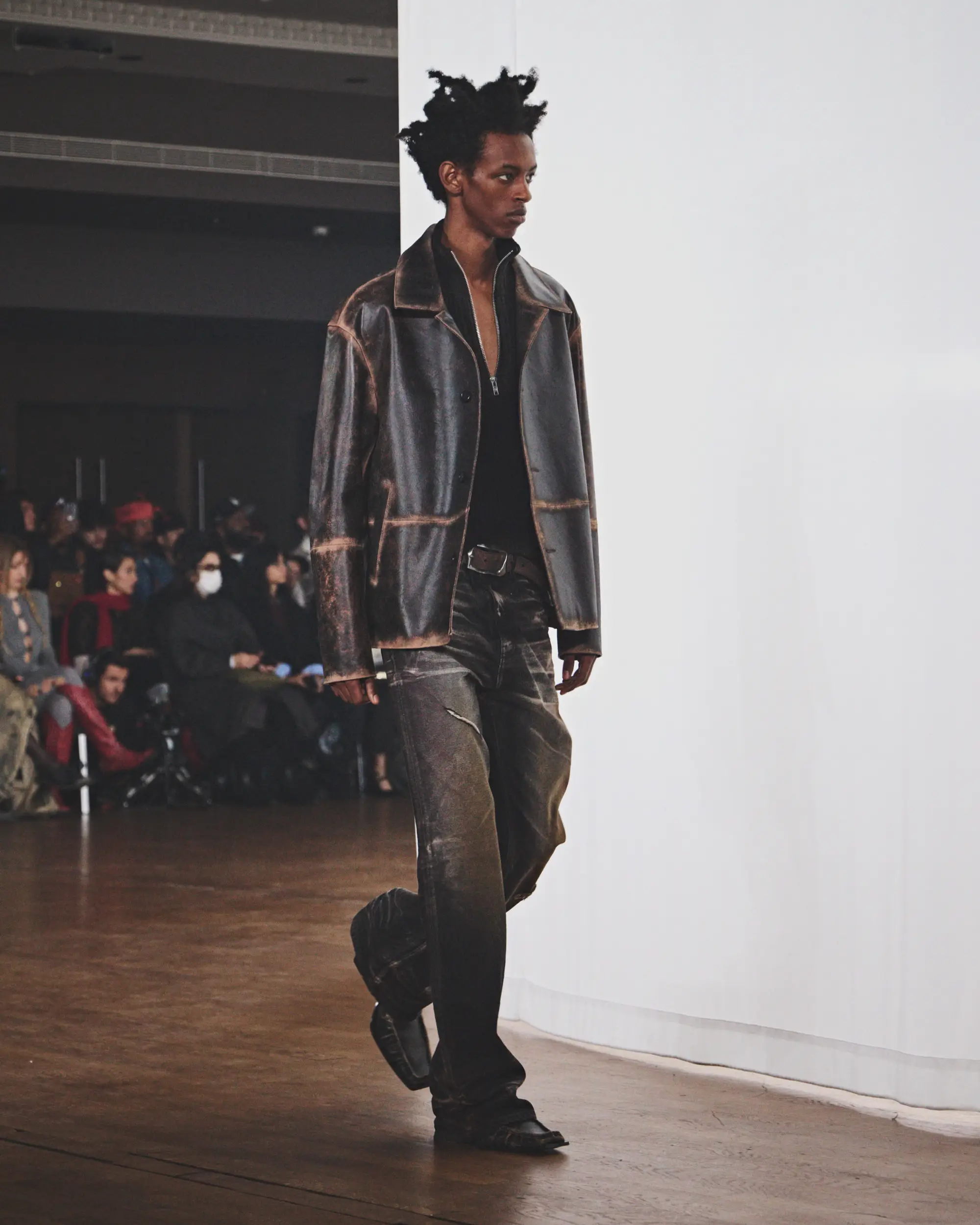 Las siluetas oscilan entre lo compacto y lo amplio, con acabados erosionados y una amplia gama de tratamientos y lavados. El resultado es una colección profundamente personal que, sin embargo, mantiene una armonía casi fortuita. La paleta cromática se articula en torno a tonos fríos y gastados de marrón, blanco, gris y azul claro, realzados por toques de rosa y petróleo inspirados en las auroras boreales. Entre los materiales más destacados se encuentran cueros blancos envejecidos con grabado de avestruz, algodones encerados de gran peso, lanas de pelo largo, los característicos cueros cepillados y una combinación de piezas clásicas y tratadas de denim estampado CAMPERLAB.