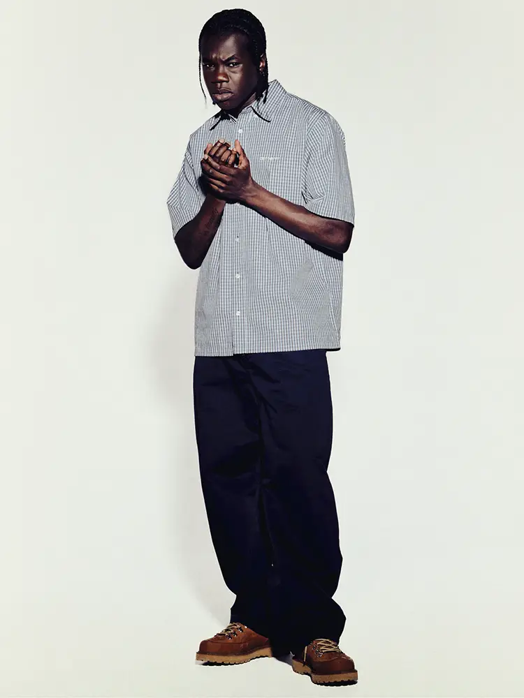 En pleno verano, la colección apuesta por siluetas holgadas en camisas de manga corta y shorts, junto a una paleta neutra de caqui y beige, ejemplificada por la Postal Jacket y el Postal Double Knee Short. El color y la textura siguen definiendo la propuesta mediante camisas de popelina con estampado integral, tejidos ligeros space-dye y estructuras de piqué.
