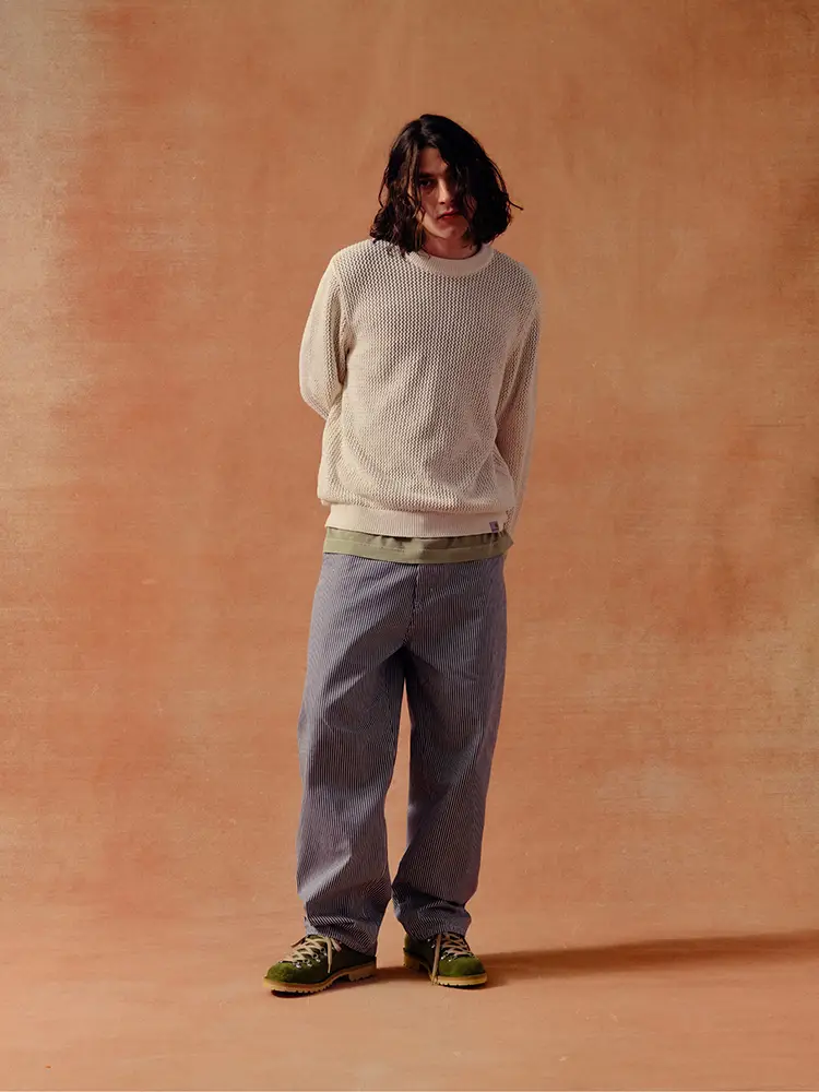 Inspirada en la pátina natural de piezas de archivo, la temporada también pone énfasis en tratamientos desgastados y lavados exclusivos, aplicados a denim de color, sarga, ripstop y algodón tipo waffle. Estas propuestas se complementan con un nuevo tejido de raya hickory blanqueada, presente en prendas como el Mercer Single Knee Pant y el Mercer Chore Coatpara mujer.