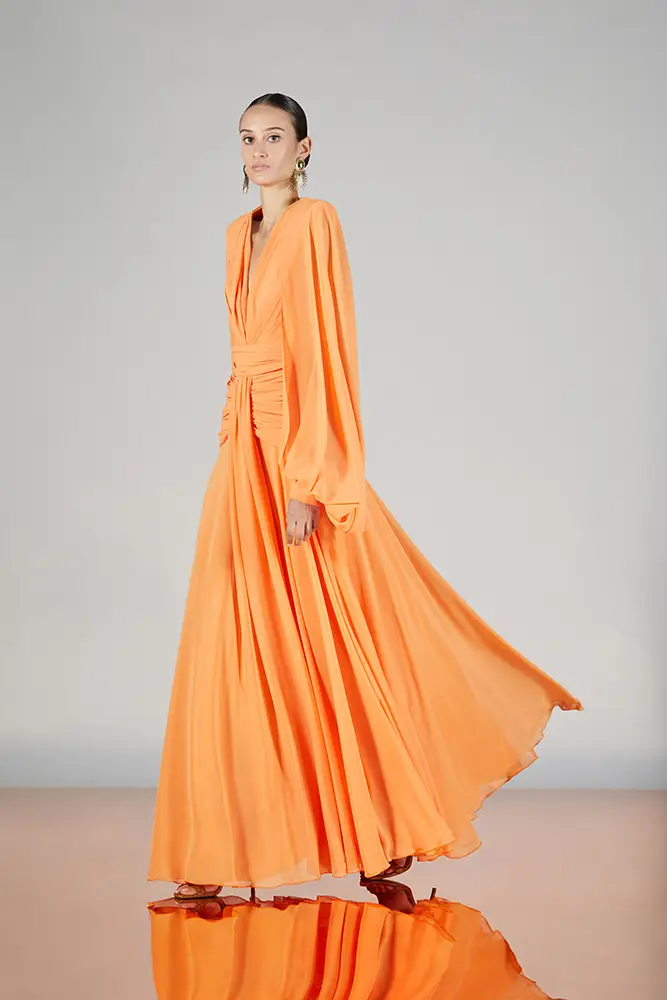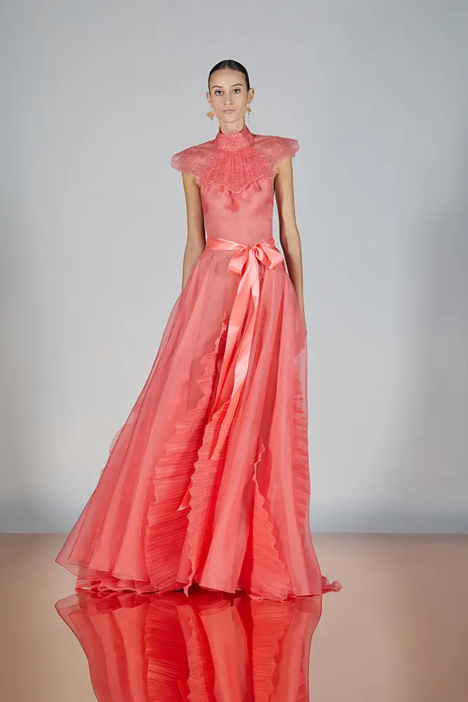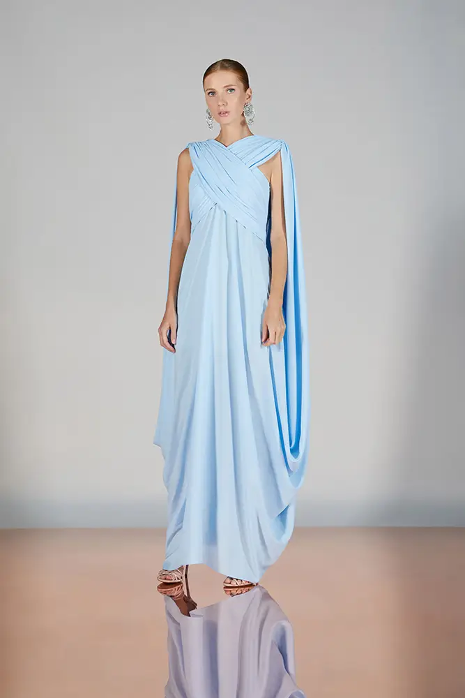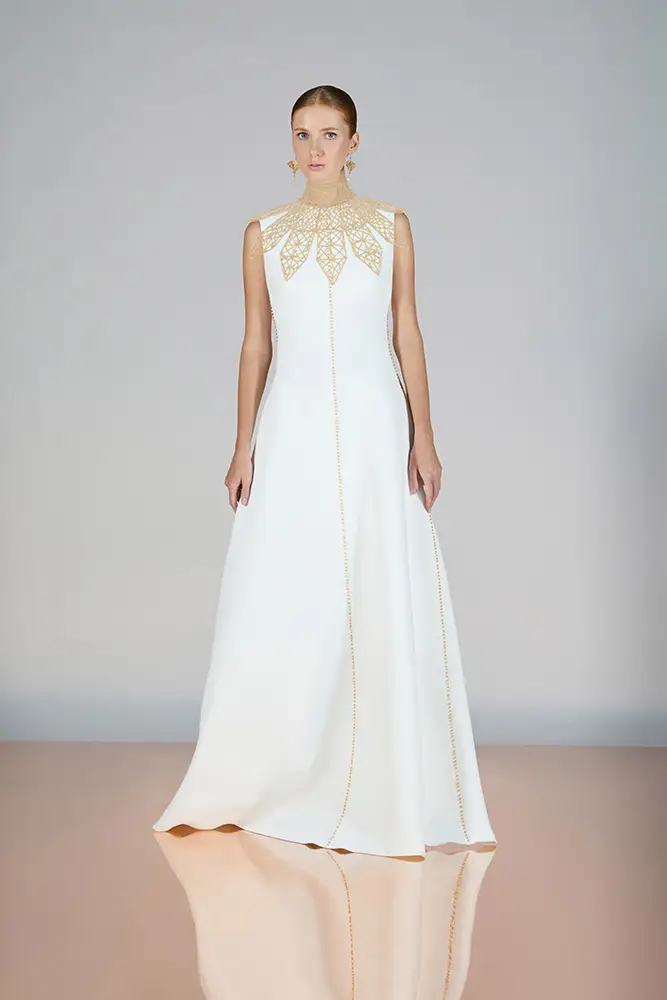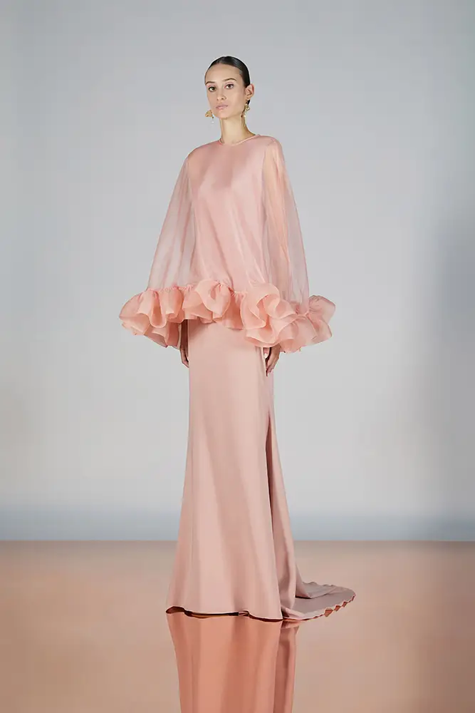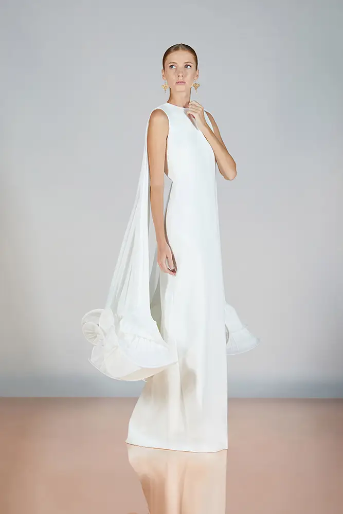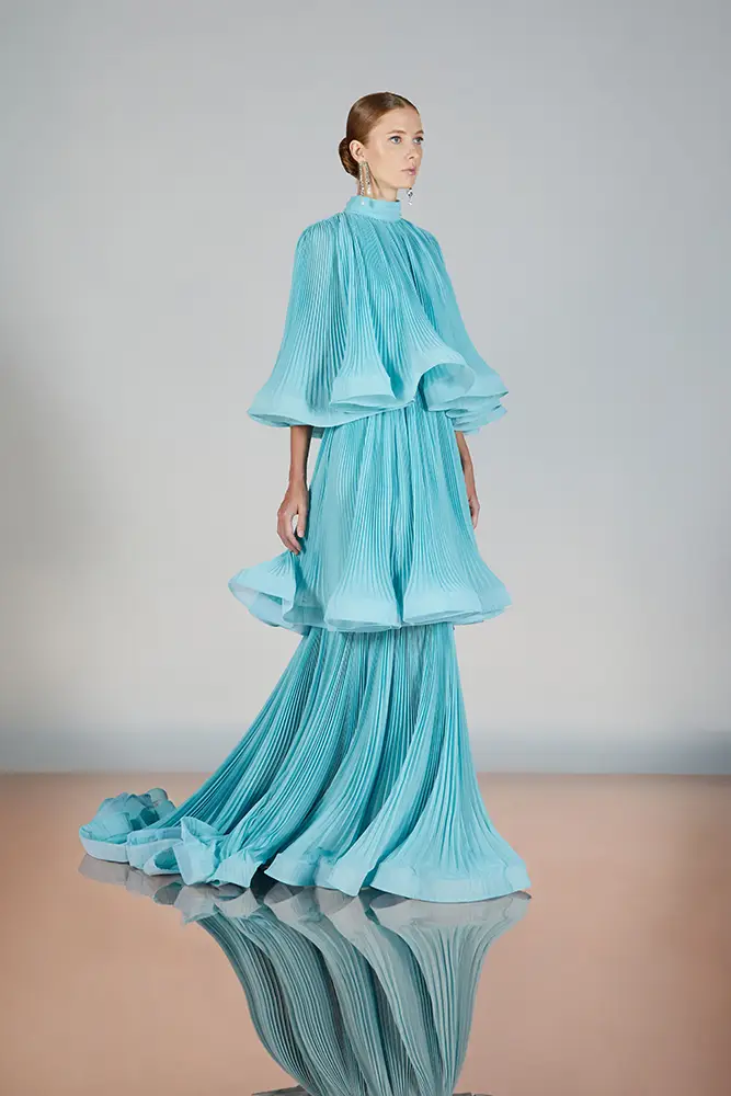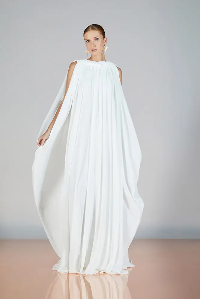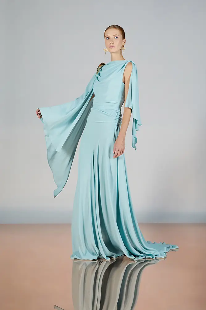 Las capas de gasa, los drapeados precisos y los detalles escultóricos aportanmovimiento y carácter sin perder funcionalidad.