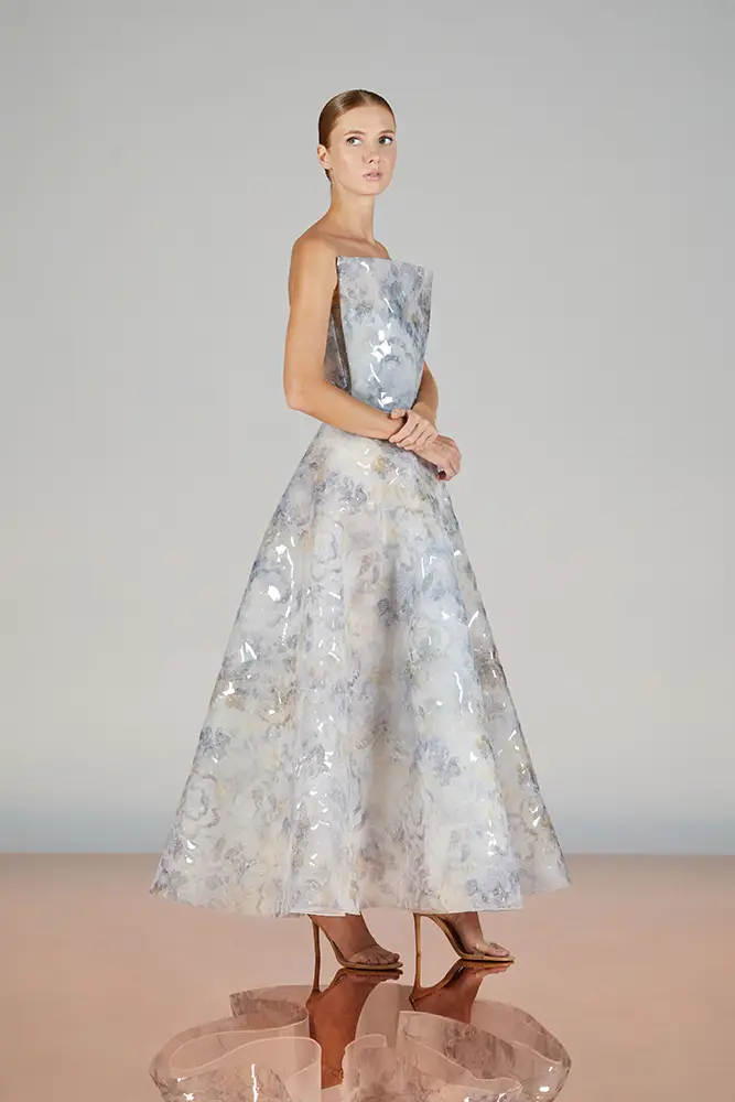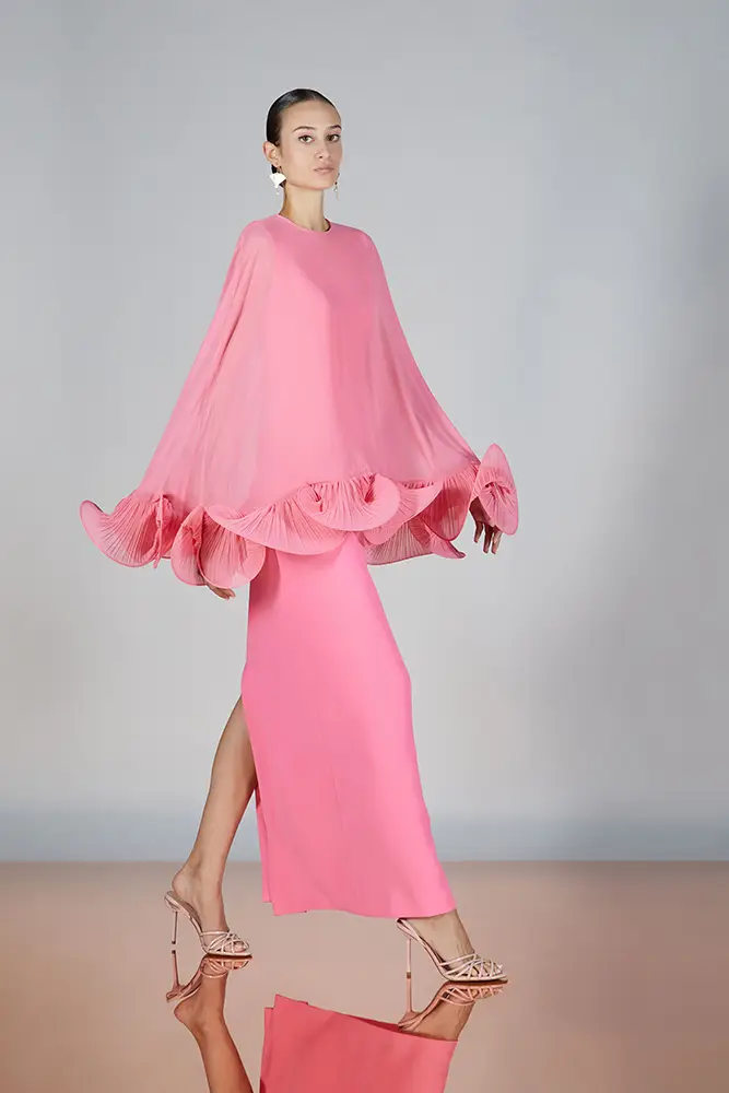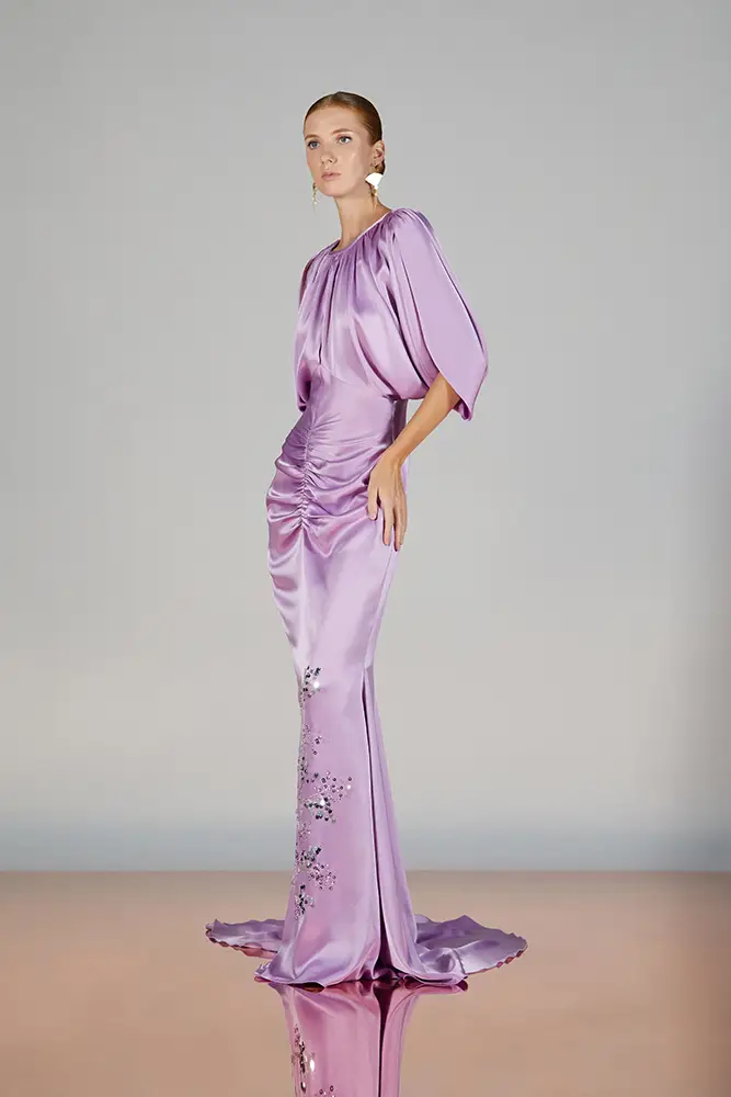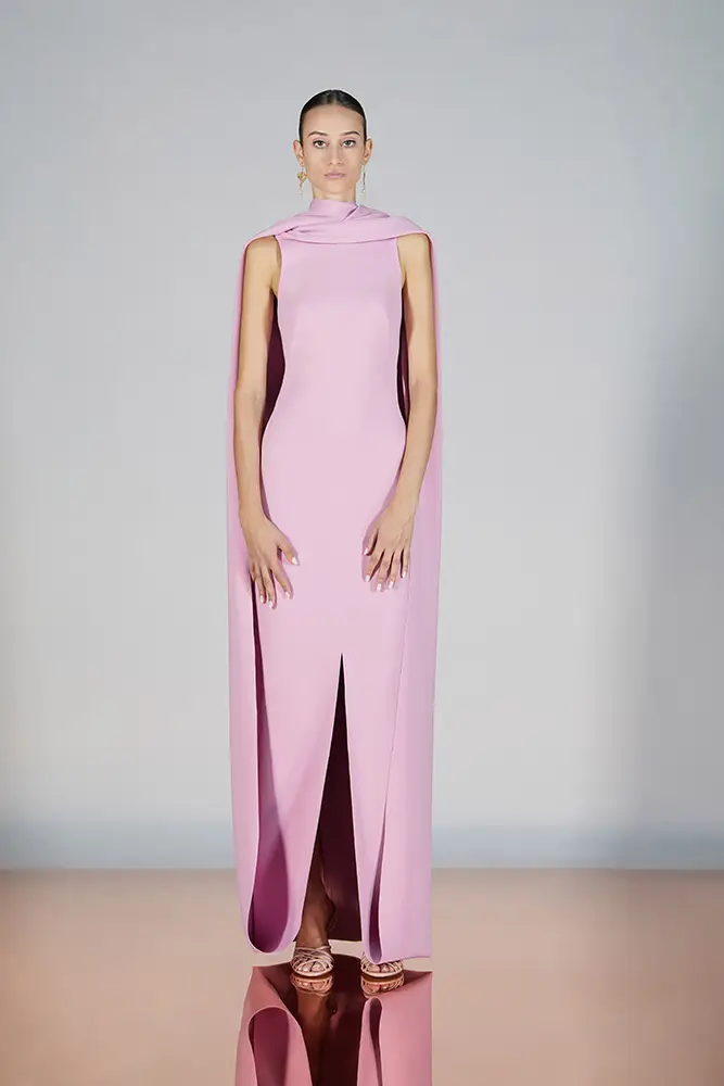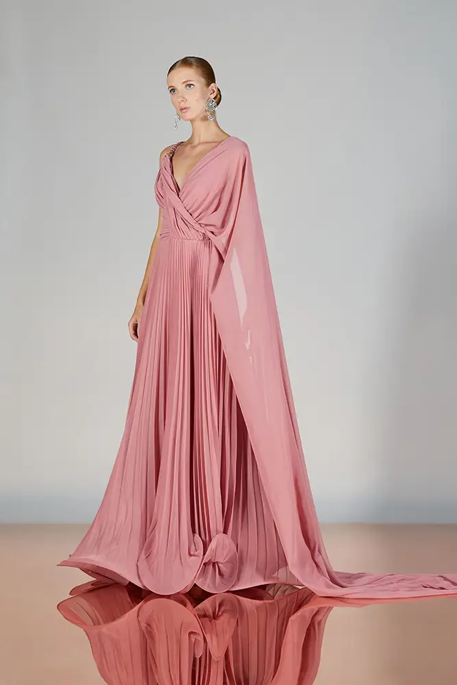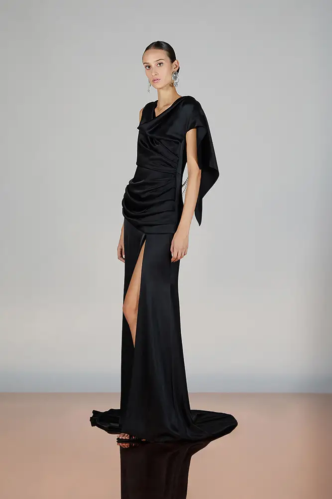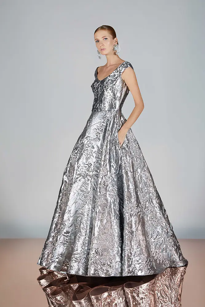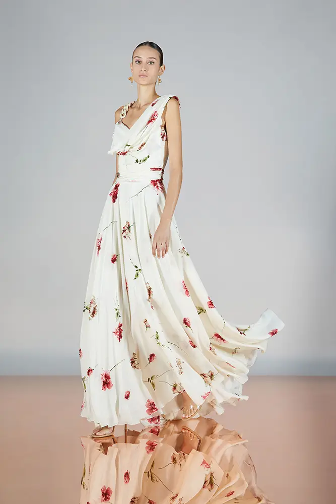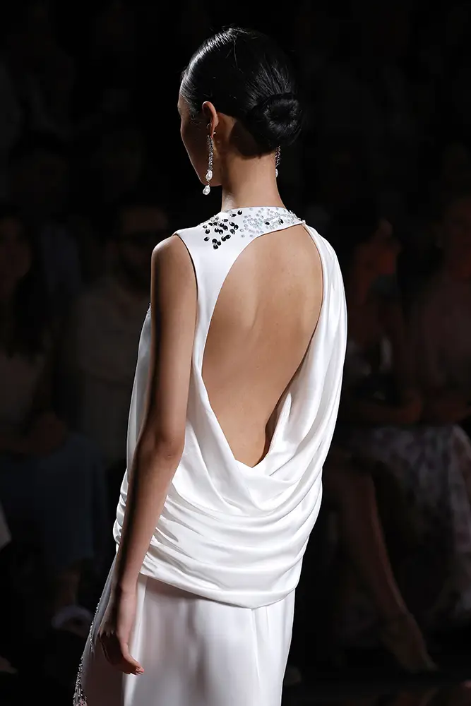 Las capas de gasa, los drapeados precisos y los detalles escultóricos aportanmovimiento y carácter sin perder funcionalidad.