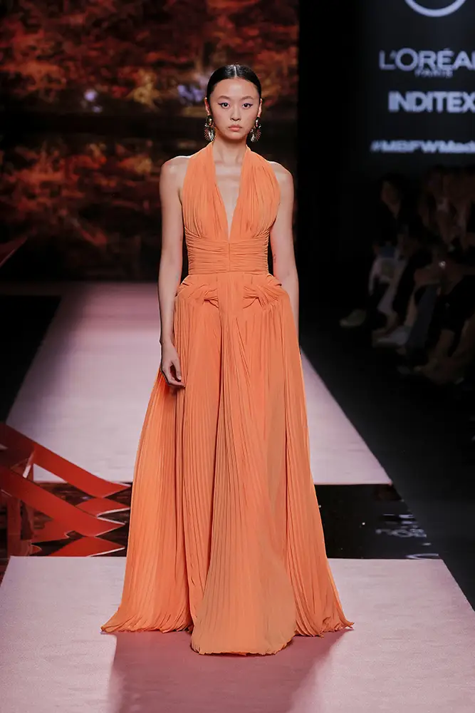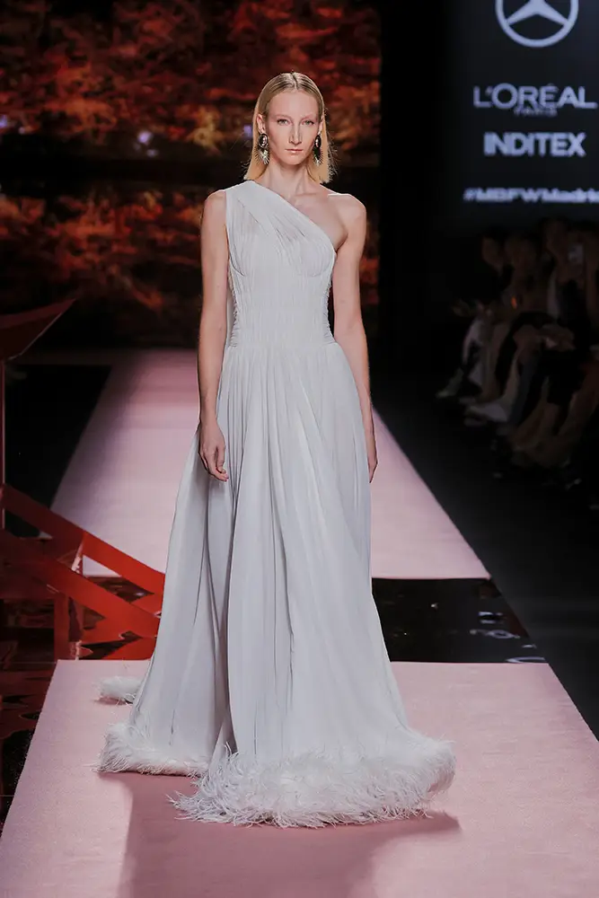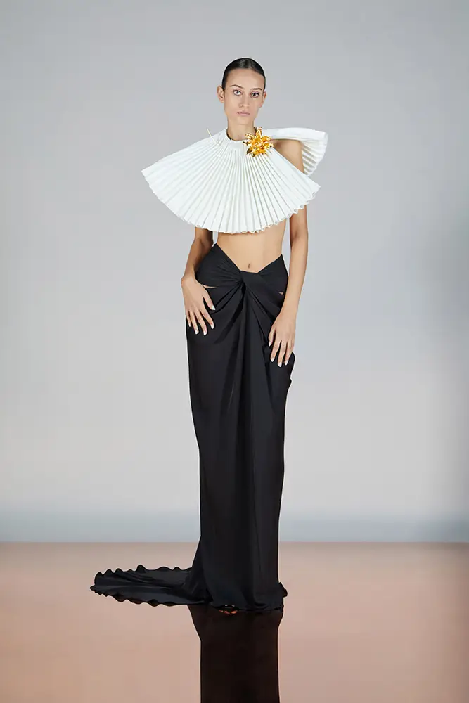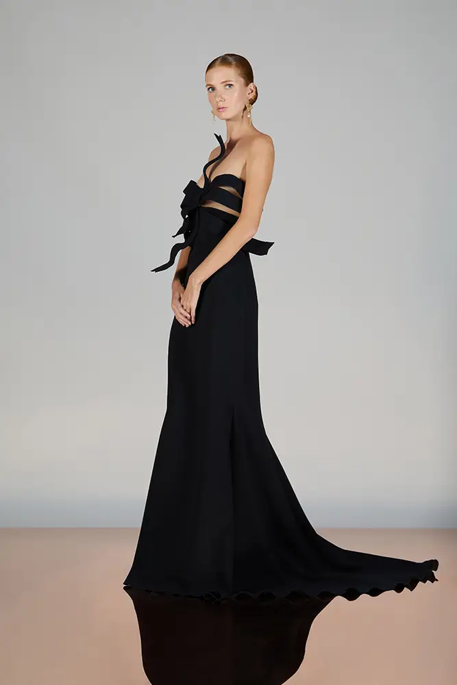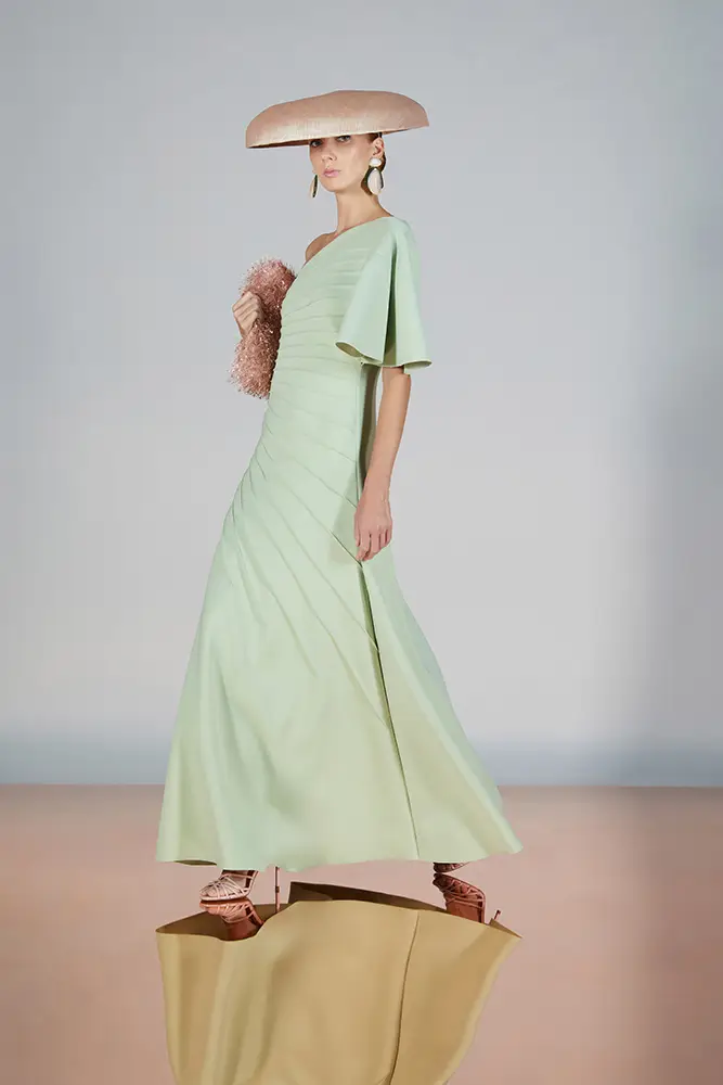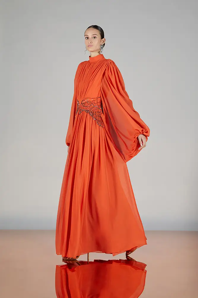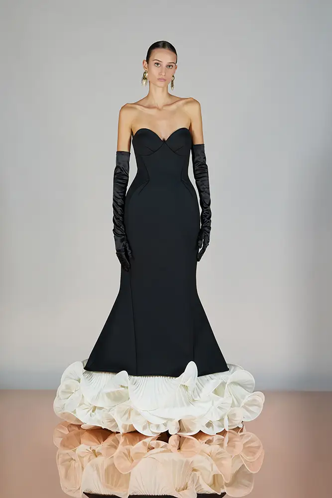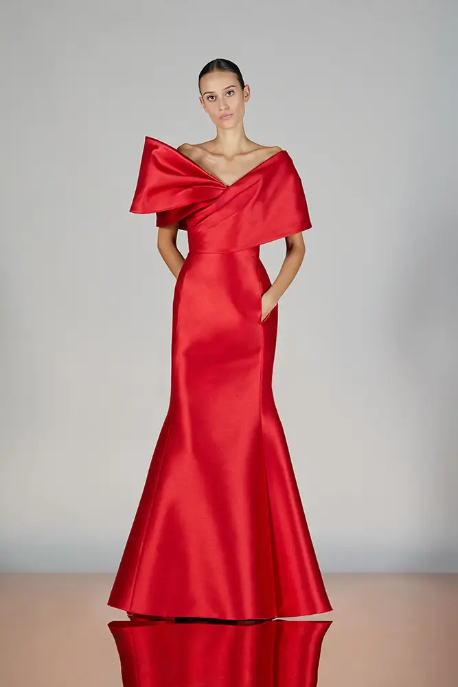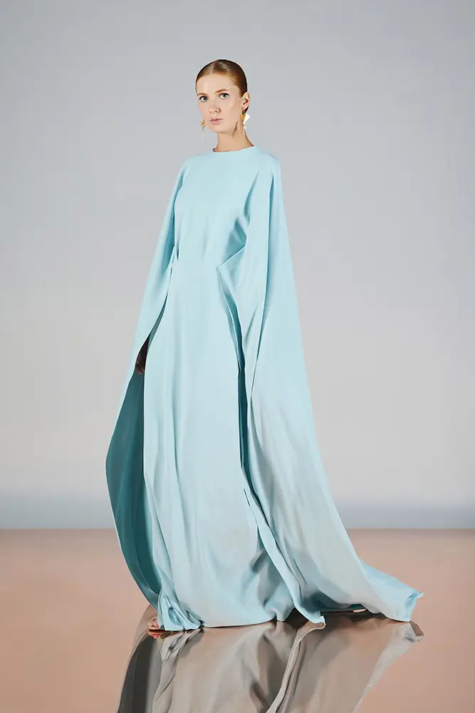 Las capas de gasa, los drapeados precisos y los detalles escultóricos aportanmovimiento y carácter sin perder funcionalidad.