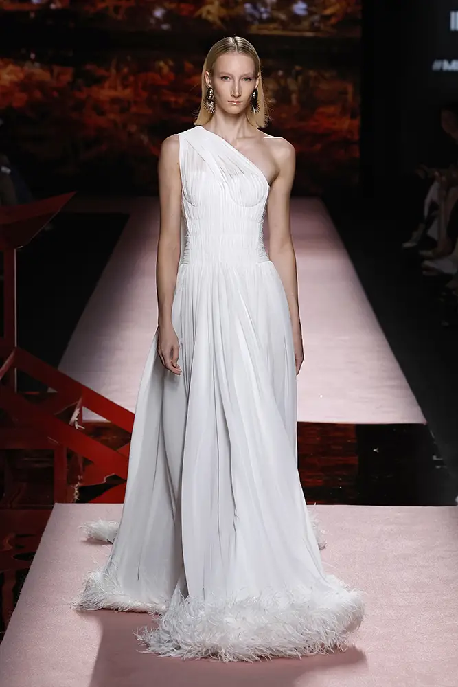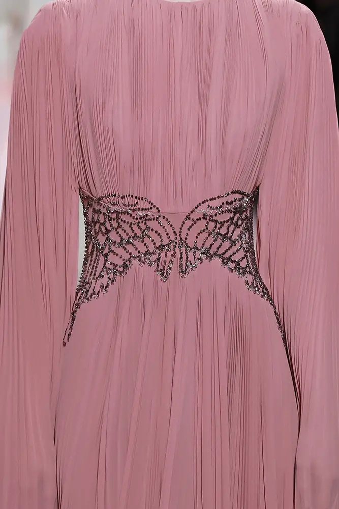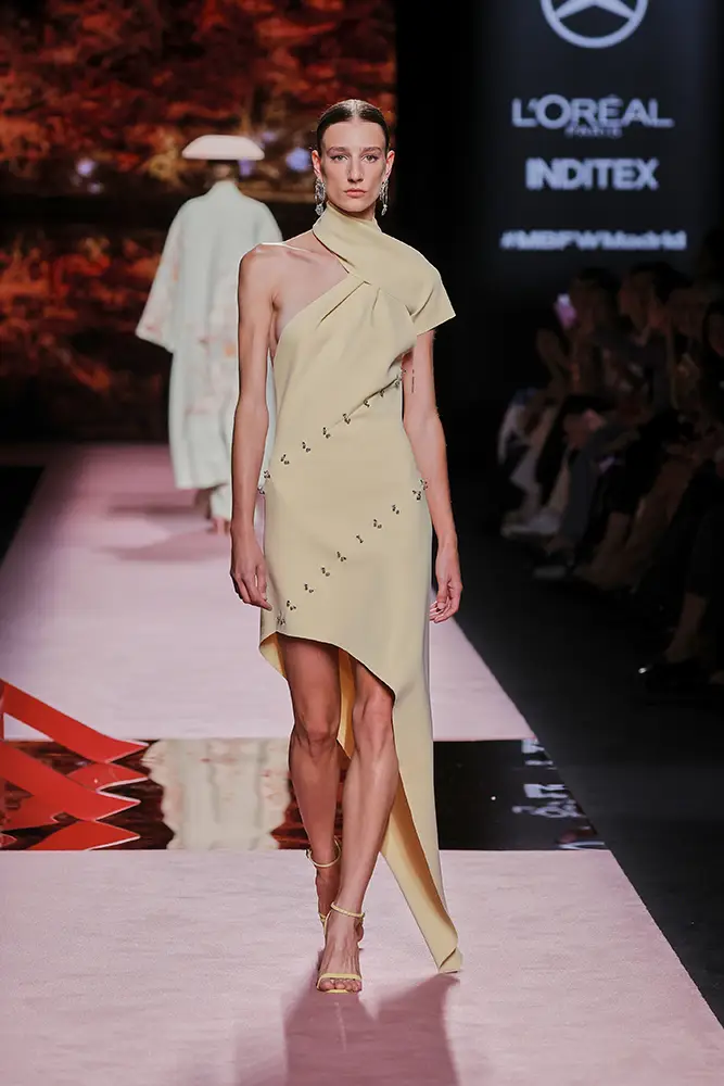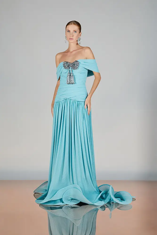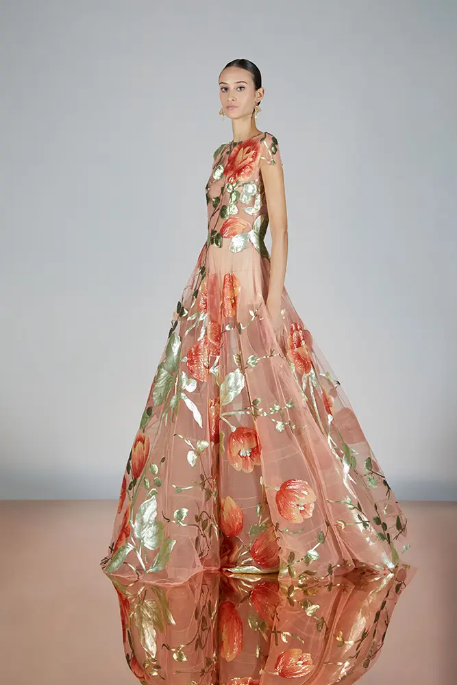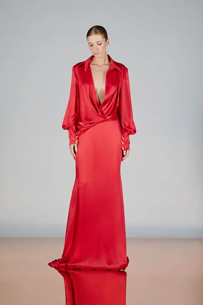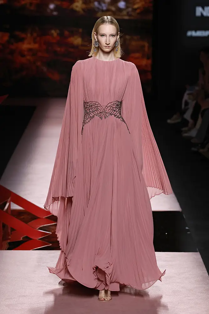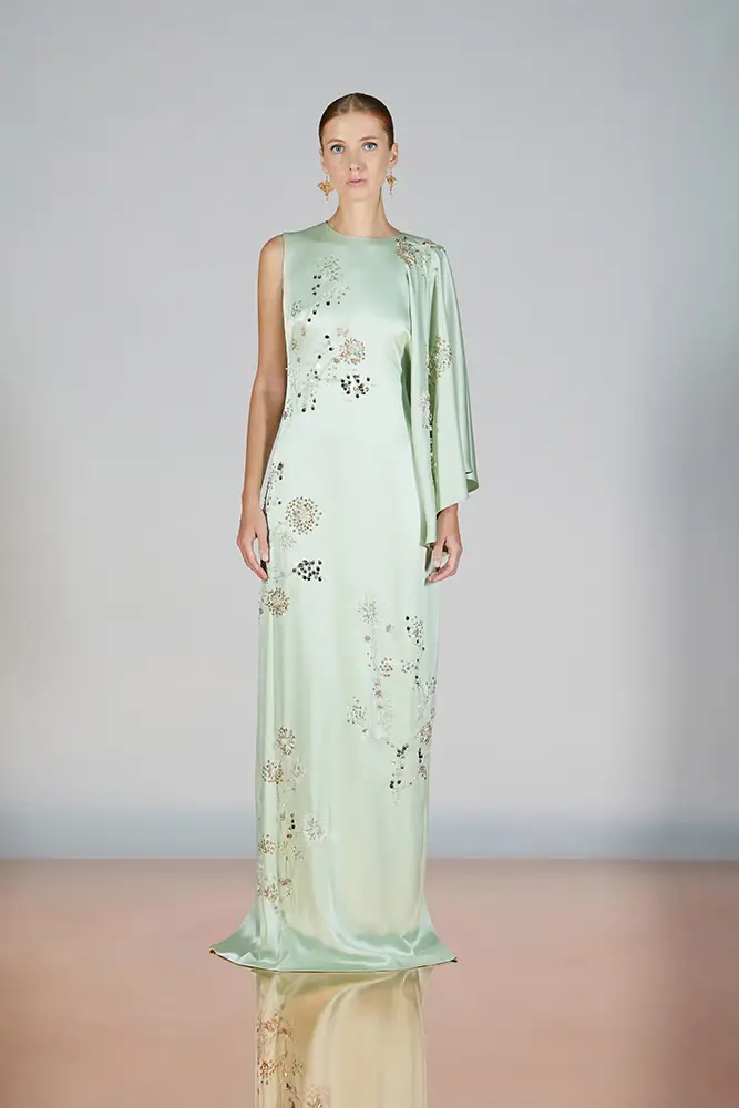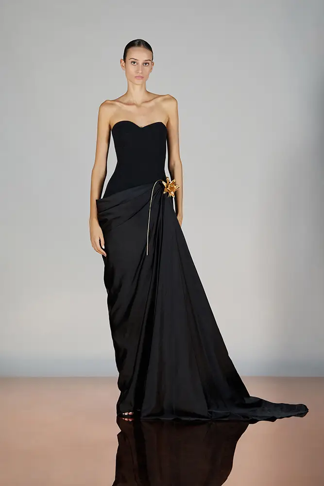 Las capas de gasa, los drapeados precisos y los detalles escultóricos aportanmovimiento y carácter sin perder funcionalidad.