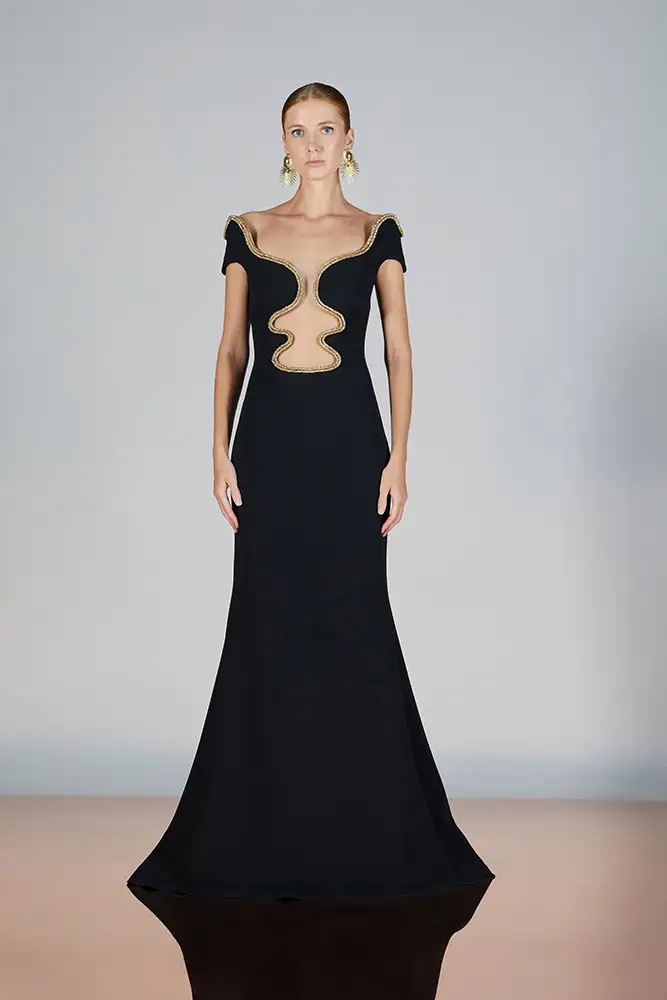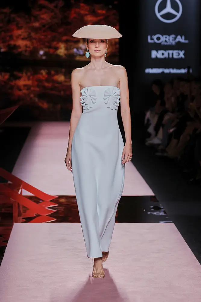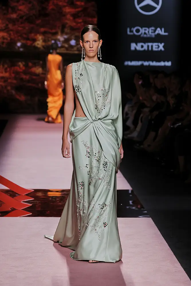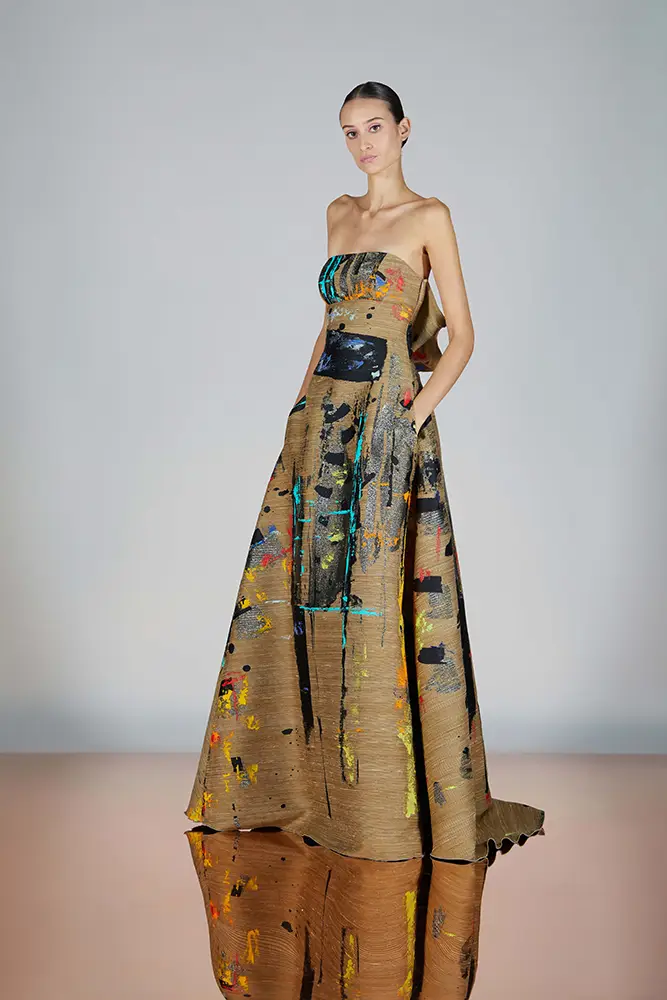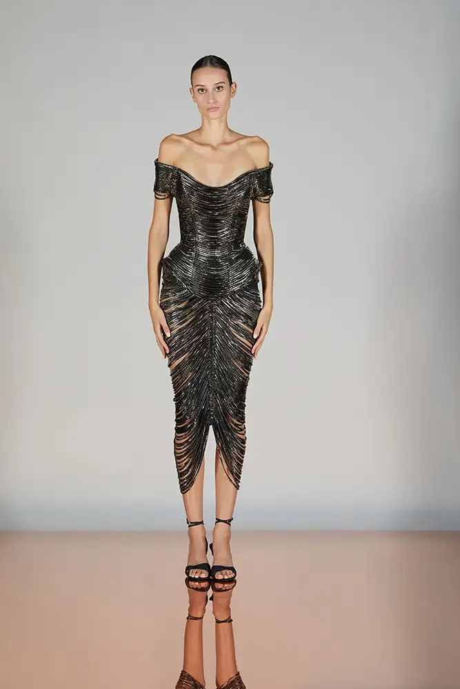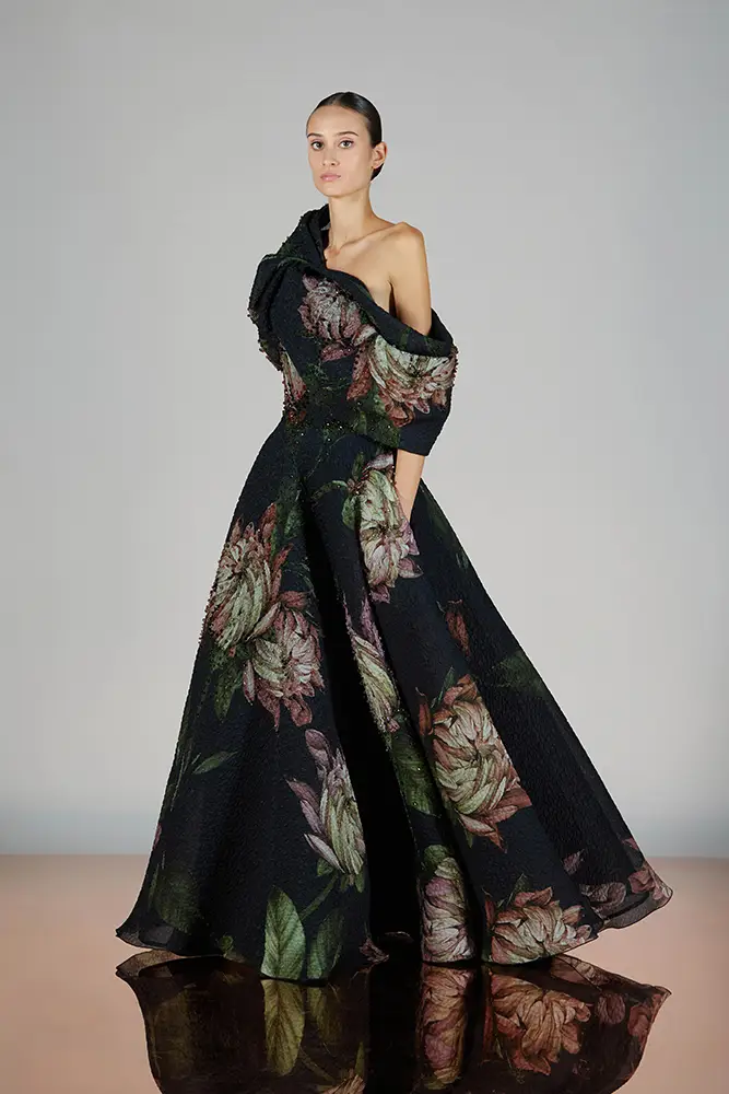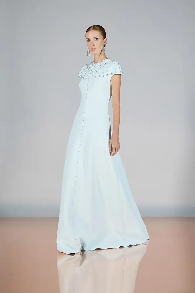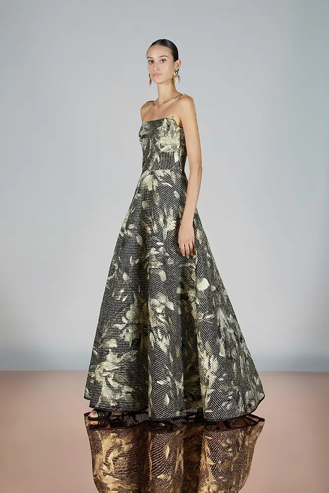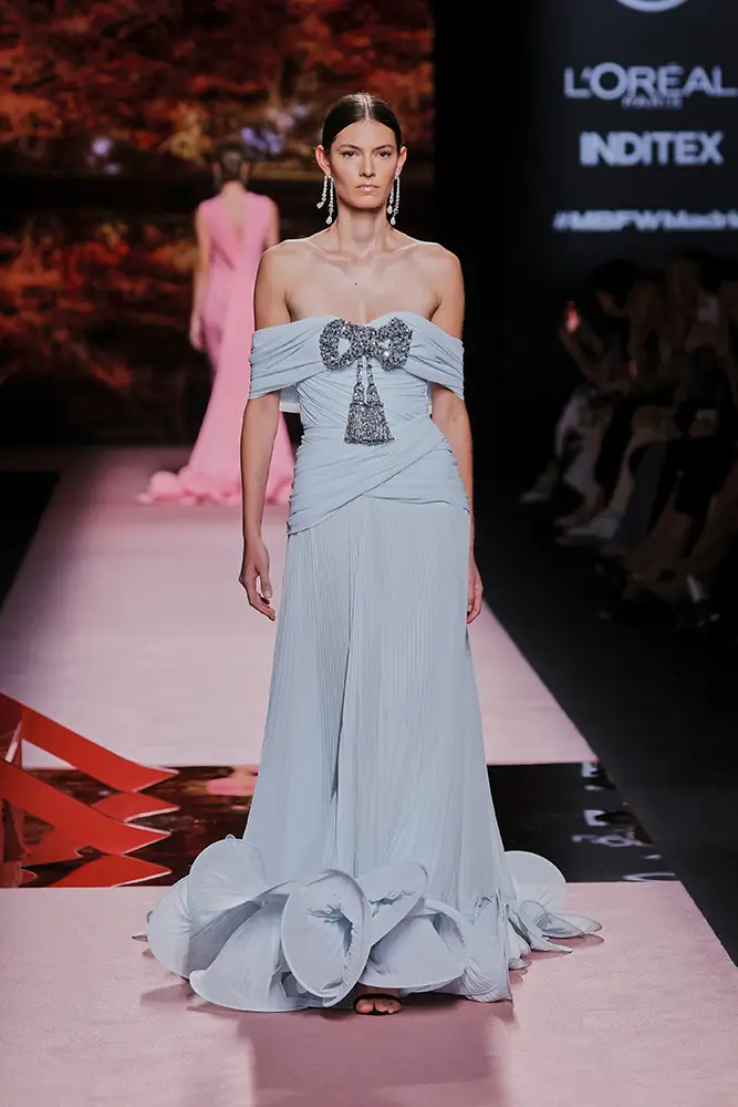 Las capas de gasa, los drapeados precisos y los detalles escultóricos aportanmovimiento y carácter sin perder funcionalidad.