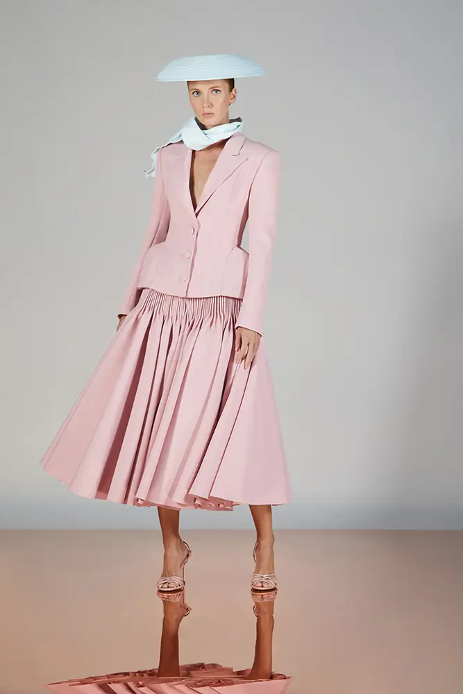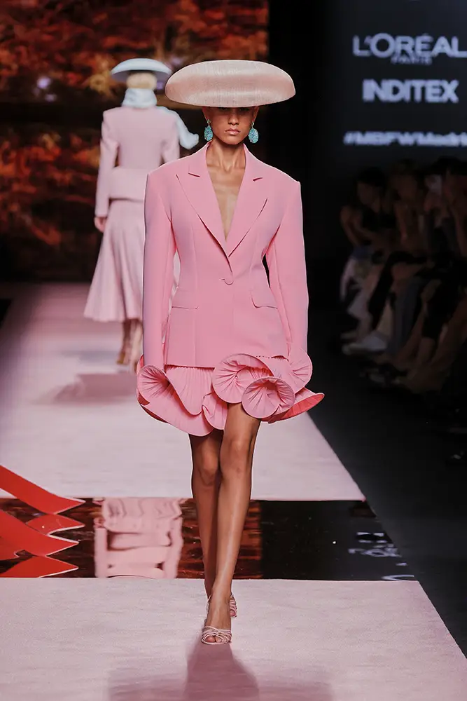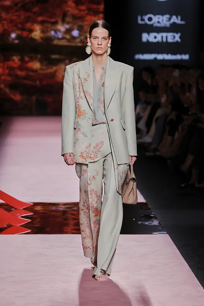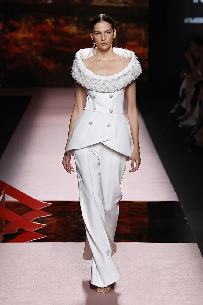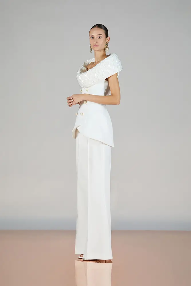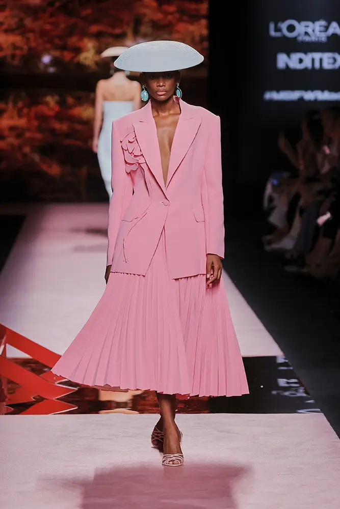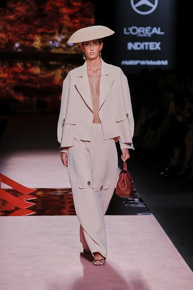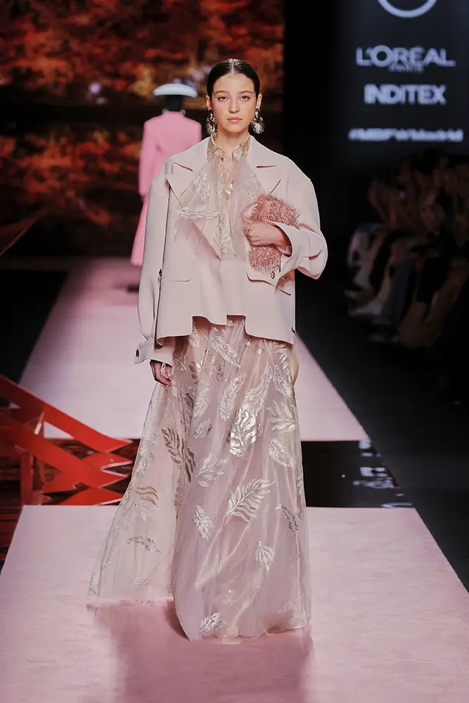 Trajes amplios en tonos blancos, rosas y tierra evolucionan hacia una sastrería relajada con proporciones fluidas y hombros estructurados, ideales para eventos diurnos o estilismos urbanos con un toque couture.