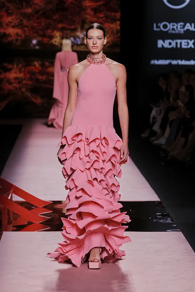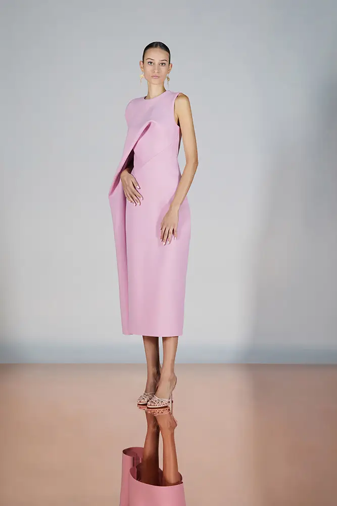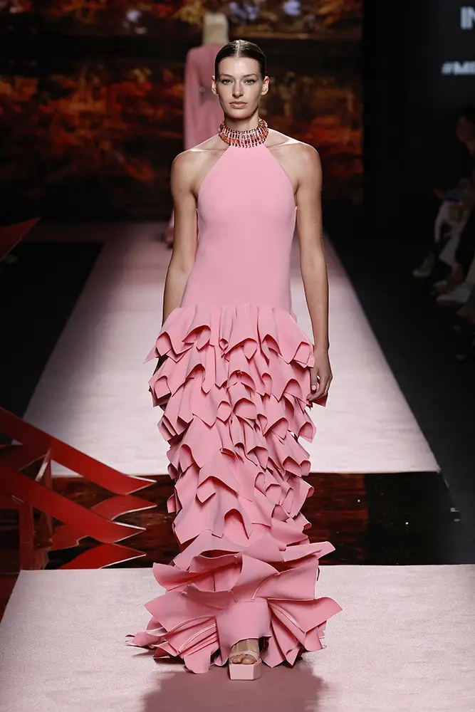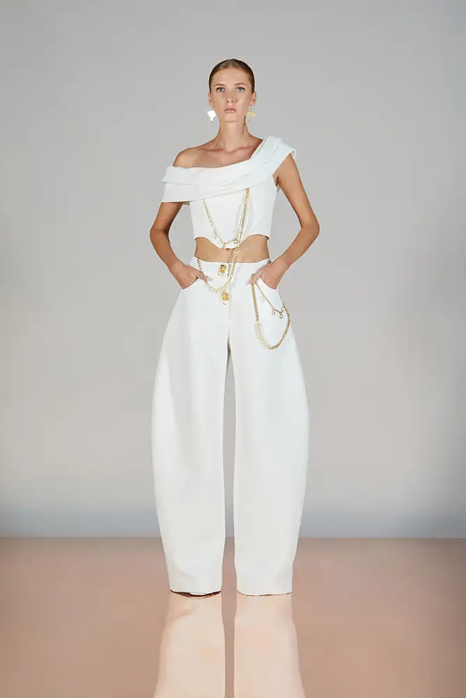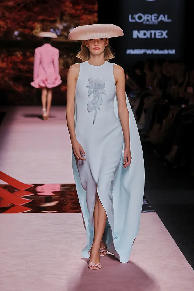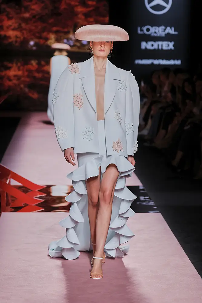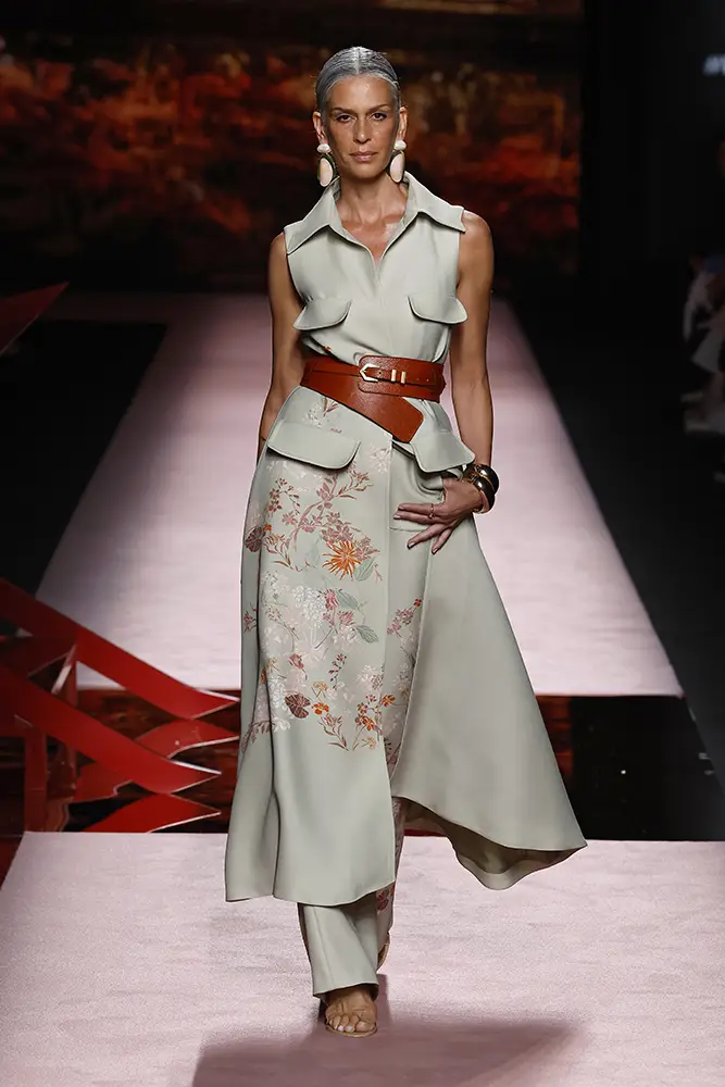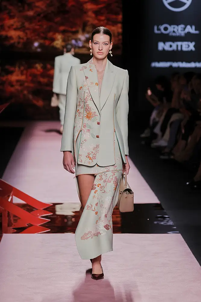 Trajes amplios en tonos blancos, rosas y tierra evolucionan hacia una sastrería relajada con proporciones fluidas y hombros estructurados, ideales para eventos diurnos o estilismos urbanos con un toque couture.