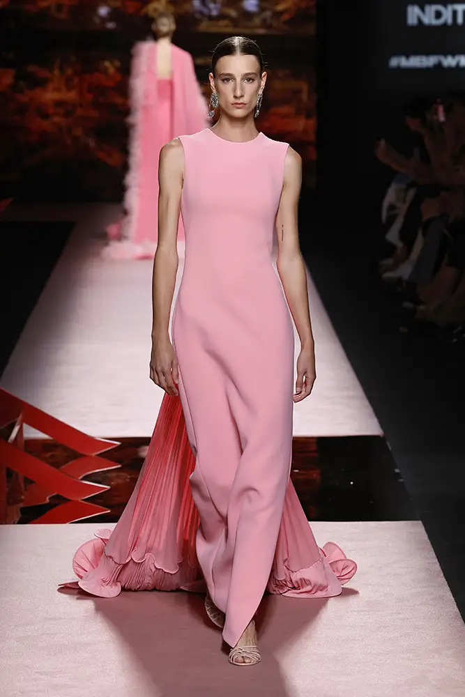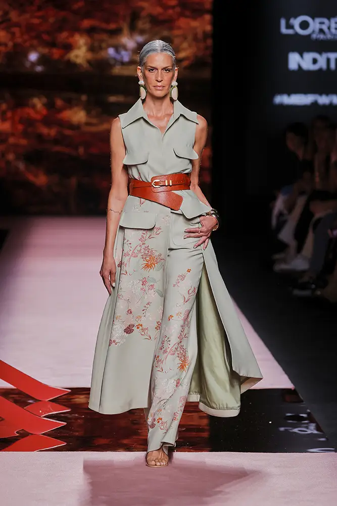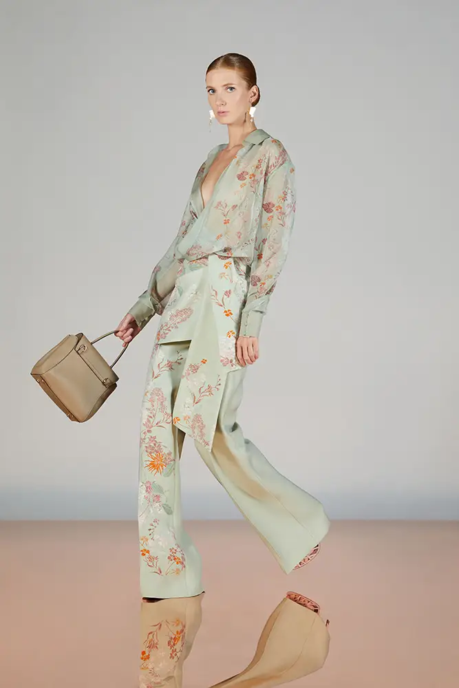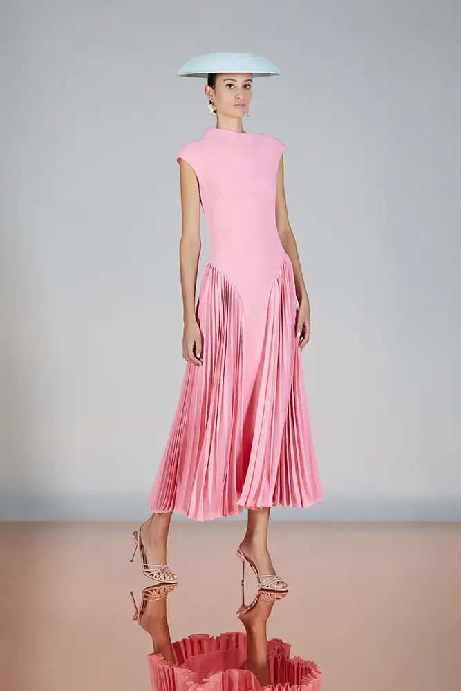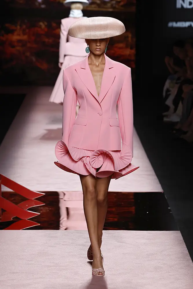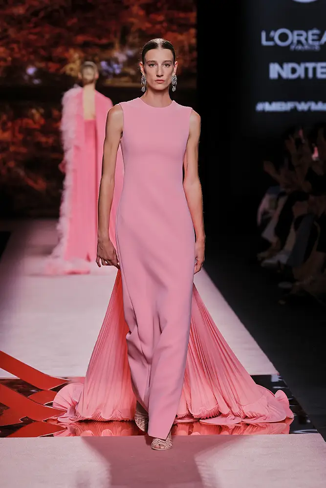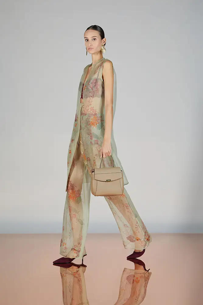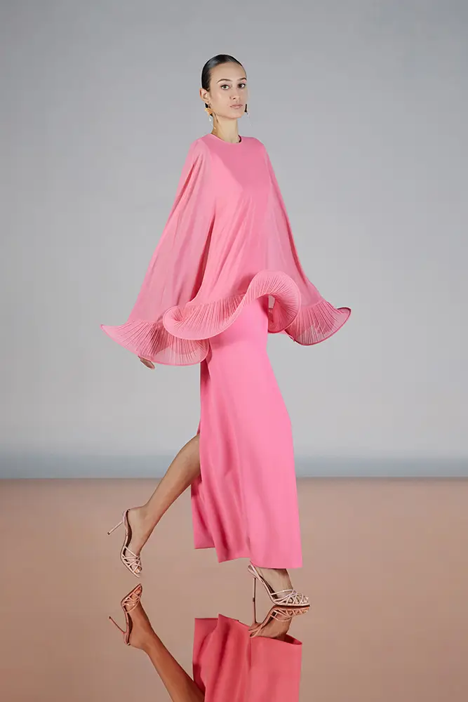 Trajes amplios en tonos blancos, rosas y tierra evolucionan hacia una sastrería relajada con proporciones fluidas y hombros estructurados, ideales para eventos diurnos o estilismos urbanos con un toque couture.