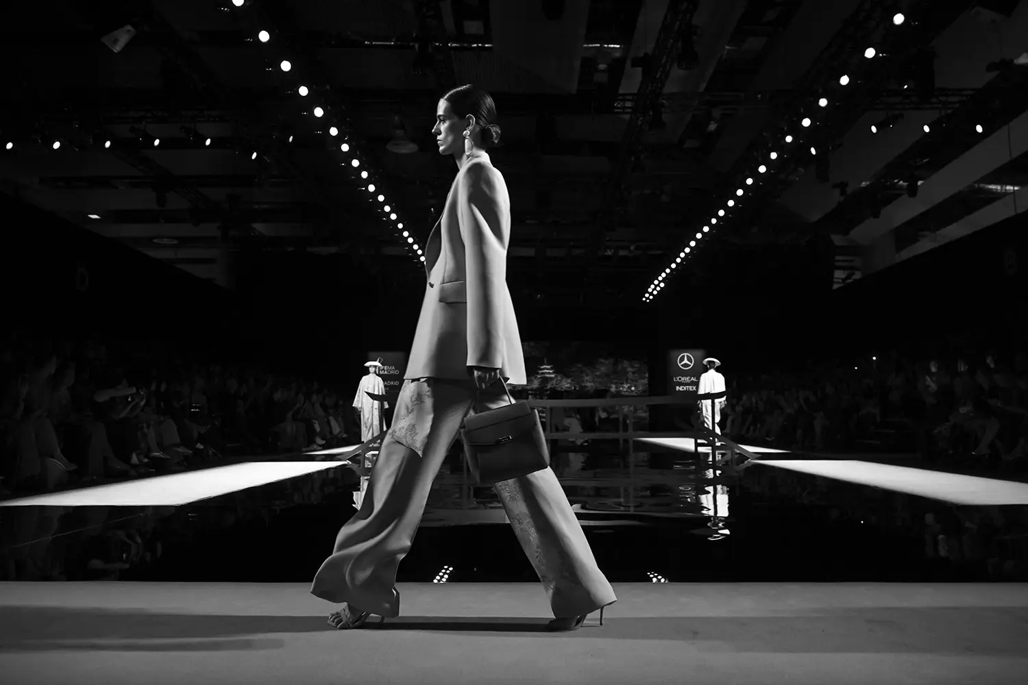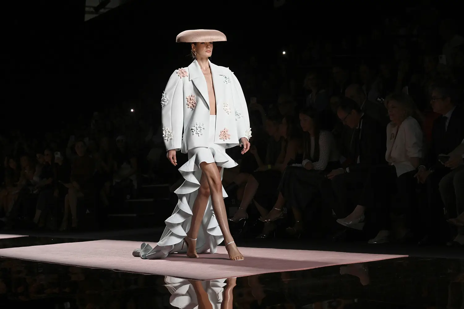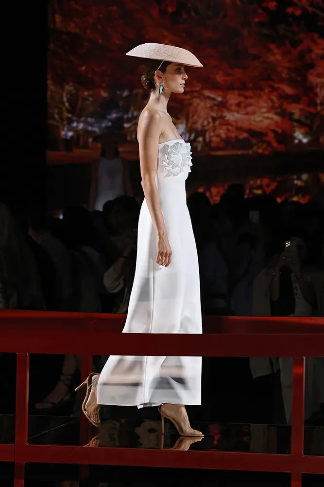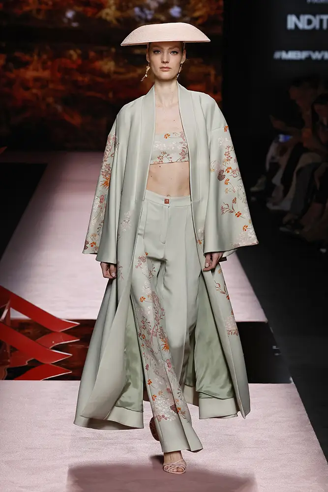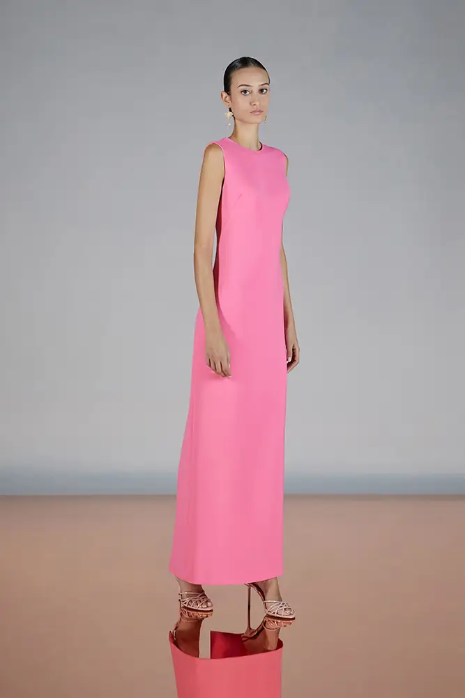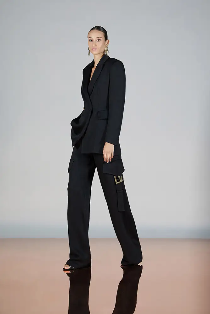 Trajes amplios en tonos blancos, rosas y tierra evolucionan hacia una sastrería relajada con proporciones fluidas y hombros estructurados, ideales para eventos diurnos o estilismos urbanos con un toque couture.