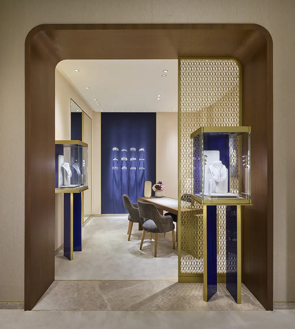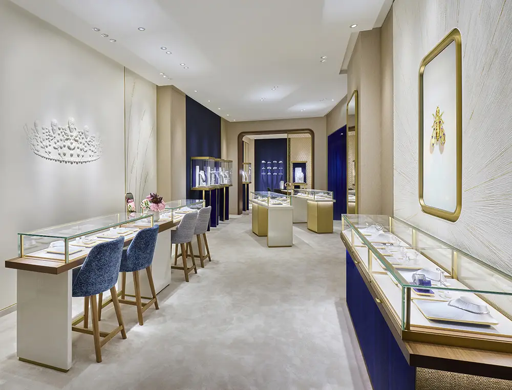 Oscilando entre la tradición y la modernidad, esta luminosa boutique ofrece a los visitantes una experiencia memorable, en la que el saber hacer único de las creaciones de Chaumet se combina con la artesanía artística para transmitir toda la poesía y la excelencia por las que la Maison es famosa.