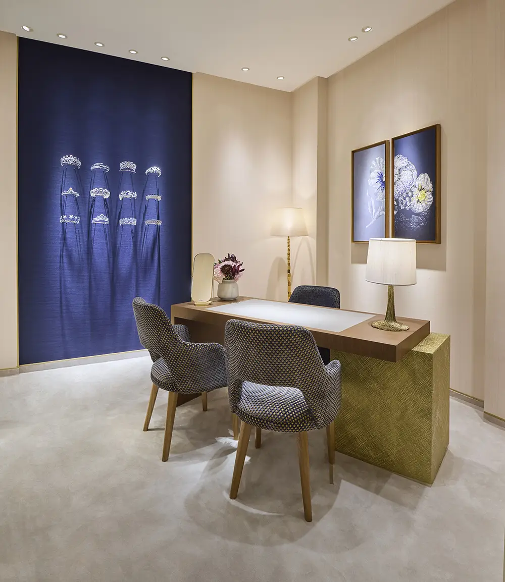 Un mural en bajorrelieve que representa la tiara Bourbon-Parma ilustra este legado, mientras que el característico azul armoniza perfectamente con las paredes adornadas con modelos de tiaras en plata níquel. Los motivos de espigas doradas que se inclinan con la brisa recuerdan la identidad botánica de Chaumet como «joyero naturalista» desde hace 245 años.