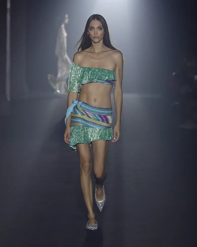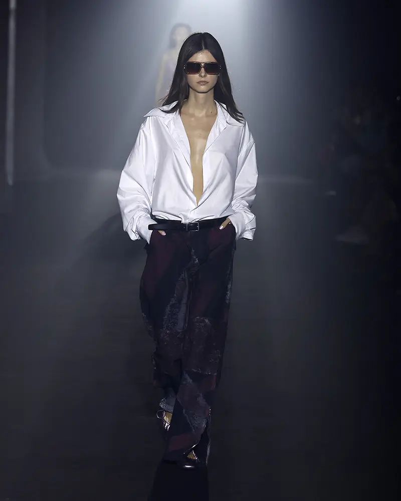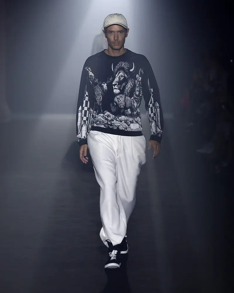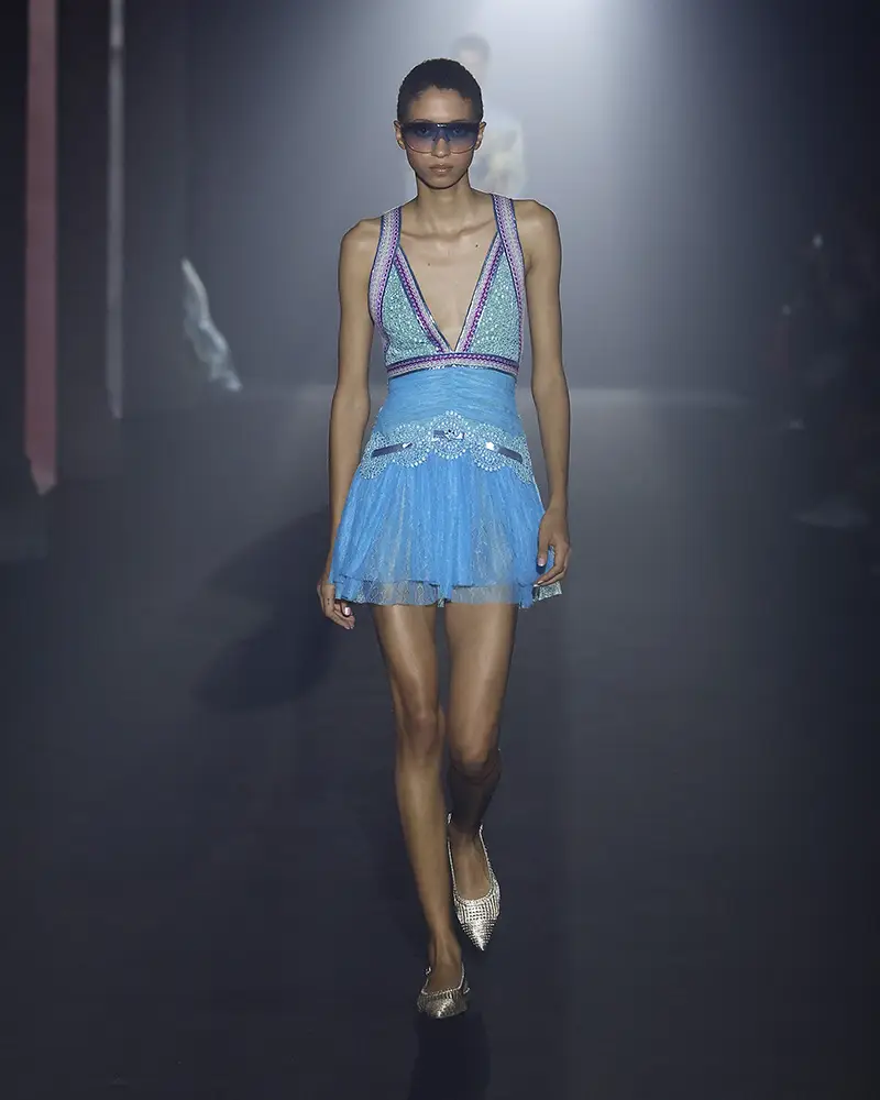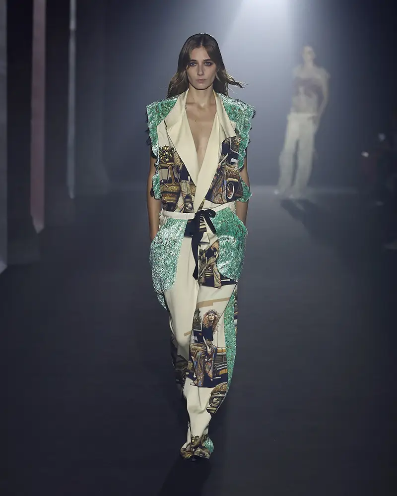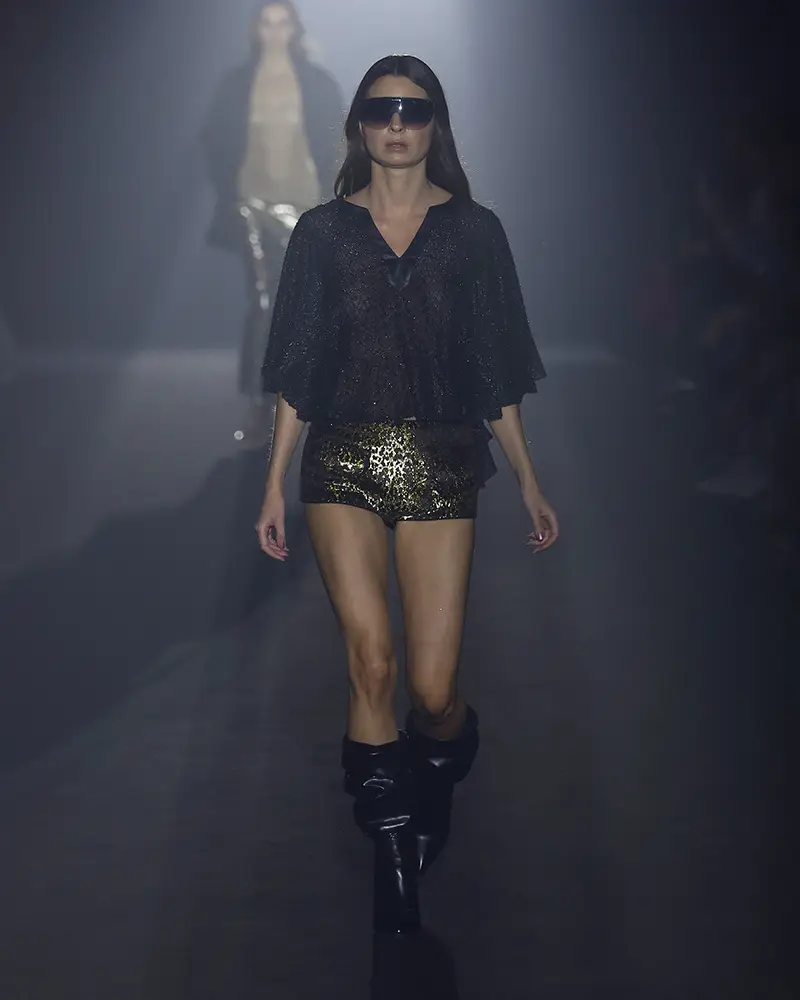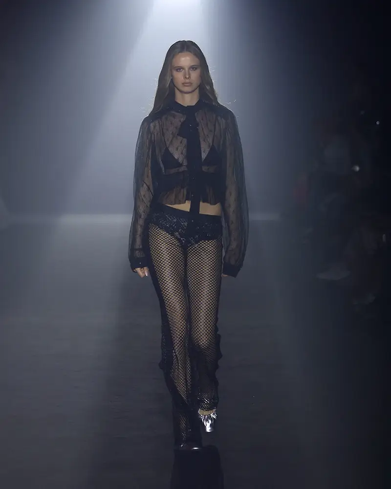 El desfile también presentó chaquetas oversize reinterpretadas como microvestidos, adornadas con macrográficas y una fuerte presencia visual, reafirmando el carácter audaz y urbano de la colección.