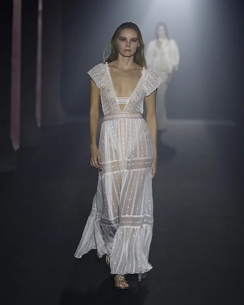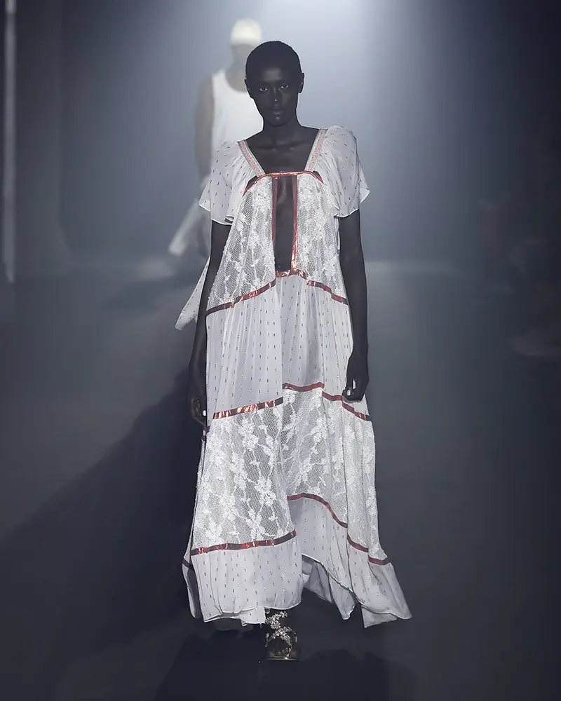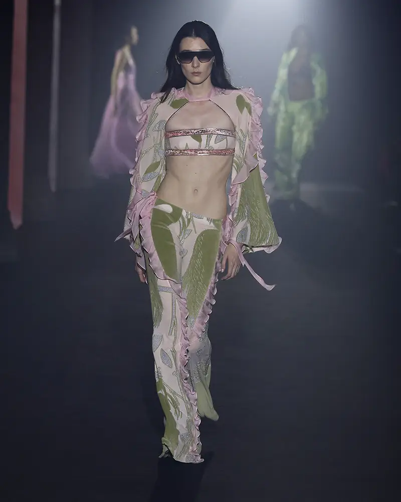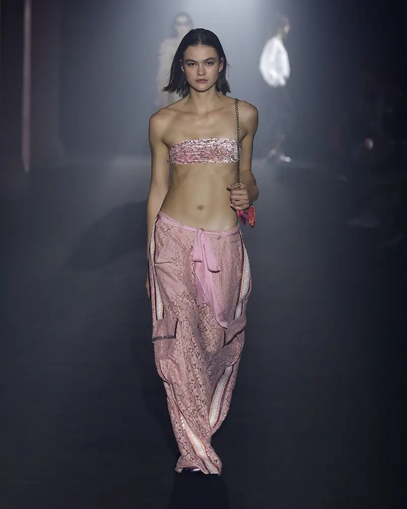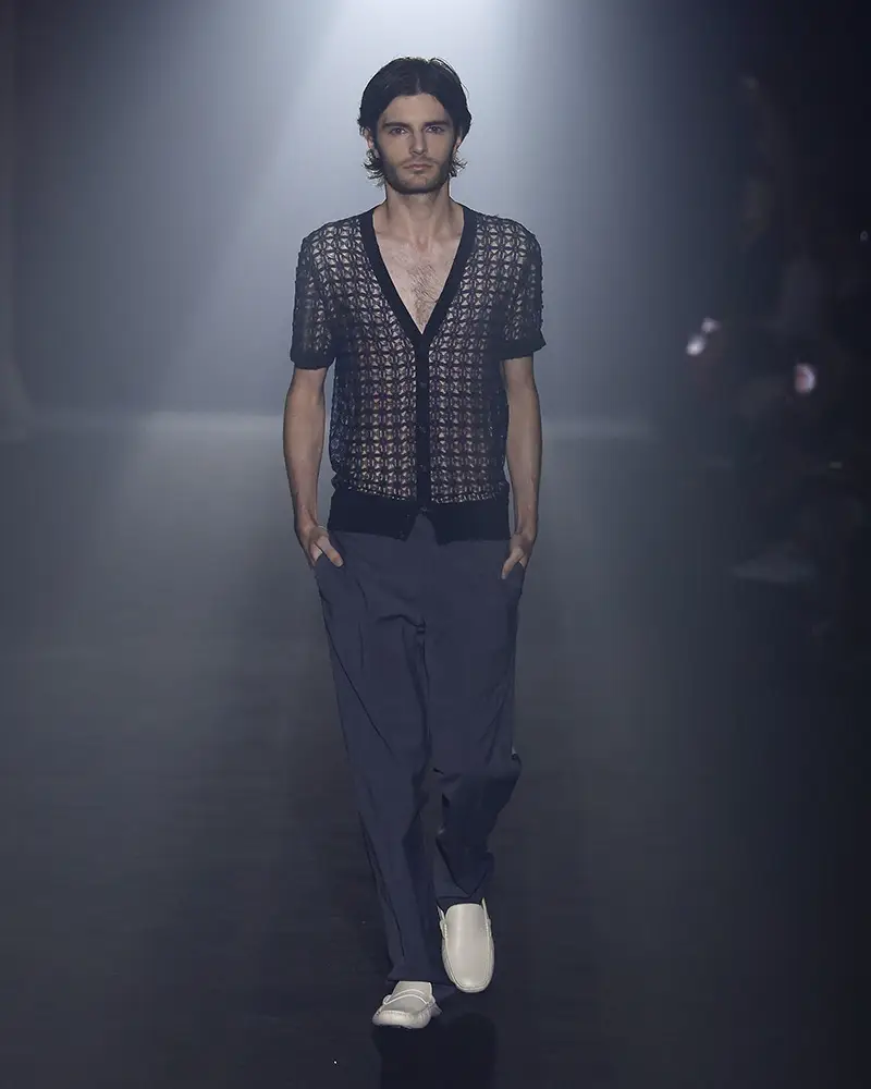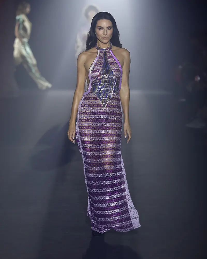 Sobre la pasarela, los vestidos en todas sus variantes se erigen como protagonistas, en una clara declaración de intenciones: volumen y actitud. Confeccionados en guipur y puntilla con patchwork geométrico, y rematados con detalles cosidos a mano, fusionan referencias contemporáneas con acabados de alta costura. A ellos se suman materiales como jacquard de diferentes texturas, terciopelo devorado con hilos metálicos y tejidos de encaje, que elevan el concepto de sport y las prendas casuales de lujo a una nueva dimensión.
