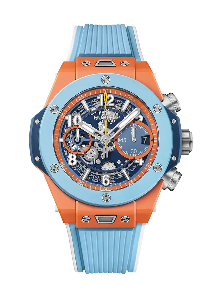 El brillo de la caja naranja pulida con chorro de arena del Big Bang Unico Summer 2025, elaborada con la cerámica de alta tecnología emblemática de Hublot, evoca el atardecer, mientras que el bisel de color azul cielo refleja el mar infinito. Ligero, atrevido y decididamente moderno, este modelo está diseñado para quienes viven donde el sol se funde con las olas.