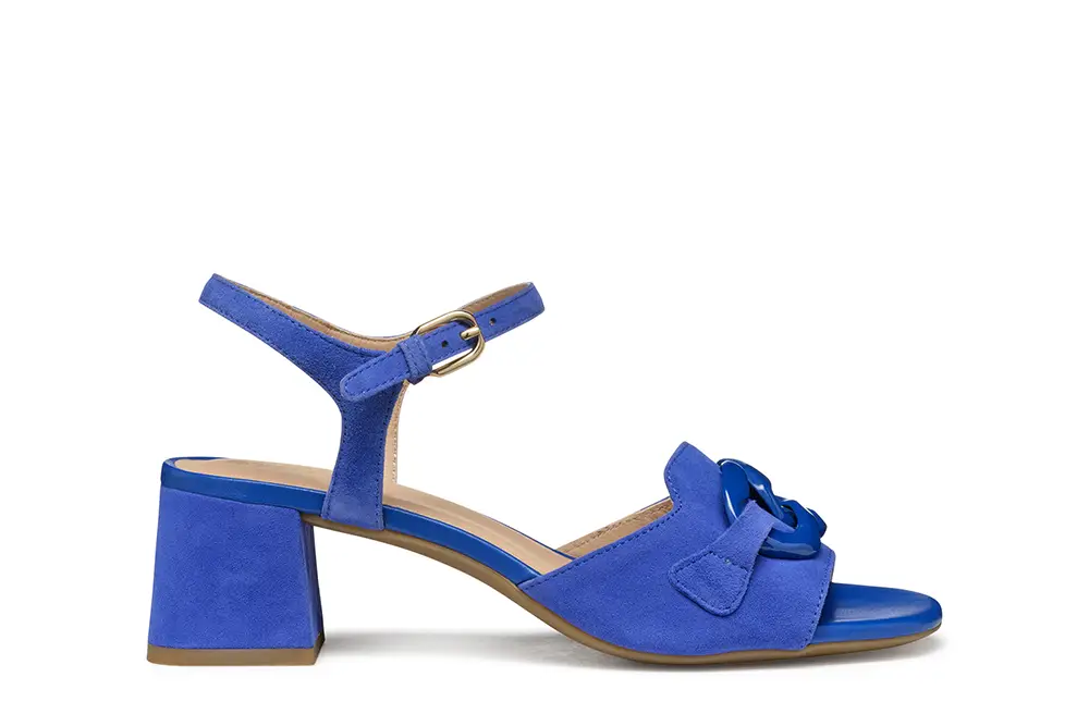 Estos diseños apuestan por un estilo sofisticado y femenino. Estas sandalia con tacón ancho y pulsera ajustable estilizan la figura sin renunciar al confort. Un detalle metálico en la parte del empeine les añade un toque de distinción.