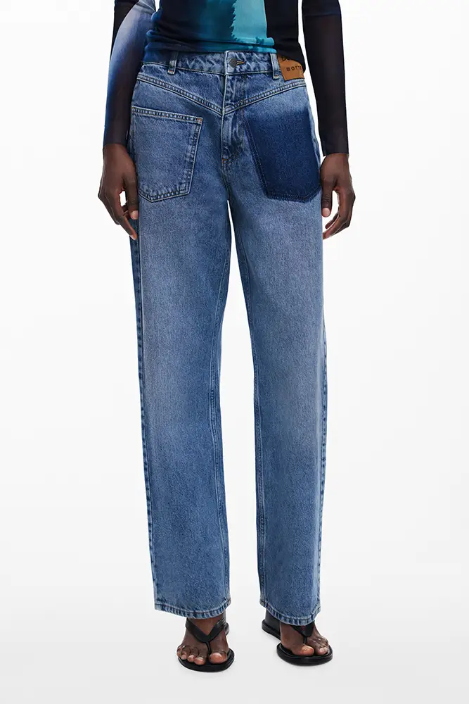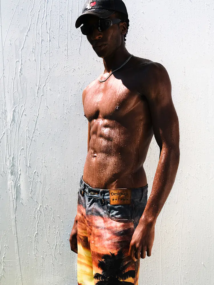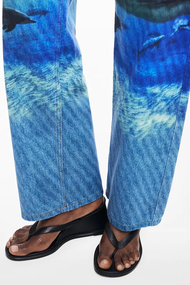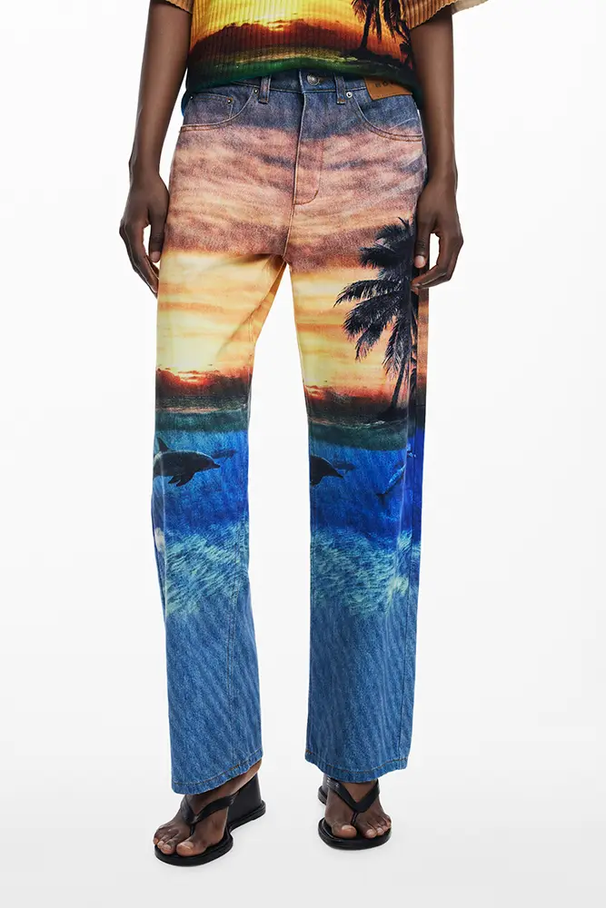 Vaqueros con estampado de atardecer marino: una pieza icónica de la cápsula, que resume la esencia emocional y visual de la colección.