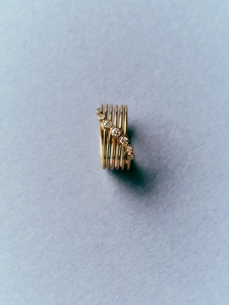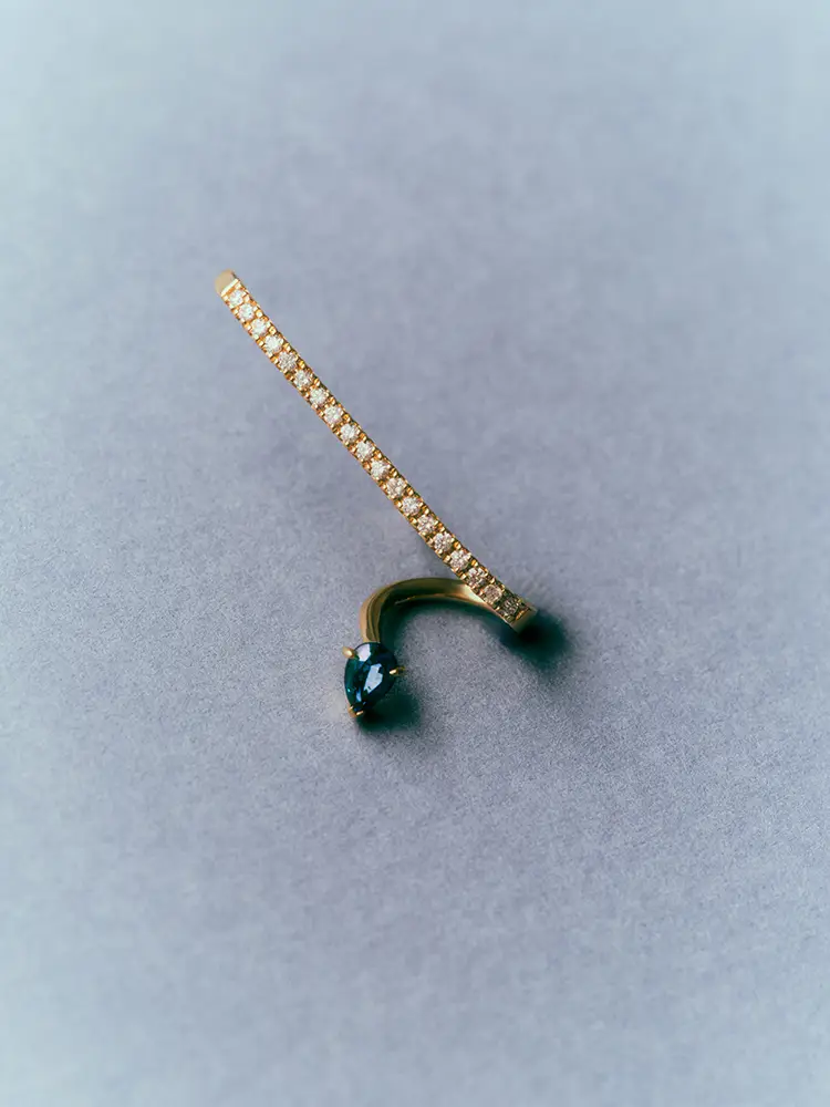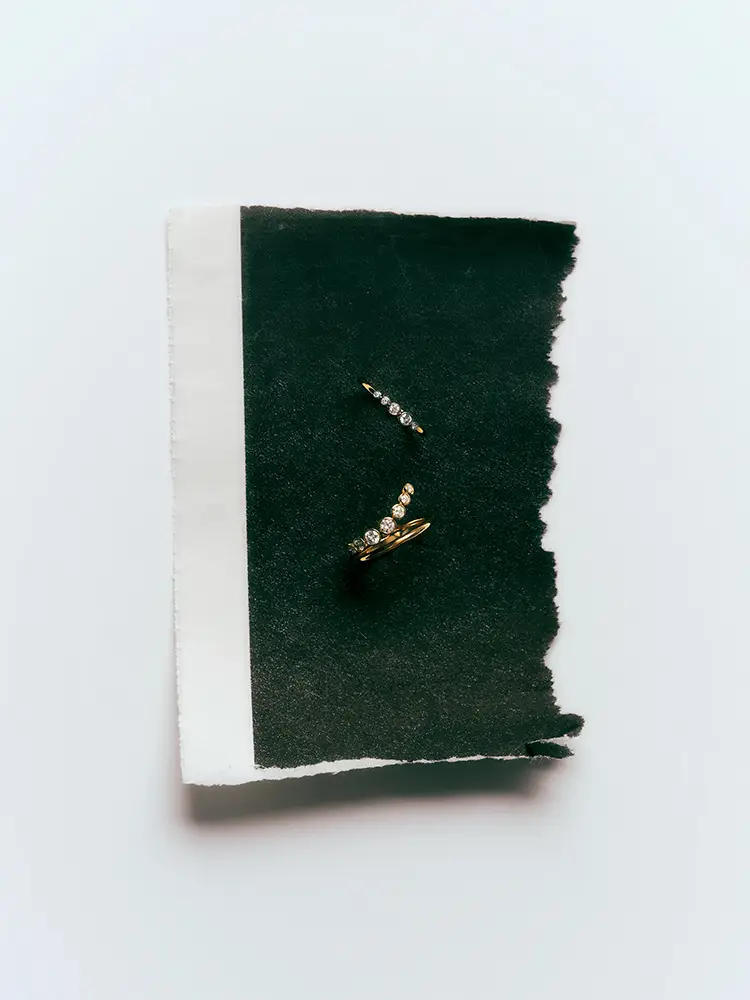Sus joyas en oro de 9K con diamantes en talla brillante se mueven entre la fluidez y la estructura, entre lo clásico y lo inesperado. Cada pieza, desde los anillos con formas envolventes hasta los pendientes trepadores, las pulseras semirrígidas y los colgantes con chatones móviles, juega con el degradé de luz y la combinación bicolor, creando un efecto dinámico que refleja la modernidad del movimiento metaclásico.