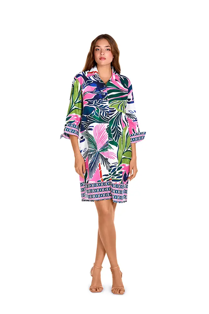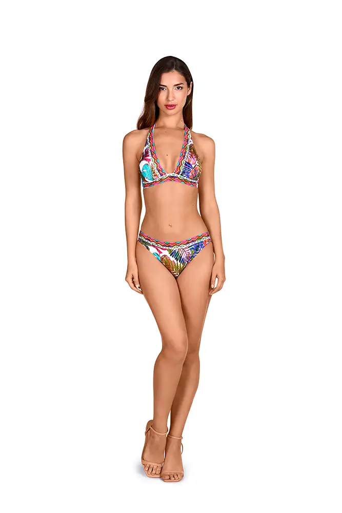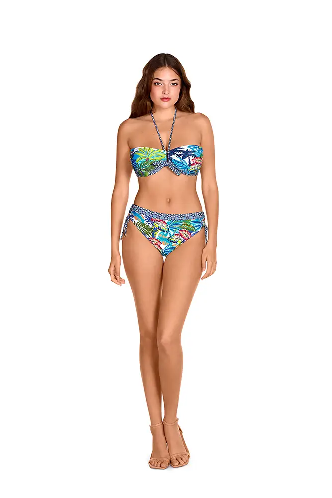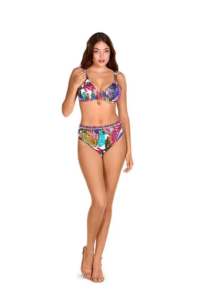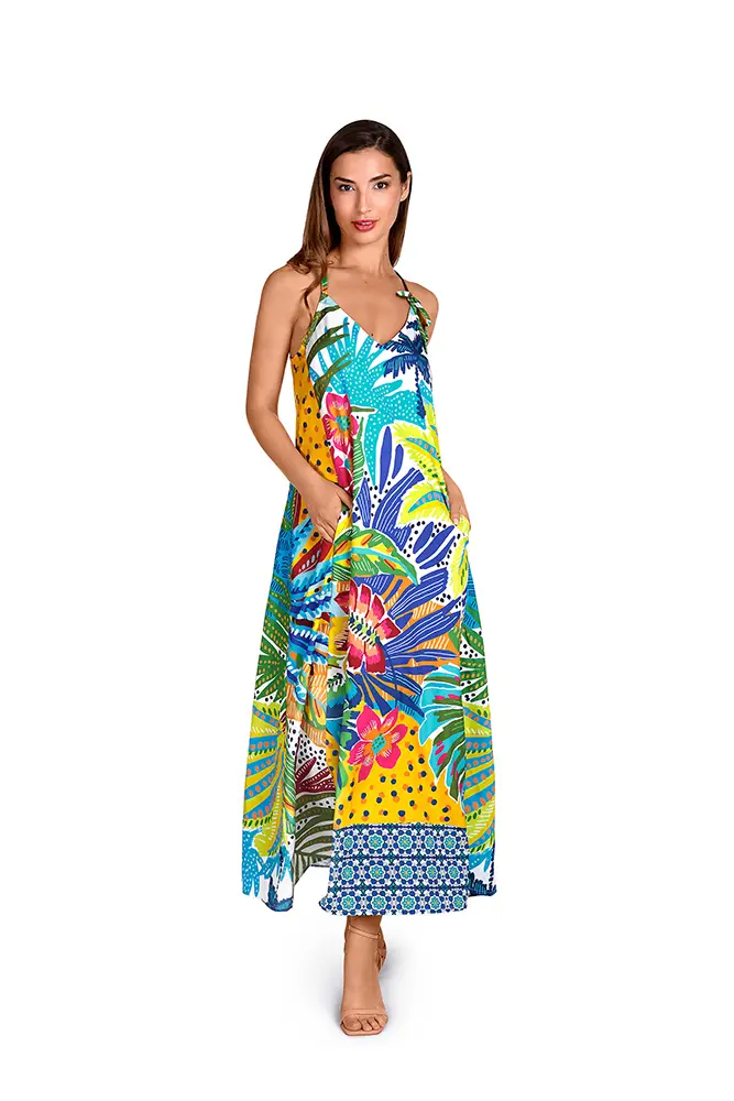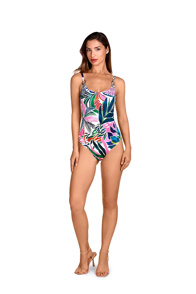 Los colores vibrantes de las flores exóticas, los verdes intensos de las hojas y los tonos anaranjados se mezclan en estampados y accesorios que evocan un escape paradisíaco.
