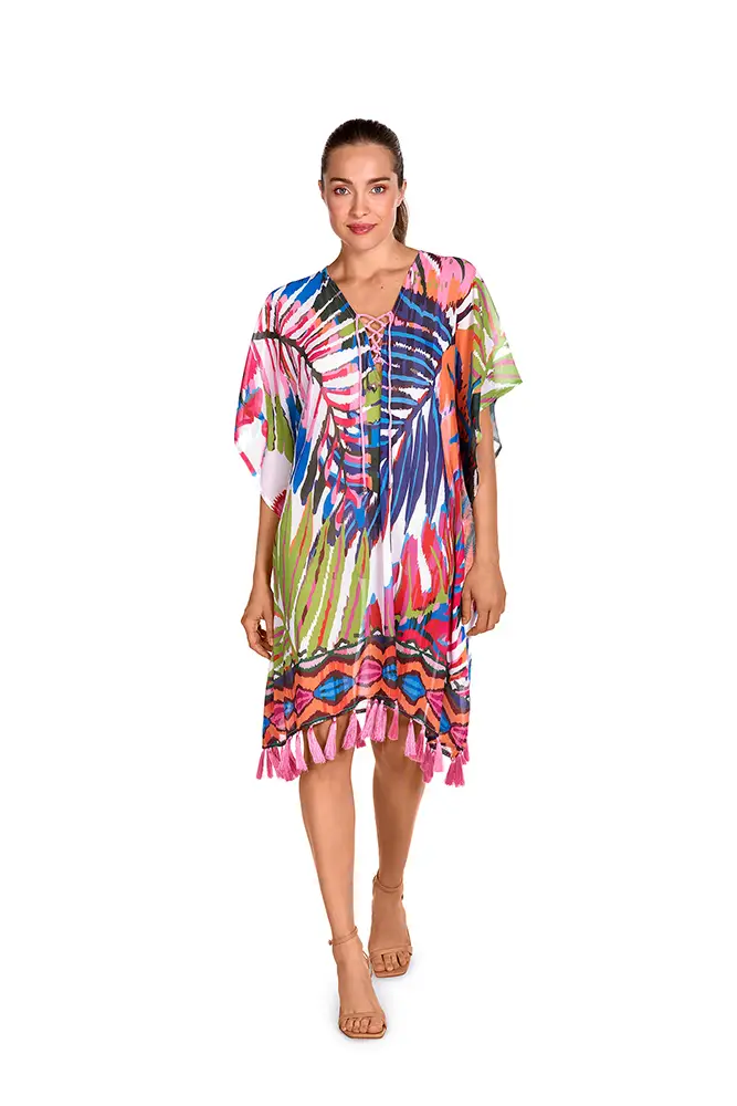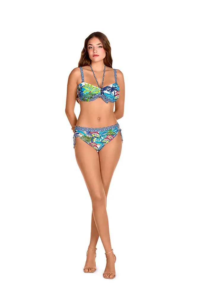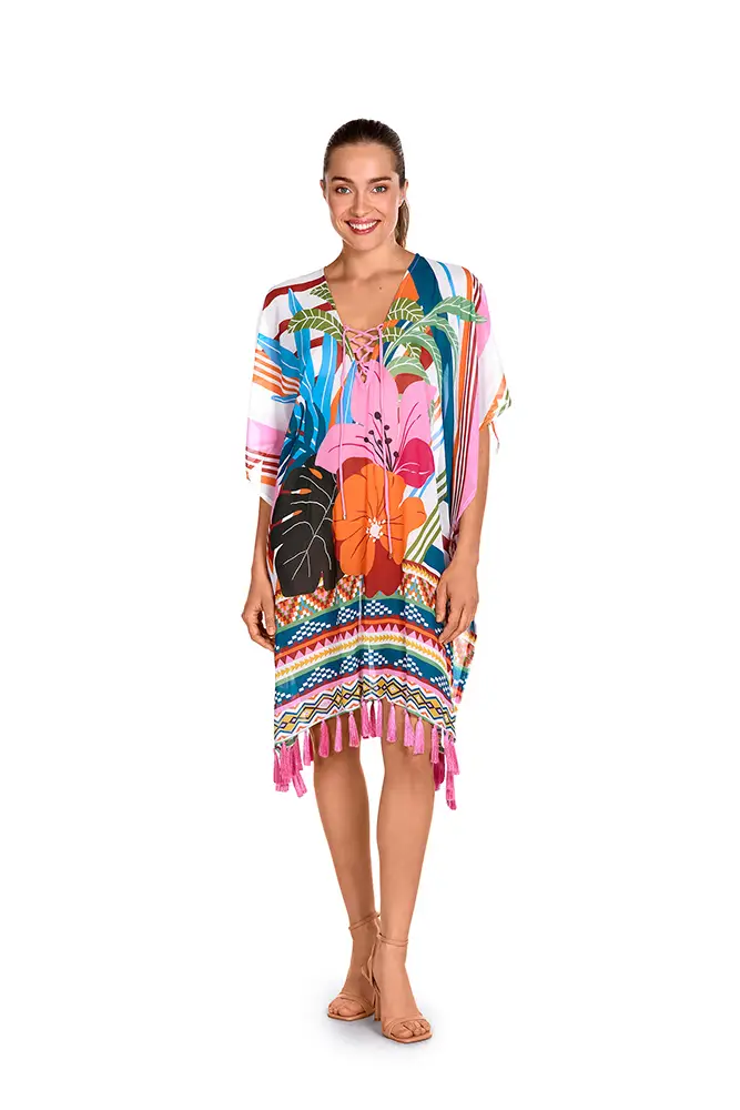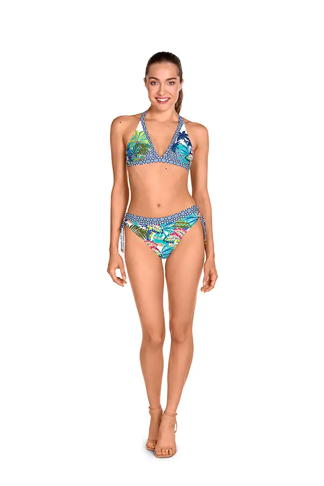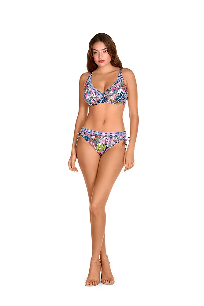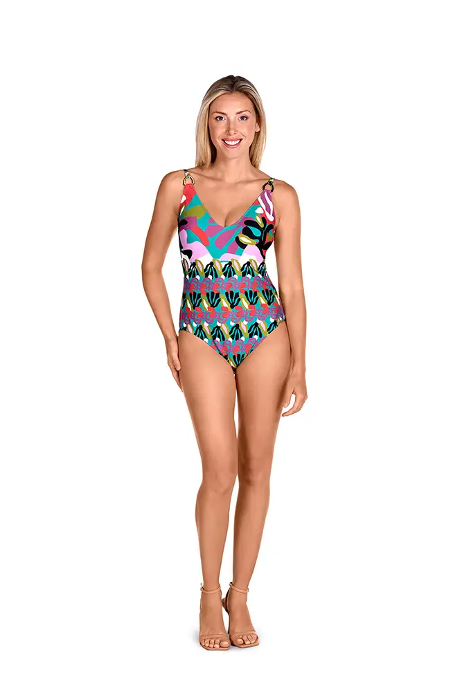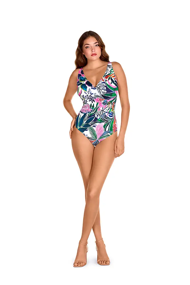 Los colores vibrantes de las flores exóticas, los verdes intensos de las hojas y los tonos anaranjados se mezclan en estampados y accesorios que evocan un escape paradisíaco.