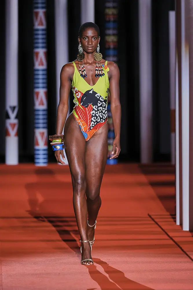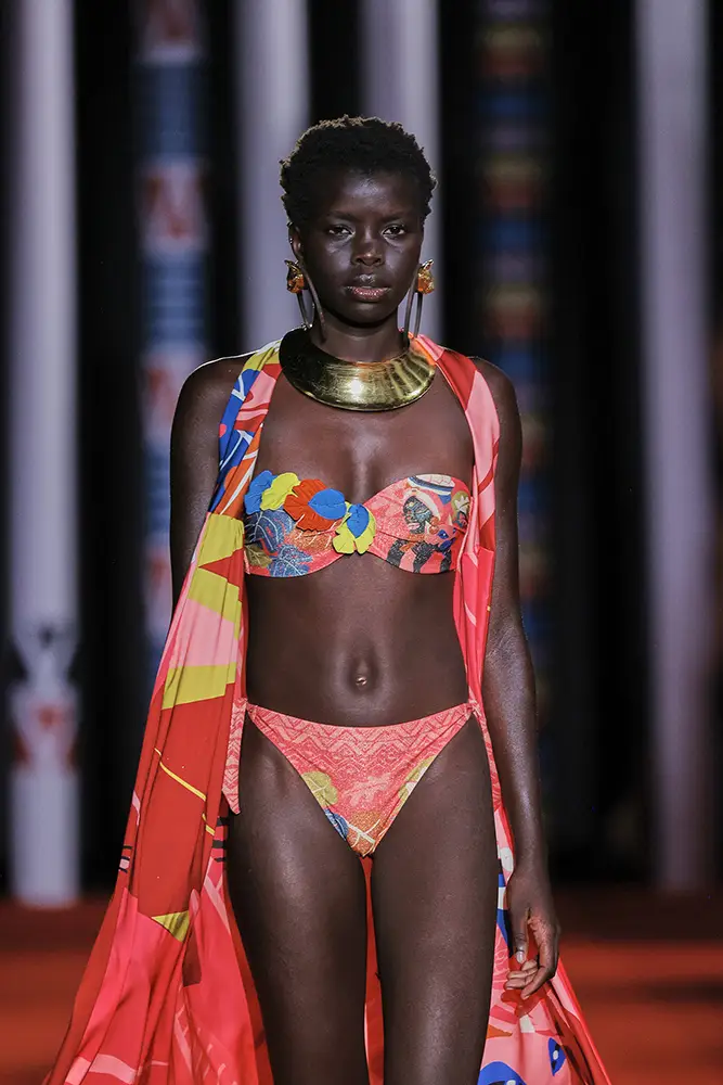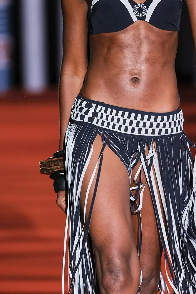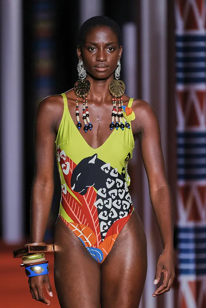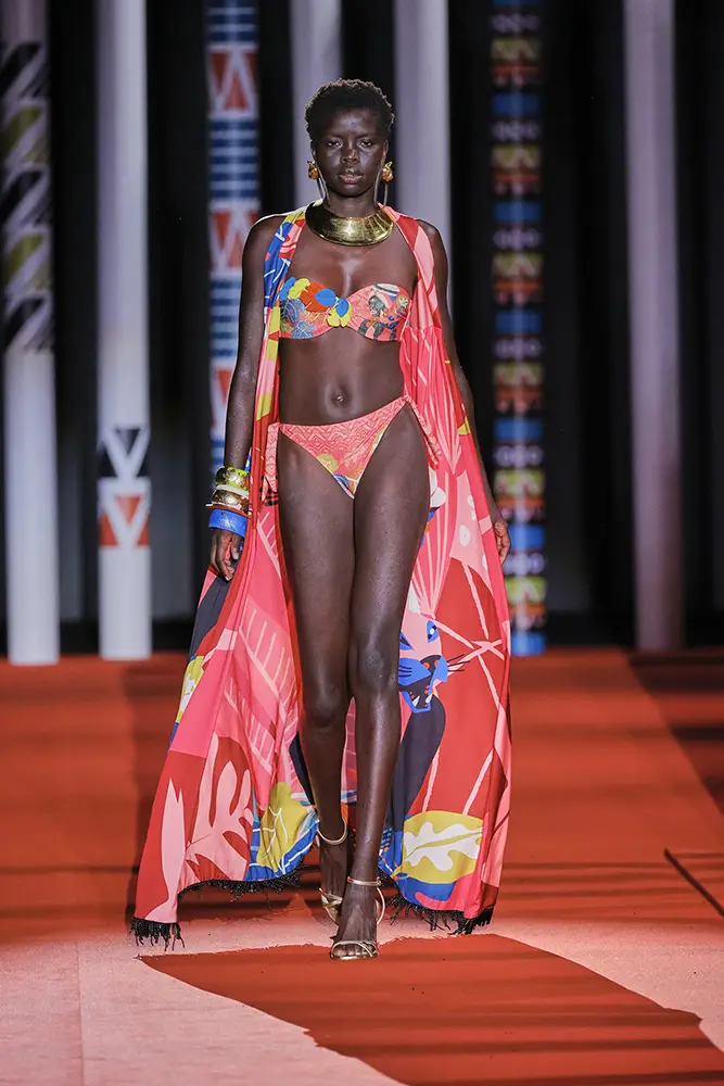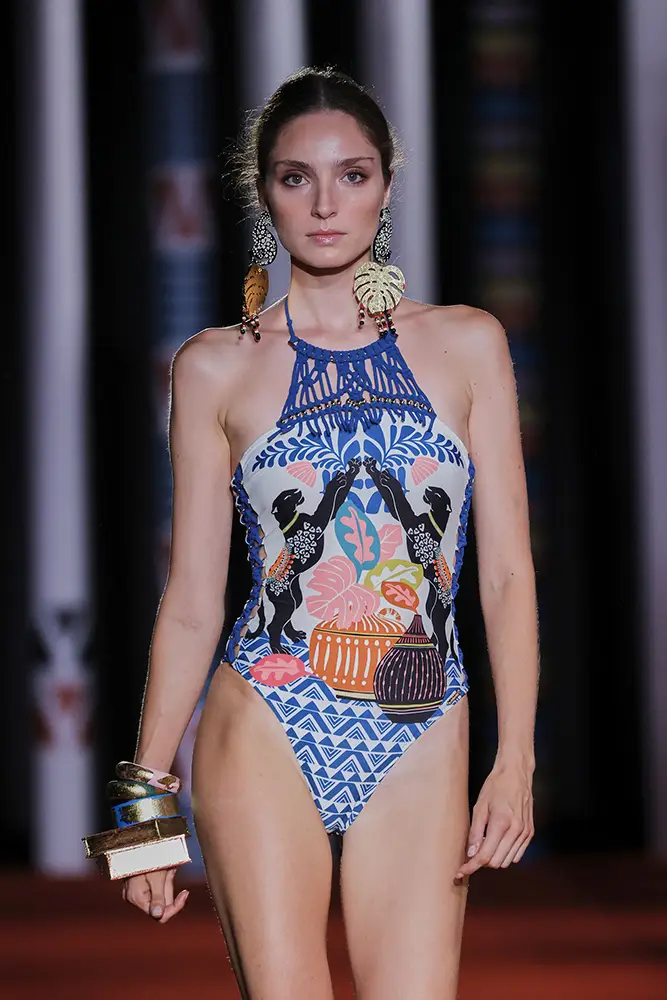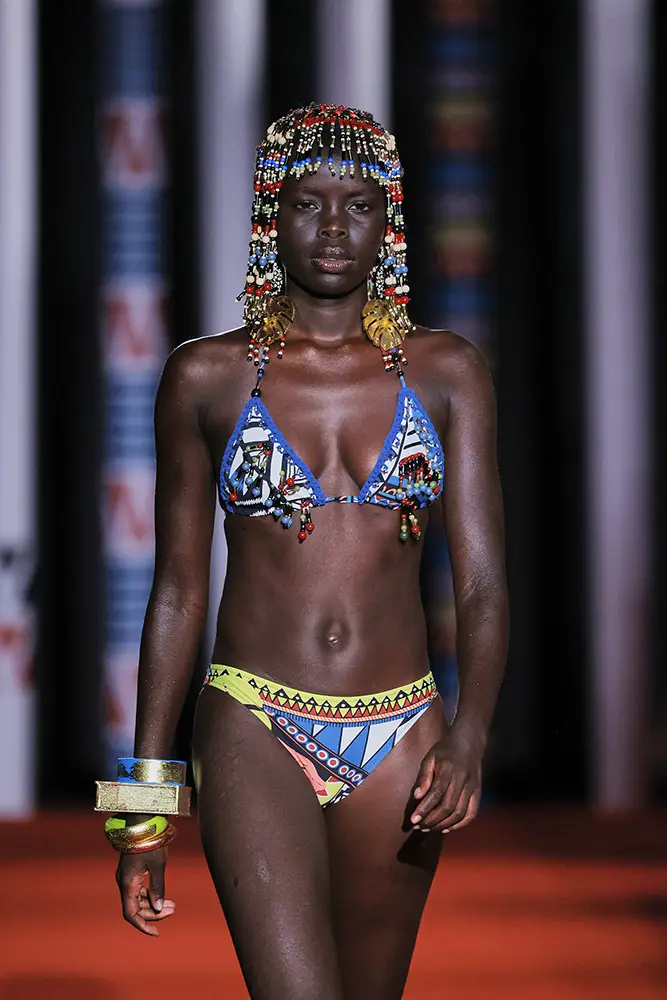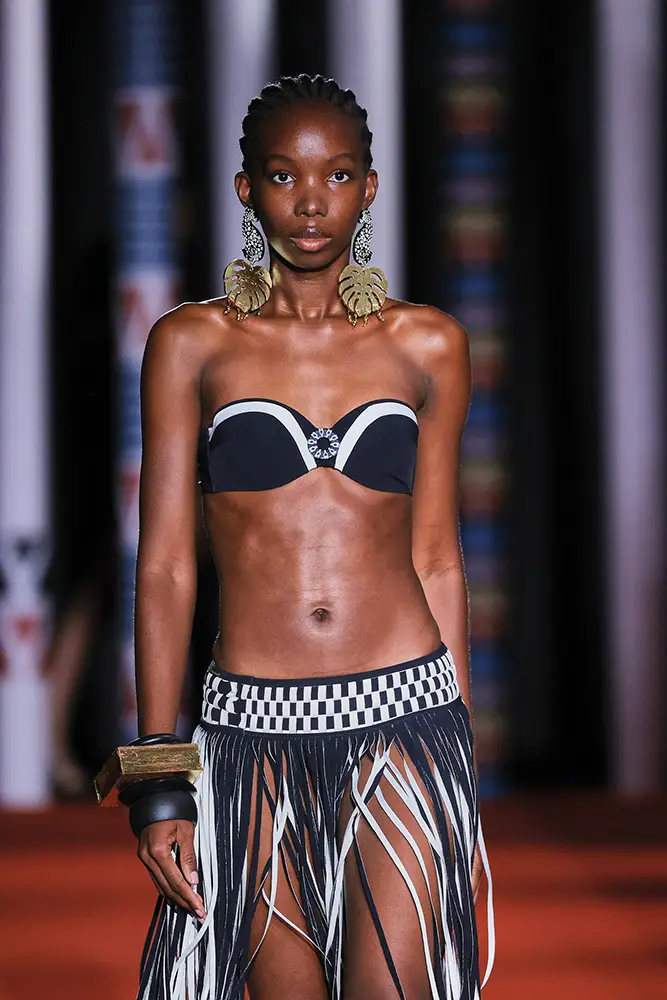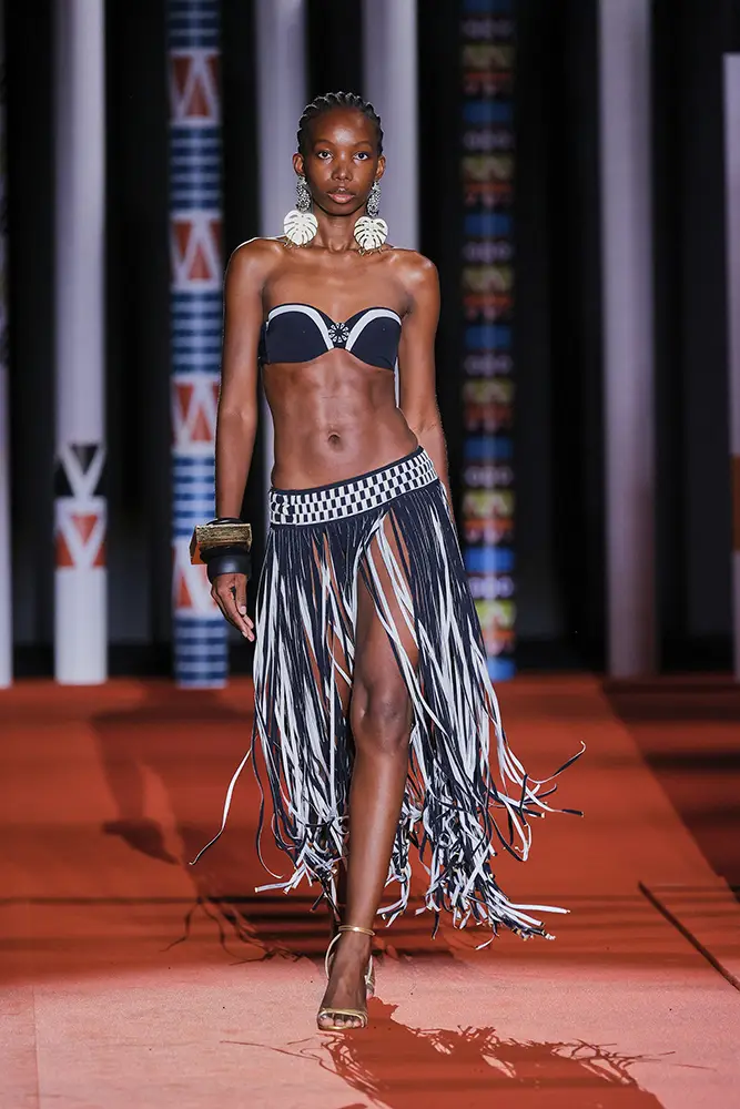 Ndebele parte de la riqueza visual que caracteriza los murales geométricos, donde los colores contrastantes, las formas angulares y los patrones repetitivos crean una estética gráfica potente. La diseñadora articula sus bañadores, bikinis, túnicas, pareos y accesorios como lienzos que dialogan con el cuerpo, diseñados para proyectar movimiento, personalidad y presencia. La paleta cromática fluye entre tonos tierra, azul oceánico, negro, blanco y contrastes vibrantes, evocando tanto la naturaleza como el exotismo propio de las manifestaciones artísticas africanas. Se suman detalles artesanales como flecos y abalorios, que no solo embellecen, sino que refuerzan la conexión entre tradición y modernidad.
