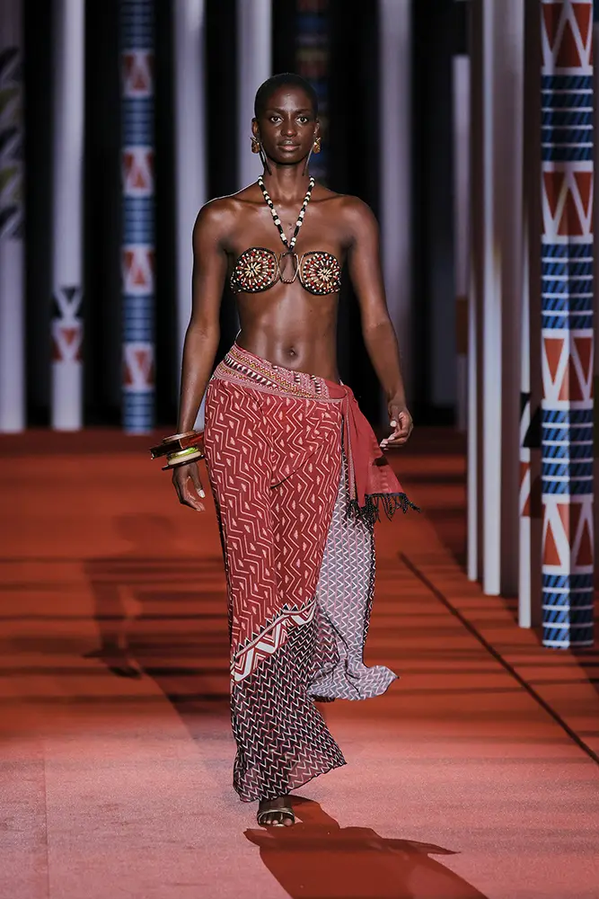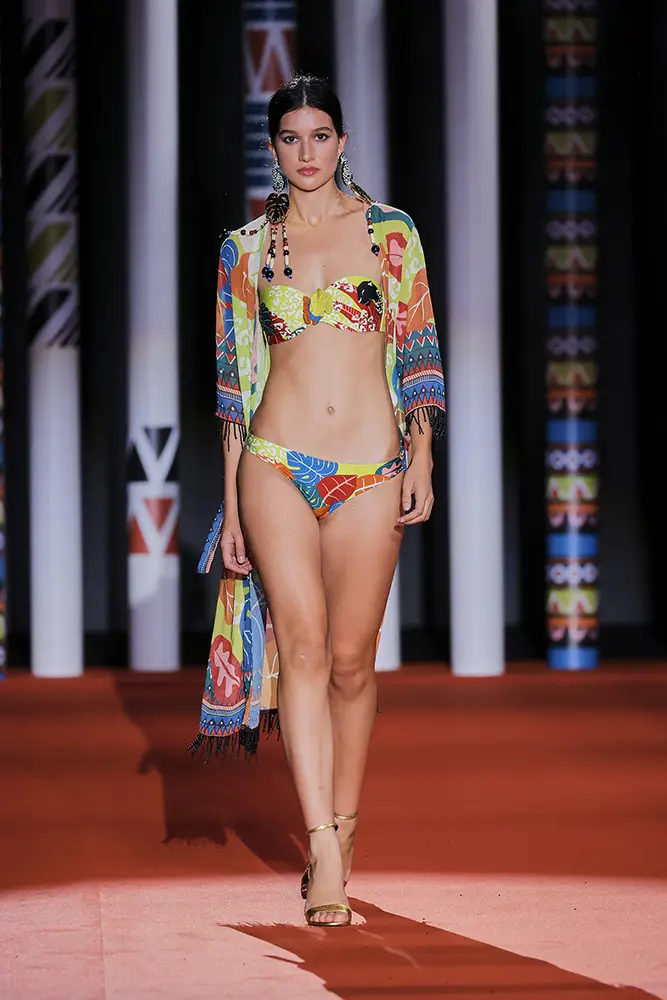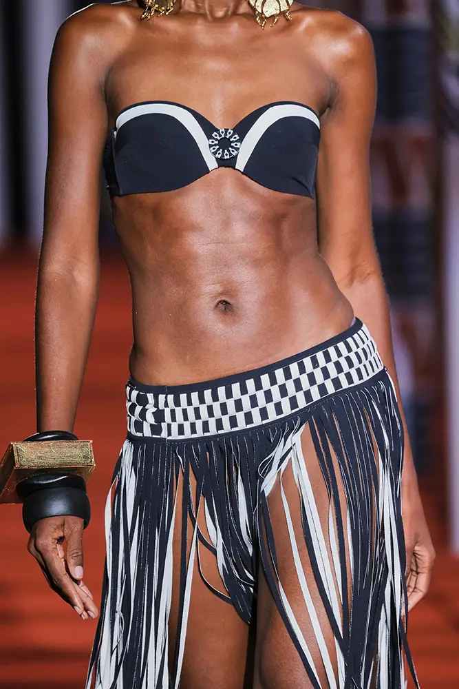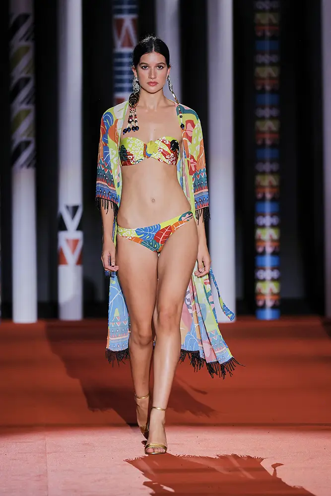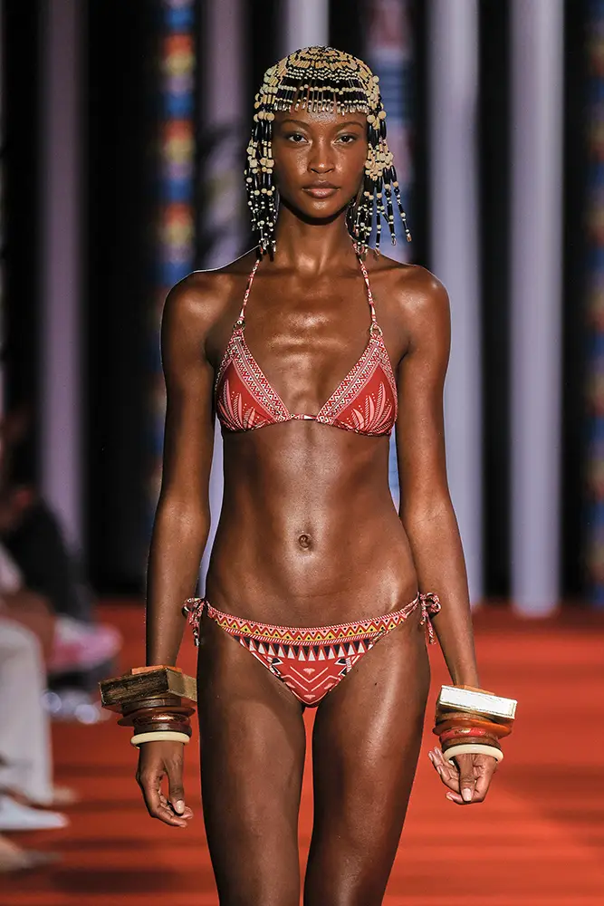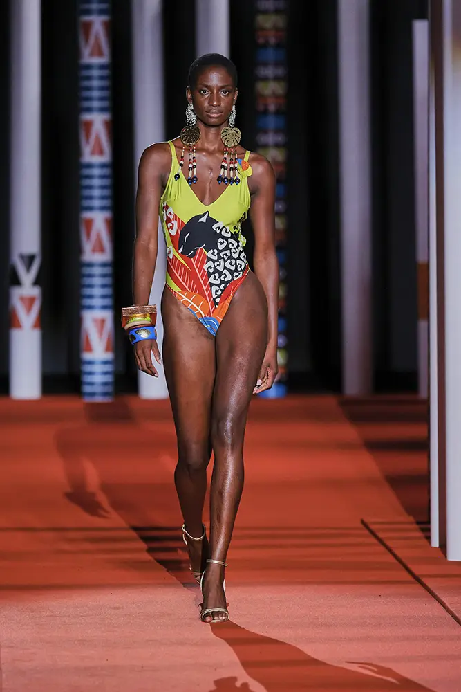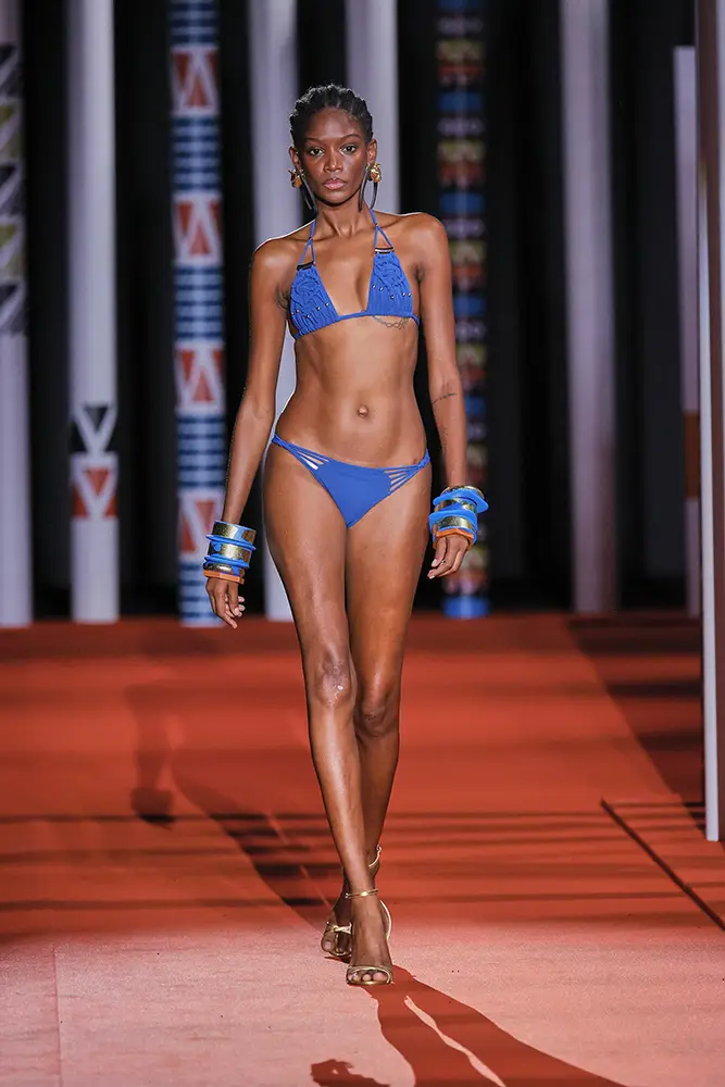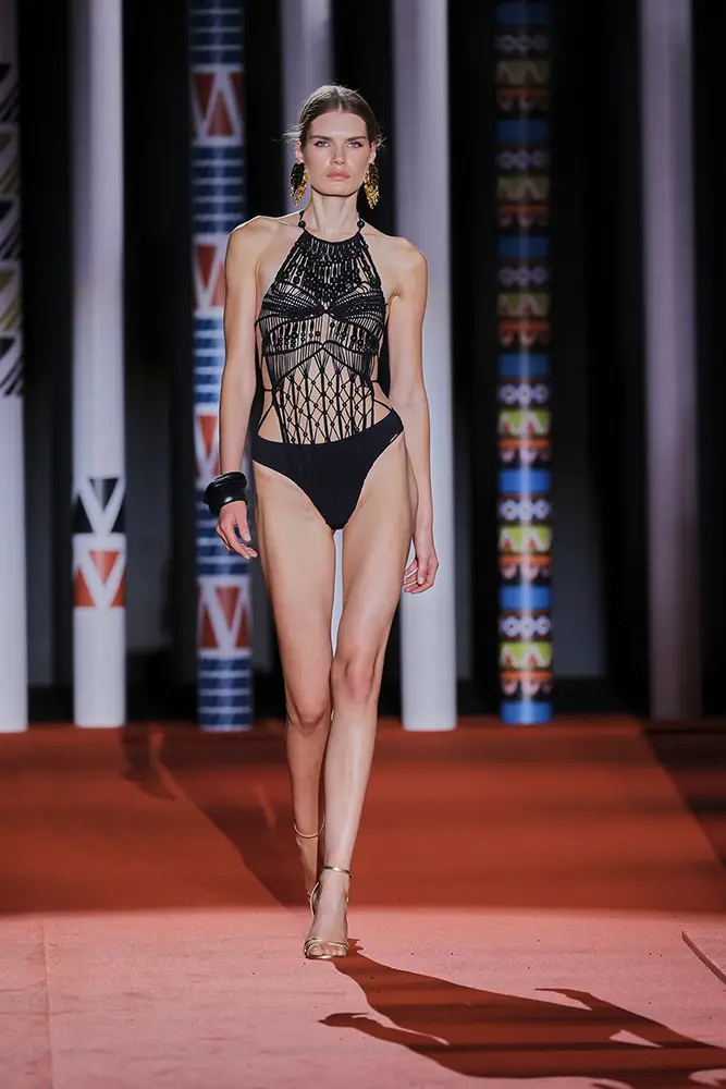 Ndebele parte de la riqueza visual que caracteriza los murales geométricos, donde los colores contrastantes, las formas angulares y los patrones repetitivos crean una estética gráfica potente. La diseñadora articula sus bañadores, bikinis, túnicas, pareos y accesorios como lienzos que dialogan con el cuerpo, diseñados para proyectar movimiento, personalidad y presencia. La paleta cromática fluye entre tonos tierra, azul oceánico, negro, blanco y contrastes vibrantes, evocando tanto la naturaleza como el exotismo propio de las manifestaciones artísticas africanas. Se suman detalles artesanales como flecos y abalorios, que no solo embellecen, sino que refuerzan la conexión entre tradición y modernidad.