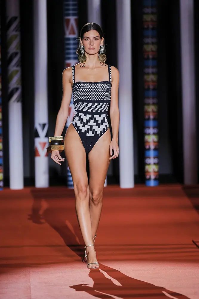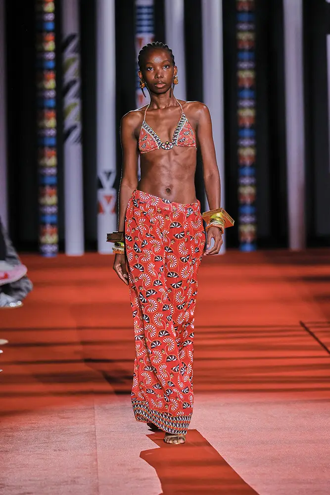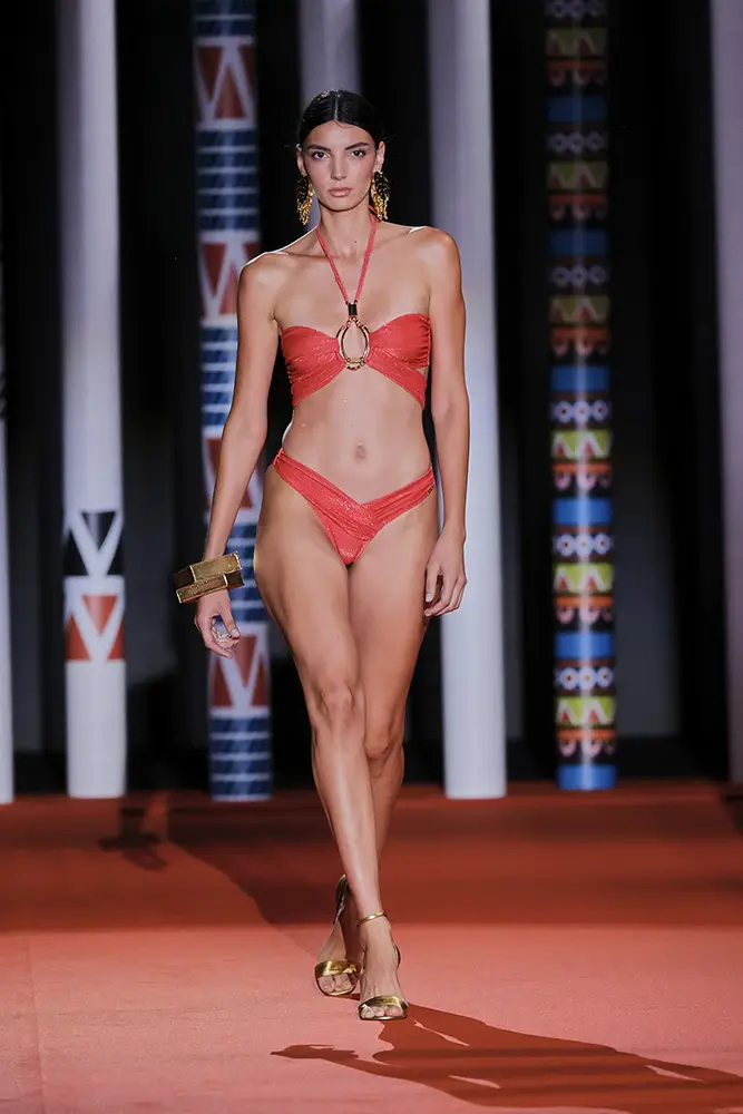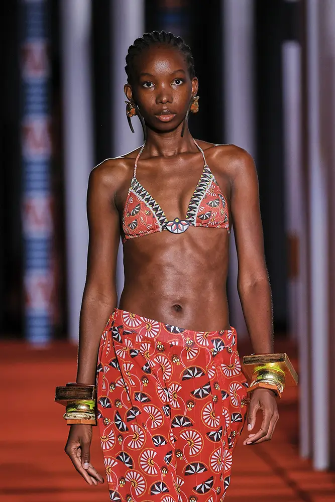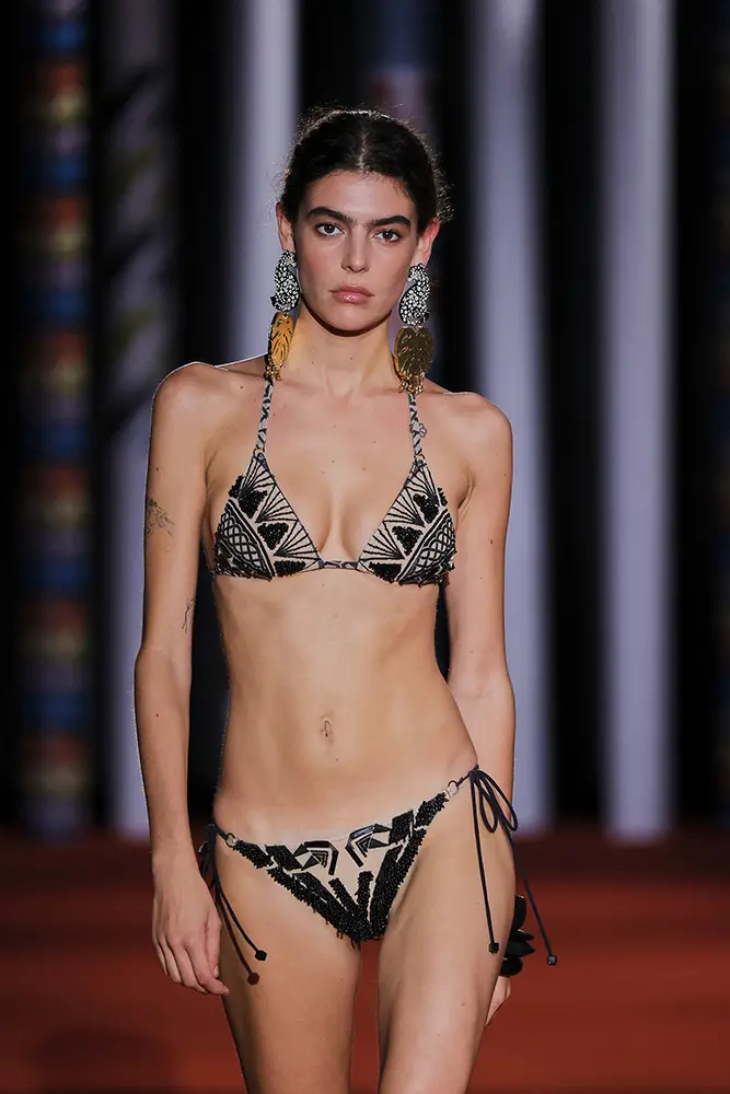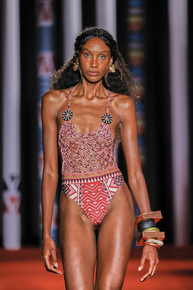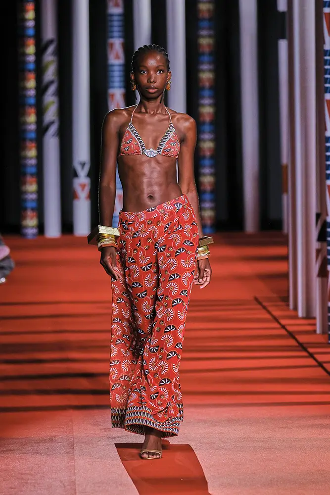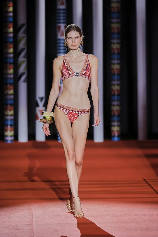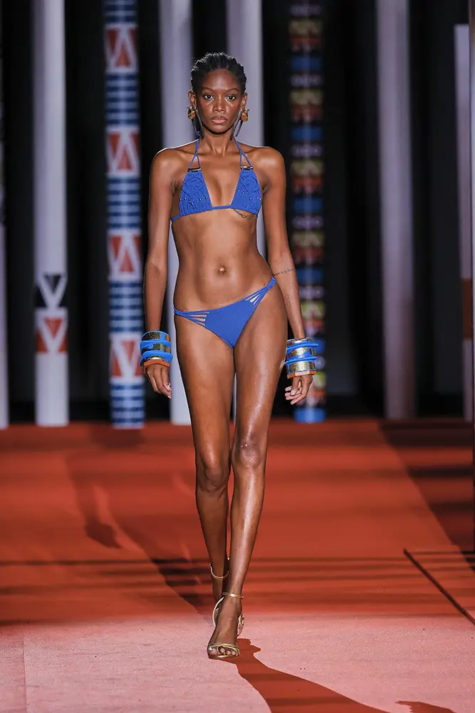 Ndebele parte de la riqueza visual que caracteriza los murales geométricos, donde los colores contrastantes, las formas angulares y los patrones repetitivos crean una estética gráfica potente. La diseñadora articula sus bañadores, bikinis, túnicas, pareos y accesorios como lienzos que dialogan con el cuerpo, diseñados para proyectar movimiento, personalidad y presencia. La paleta cromática fluye entre tonos tierra, azul oceánico, negro, blanco y contrastes vibrantes, evocando tanto la naturaleza como el exotismo propio de las manifestaciones artísticas africanas. Se suman detalles artesanales como flecos y abalorios, que no solo embellecen, sino que refuerzan la conexión entre tradición y modernidad.