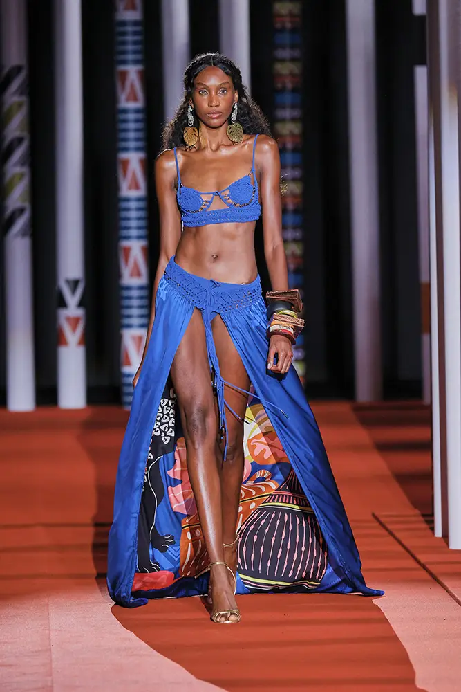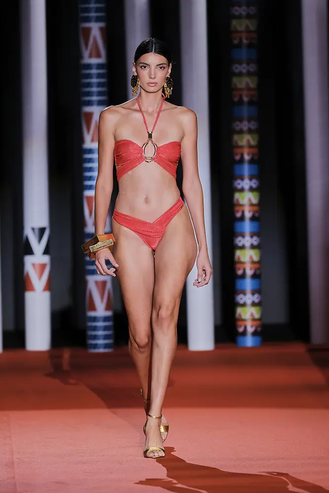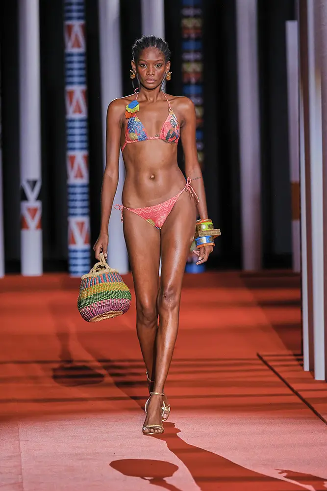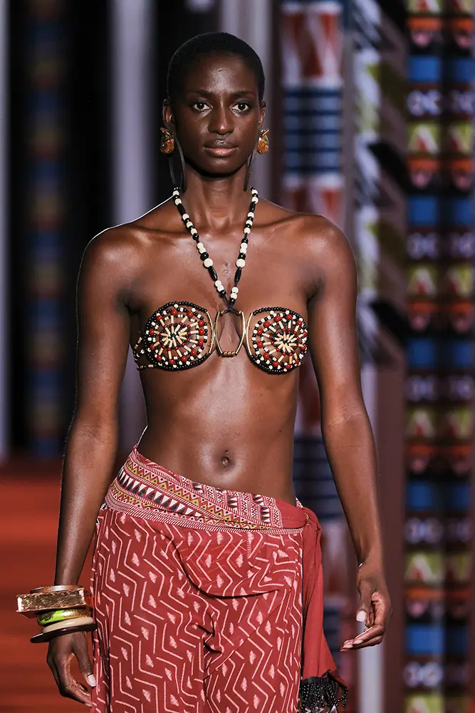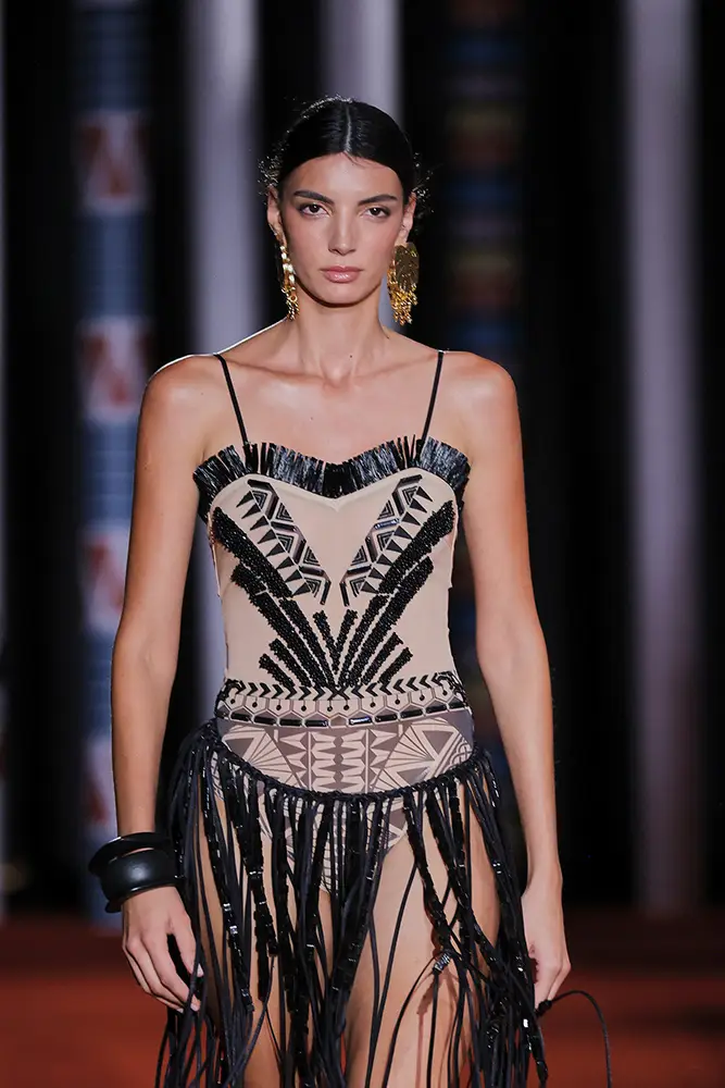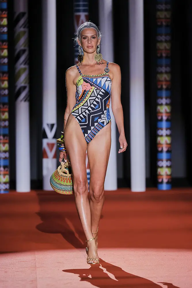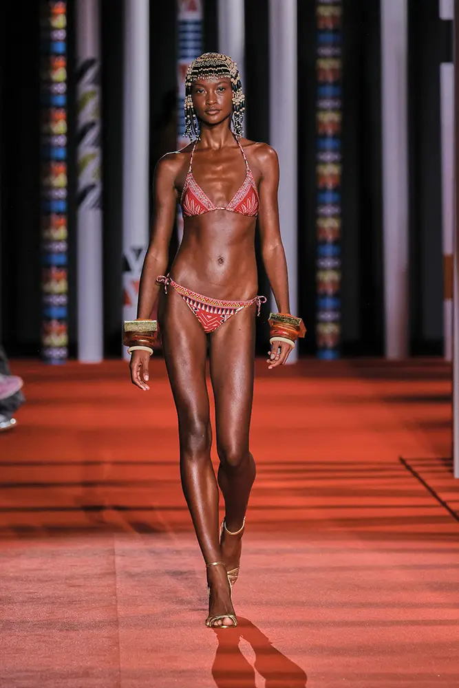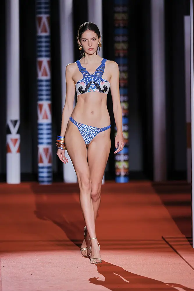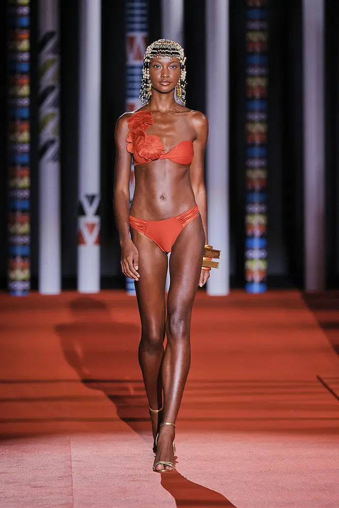 Ndebele parte de la riqueza visual que caracteriza los murales geométricos, donde los colores contrastantes, las formas angulares y los patrones repetitivos crean una estética gráfica potente. La diseñadora articula sus bañadores, bikinis, túnicas, pareos y accesorios como lienzos que dialogan con el cuerpo, diseñados para proyectar movimiento, personalidad y presencia. La paleta cromática fluye entre tonos tierra, azul oceánico, negro, blanco y contrastes vibrantes, evocando tanto la naturaleza como el exotismo propio de las manifestaciones artísticas africanas. Se suman detalles artesanales como flecos y abalorios, que no solo embellecen, sino que refuerzan la conexión entre tradición y modernidad.