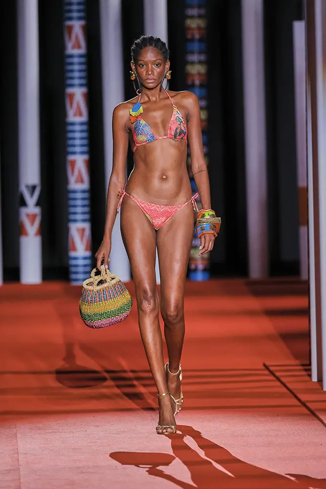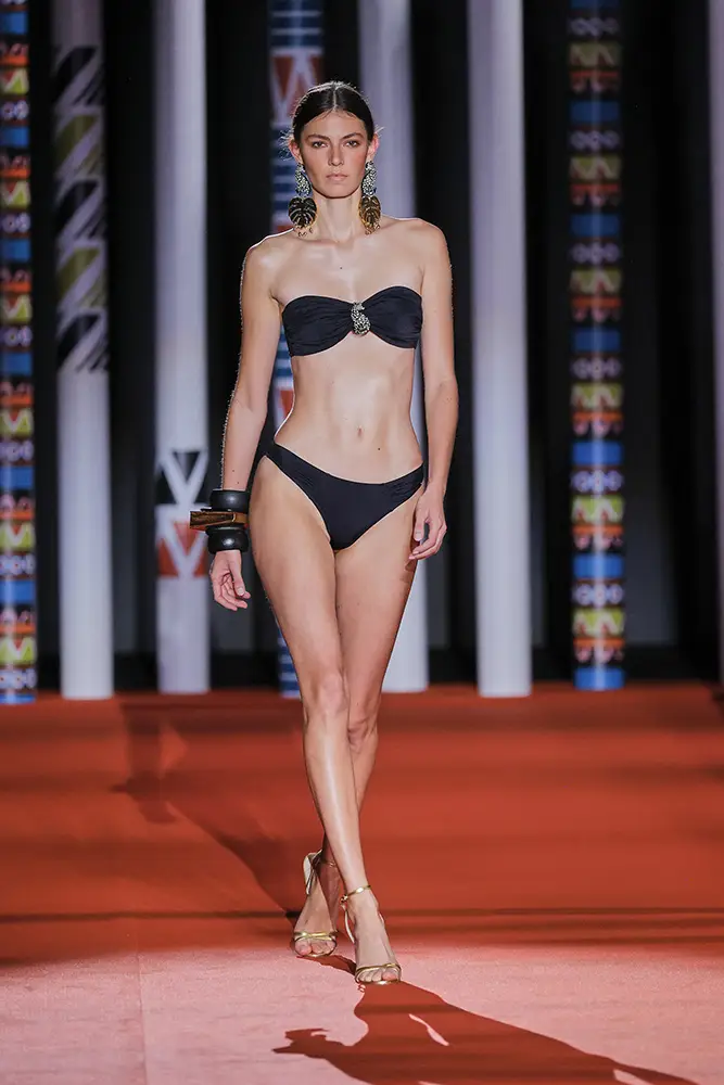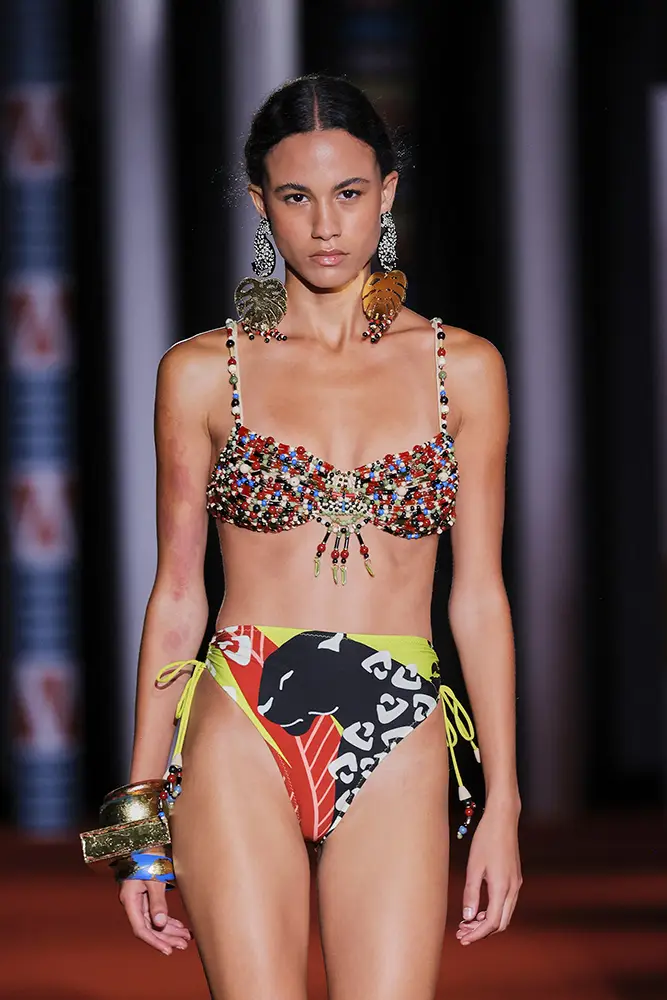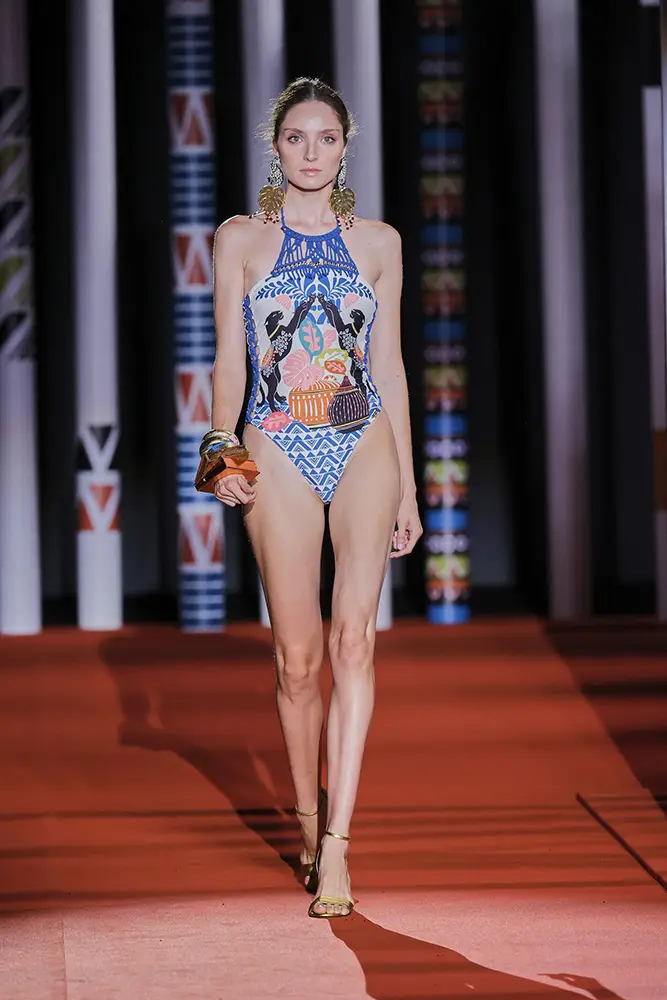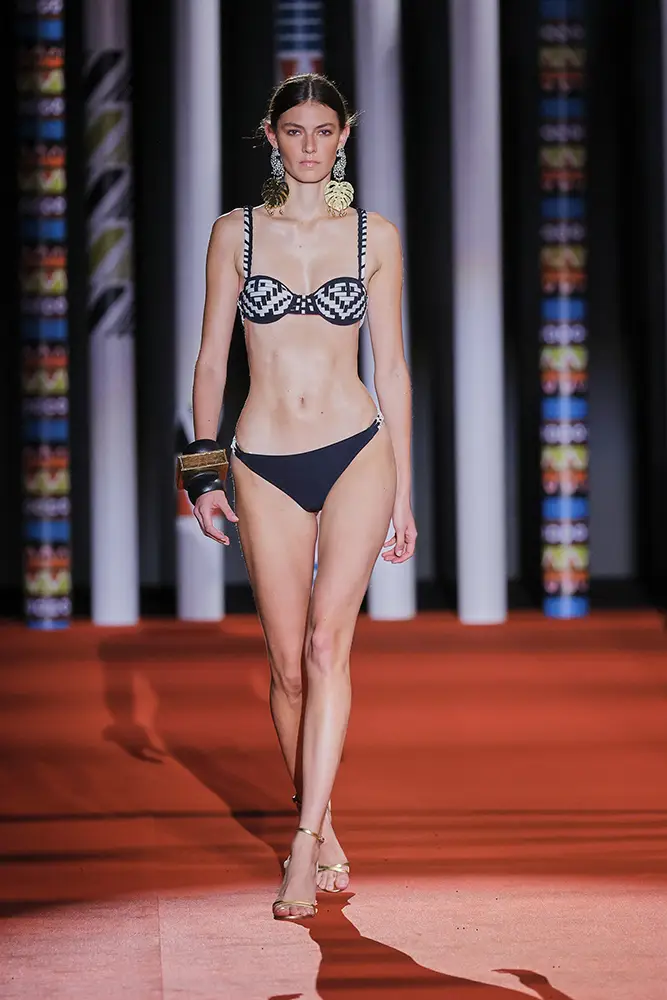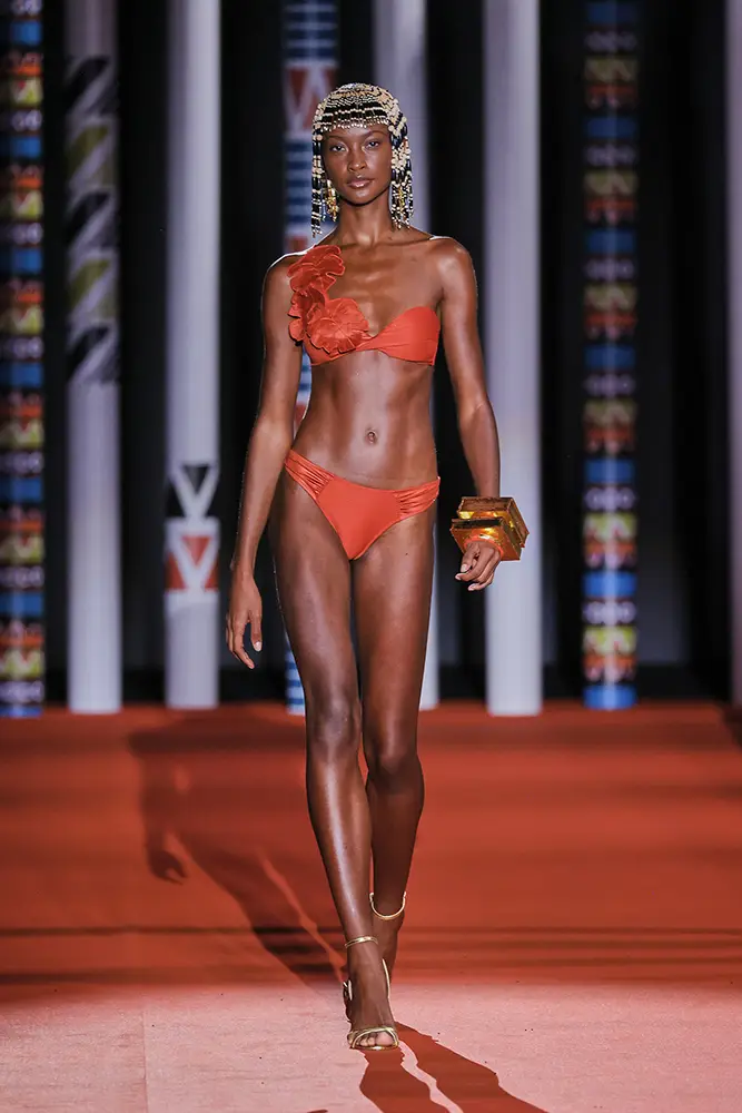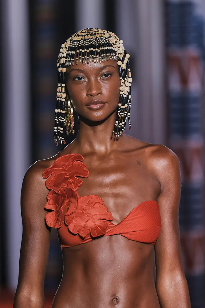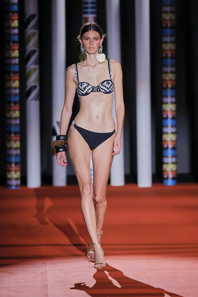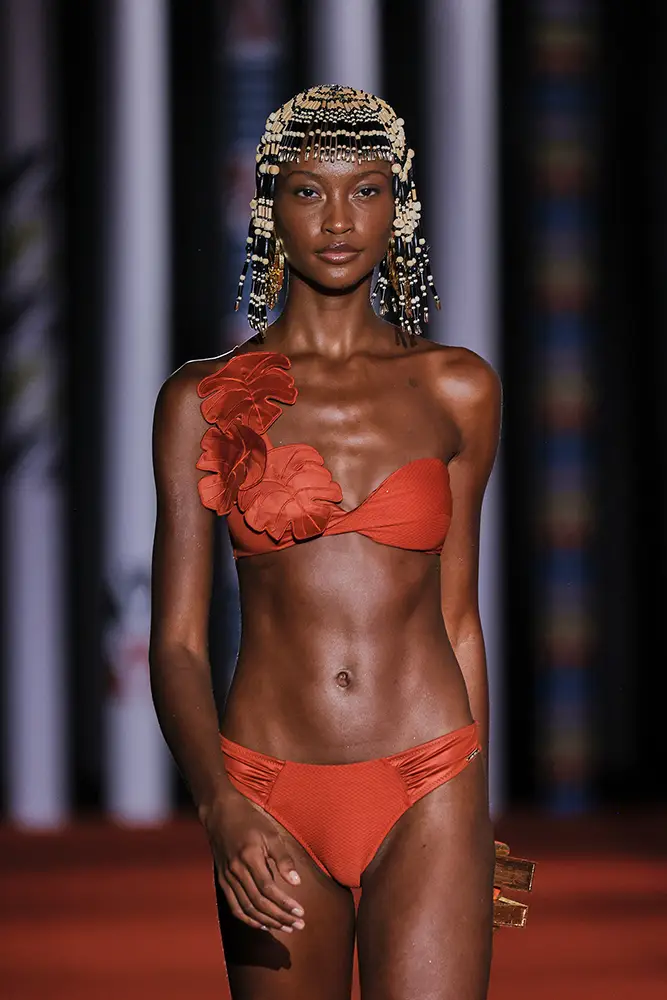 Ndebele parte de la riqueza visual que caracteriza los murales geométricos, donde los colores contrastantes, las formas angulares y los patrones repetitivos crean una estética gráfica potente. La diseñadora articula sus bañadores, bikinis, túnicas, pareos y accesorios como lienzos que dialogan con el cuerpo, diseñados para proyectar movimiento, personalidad y presencia. La paleta cromática fluye entre tonos tierra, azul oceánico, negro, blanco y contrastes vibrantes, evocando tanto la naturaleza como el exotismo propio de las manifestaciones artísticas africanas. Se suman detalles artesanales como flecos y abalorios, que no solo embellecen, sino que refuerzan la conexión entre tradición y modernidad.