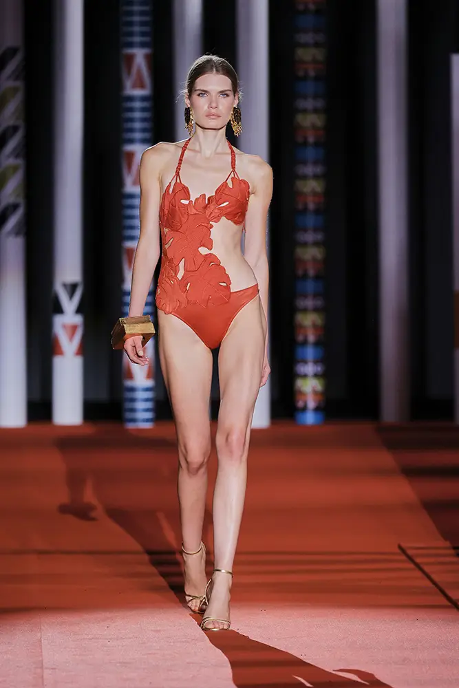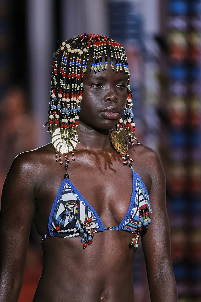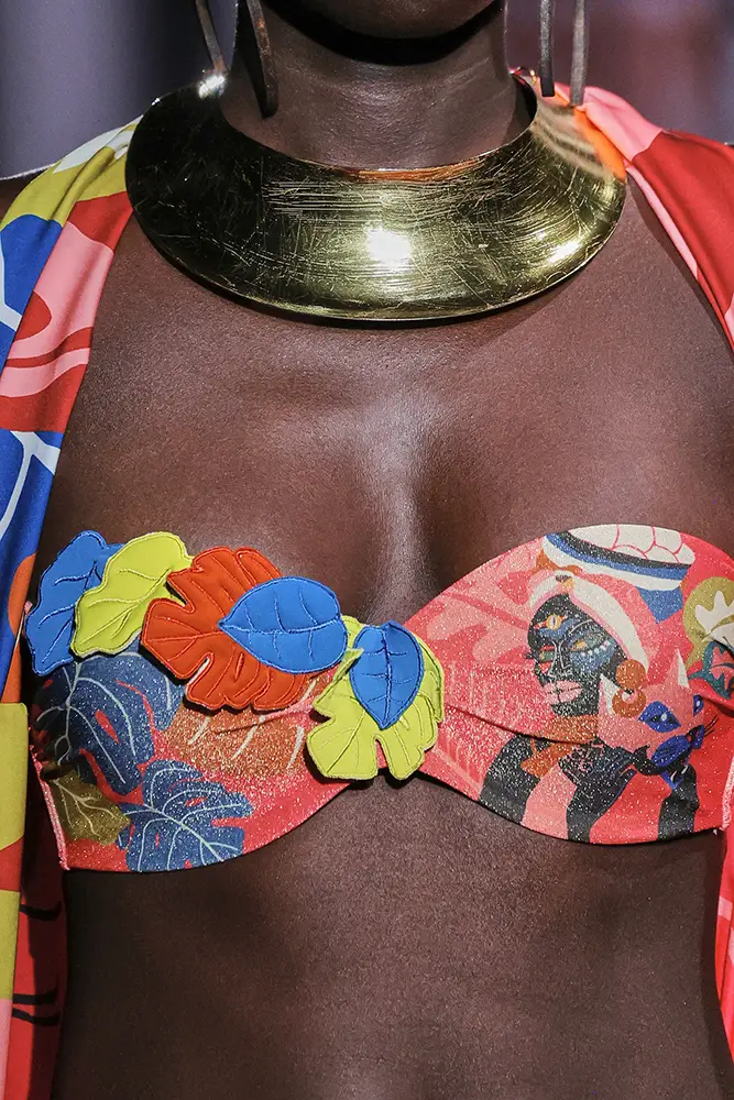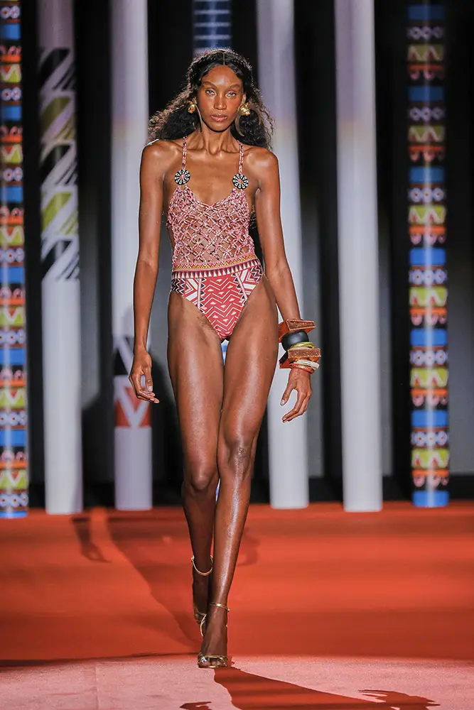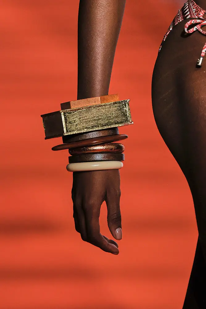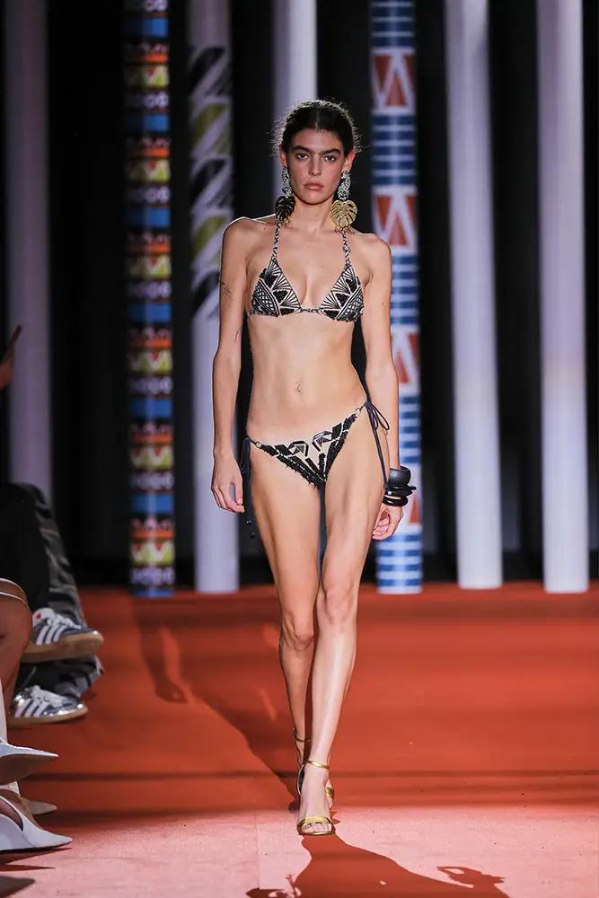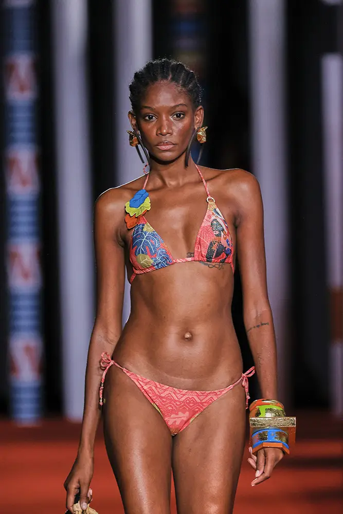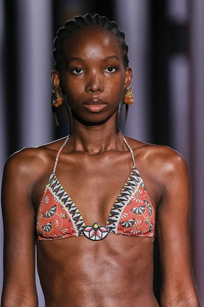 Ndebele parte de la riqueza visual que caracteriza los murales geométricos, donde los colores contrastantes, las formas angulares y los patrones repetitivos crean una estética gráfica potente. La diseñadora articula sus bañadores, bikinis, túnicas, pareos y accesorios como lienzos que dialogan con el cuerpo, diseñados para proyectar movimiento, personalidad y presencia. La paleta cromática fluye entre tonos tierra, azul oceánico, negro, blanco y contrastes vibrantes, evocando tanto la naturaleza como el exotismo propio de las manifestaciones artísticas africanas. Se suman detalles artesanales como flecos y abalorios, que no solo embellecen, sino que refuerzan la conexión entre tradición y modernidad.