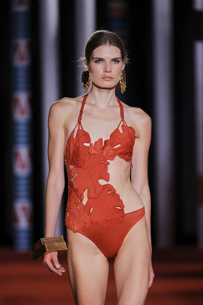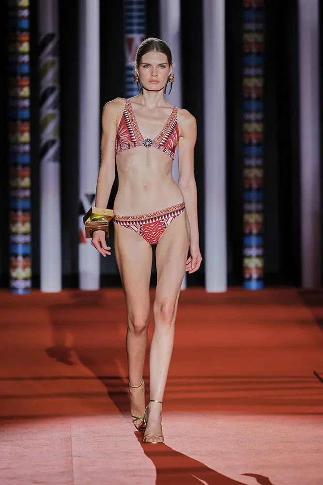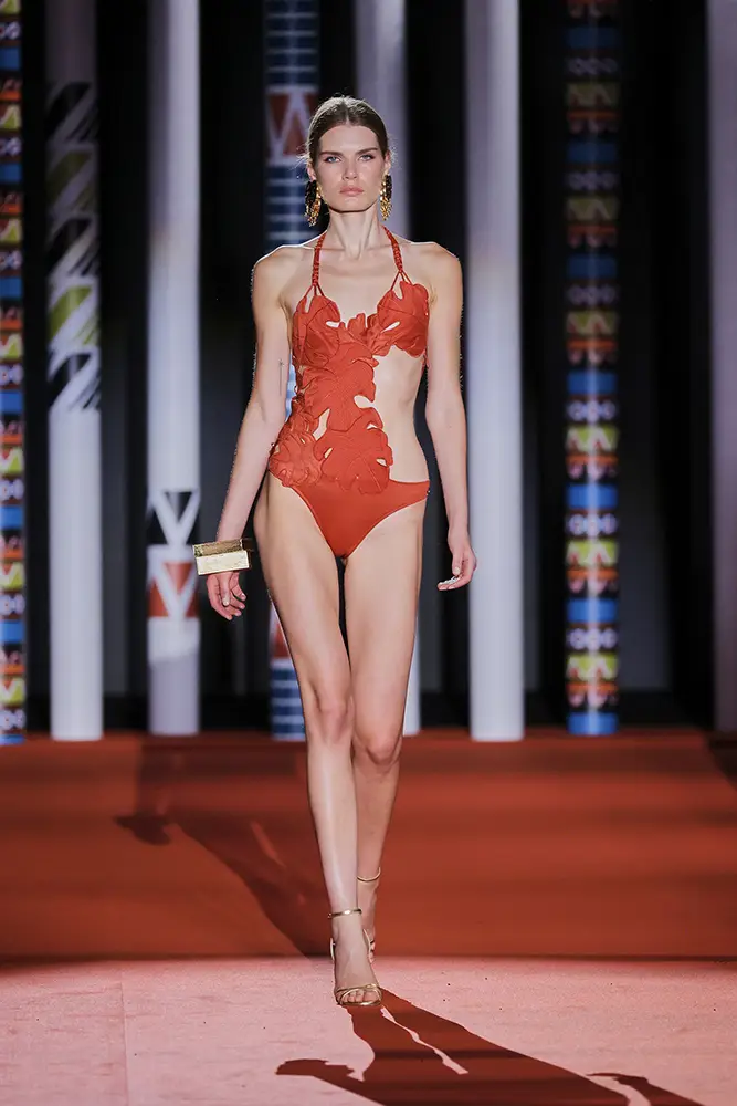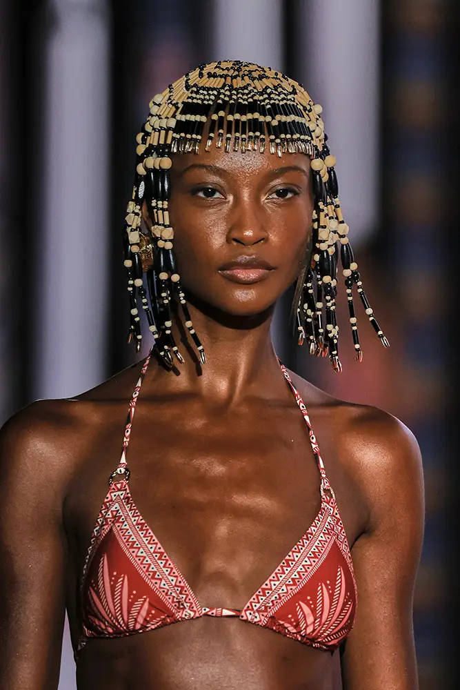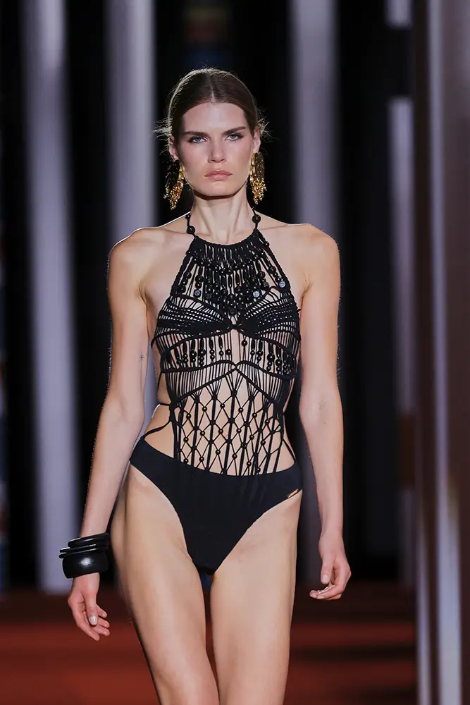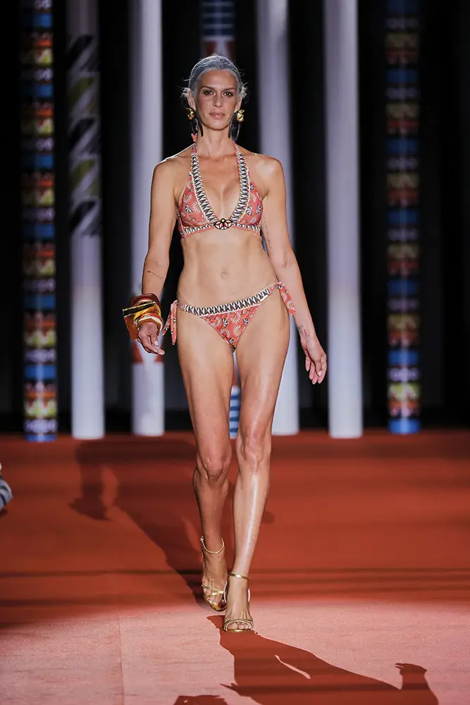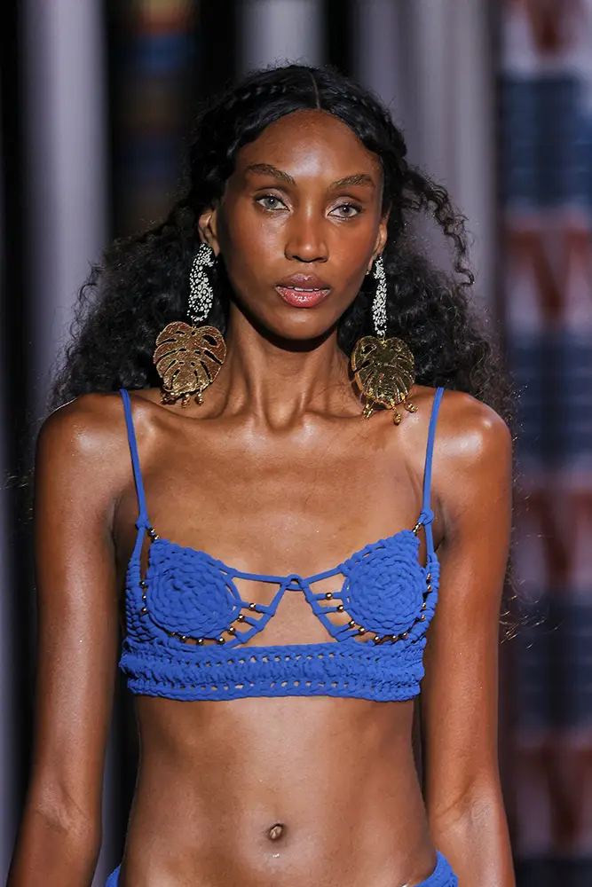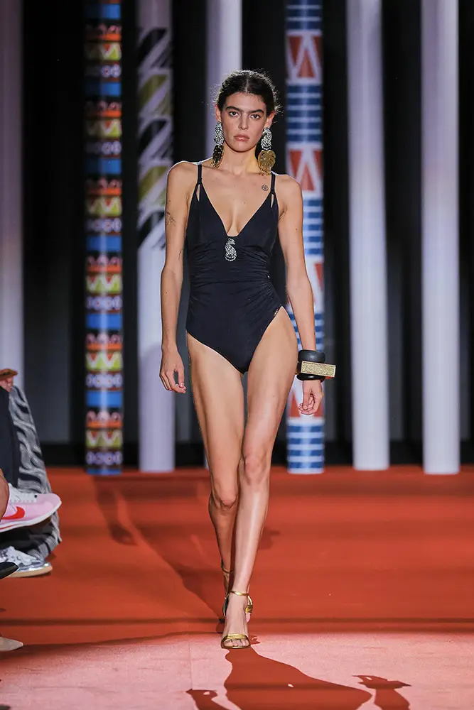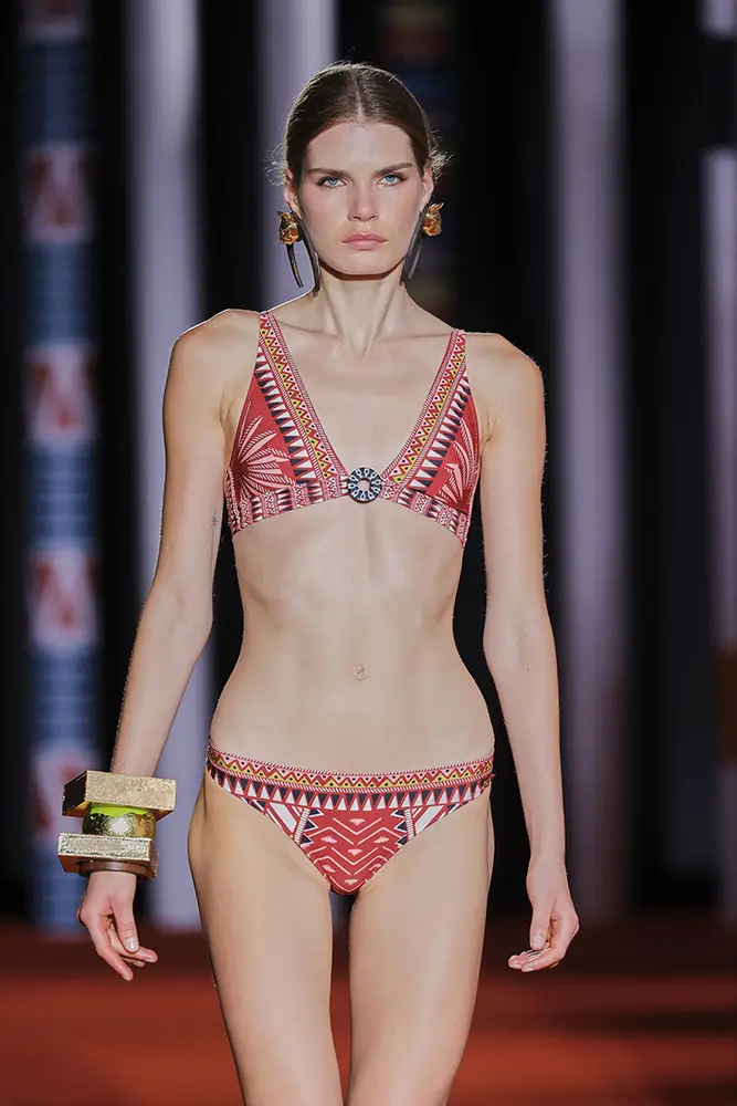 Ndebele parte de la riqueza visual que caracteriza los murales geométricos, donde los colores contrastantes, las formas angulares y los patrones repetitivos crean una estética gráfica potente. La diseñadora articula sus bañadores, bikinis, túnicas, pareos y accesorios como lienzos que dialogan con el cuerpo, diseñados para proyectar movimiento, personalidad y presencia. La paleta cromática fluye entre tonos tierra, azul oceánico, negro, blanco y contrastes vibrantes, evocando tanto la naturaleza como el exotismo propio de las manifestaciones artísticas africanas. Se suman detalles artesanales como flecos y abalorios, que no solo embellecen, sino que refuerzan la conexión entre tradición y modernidad.
