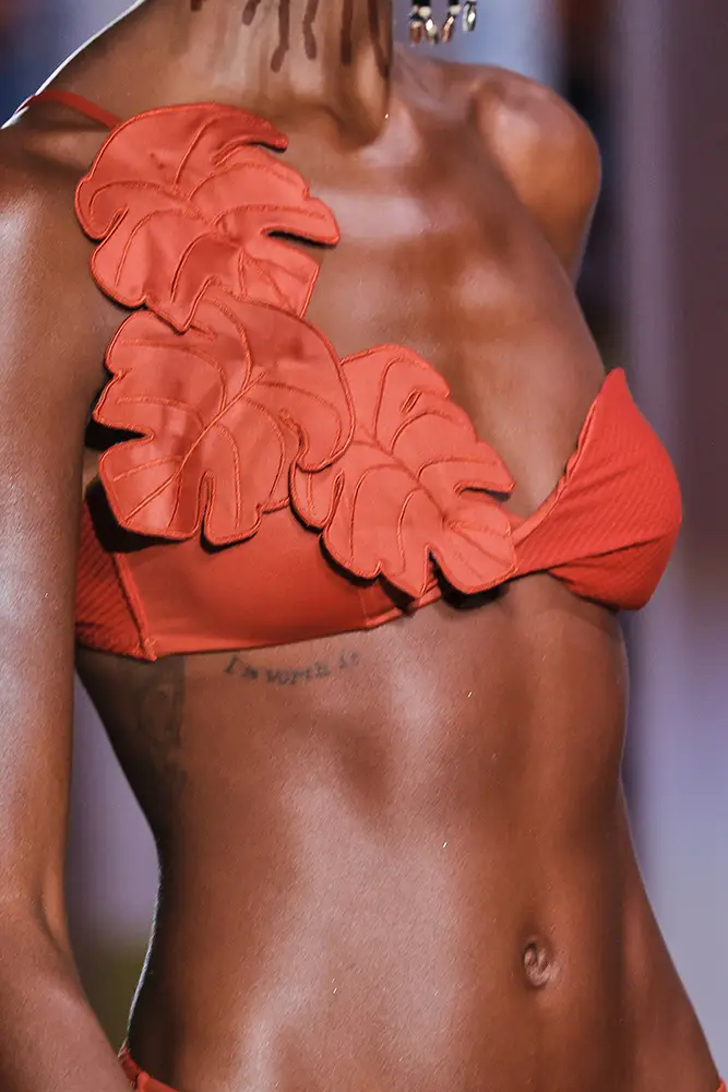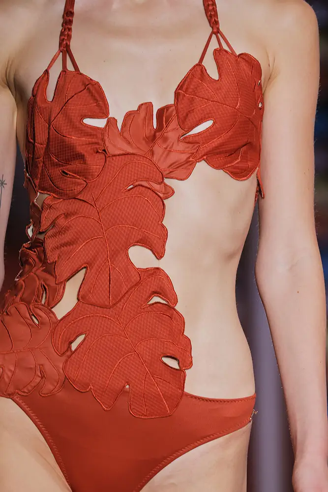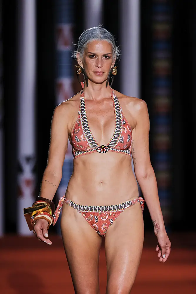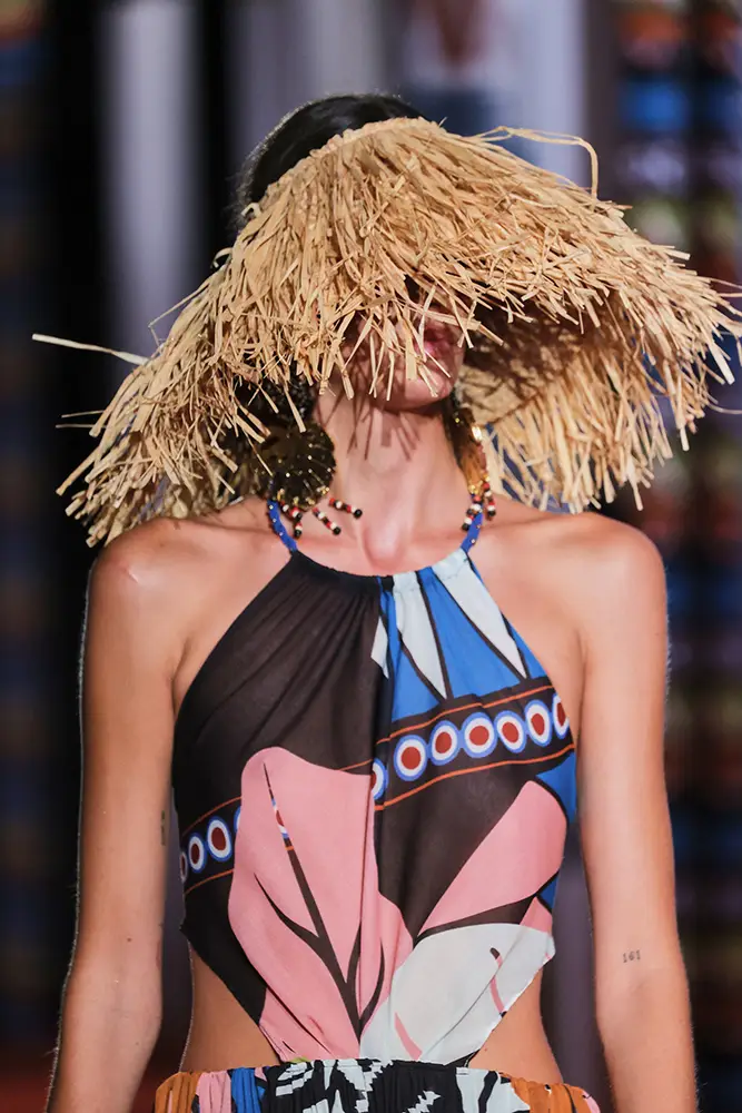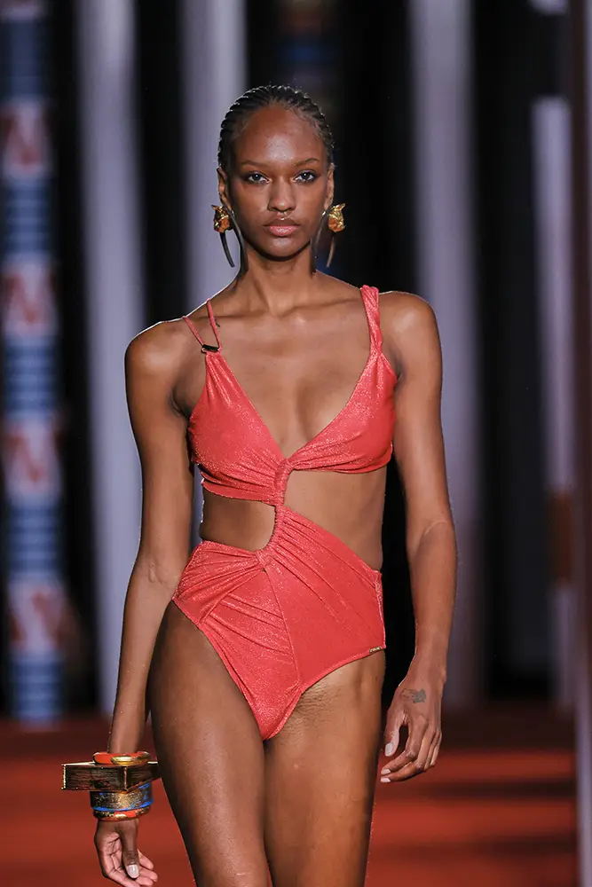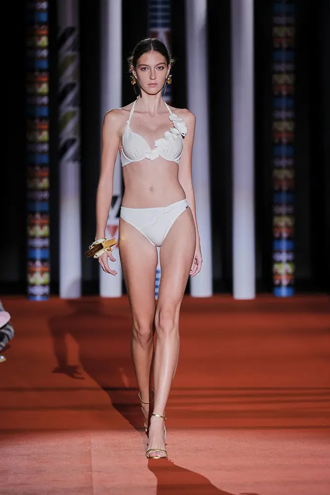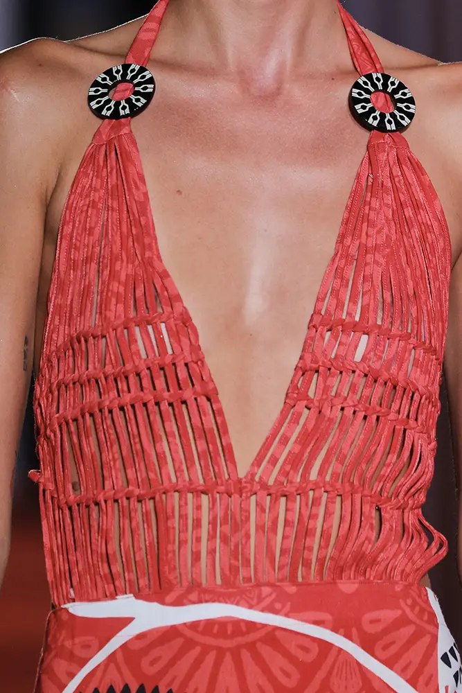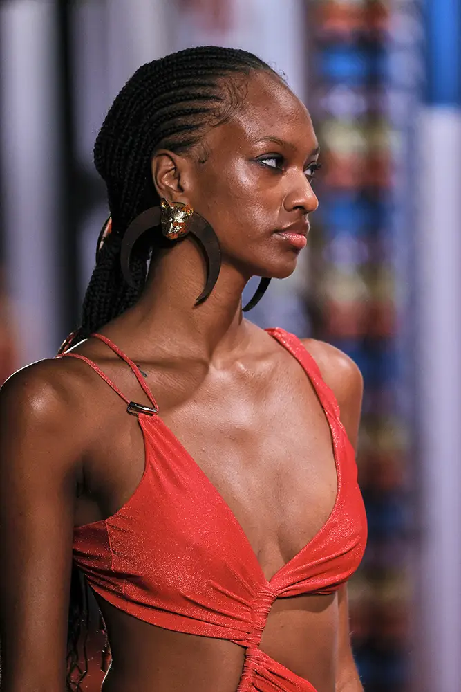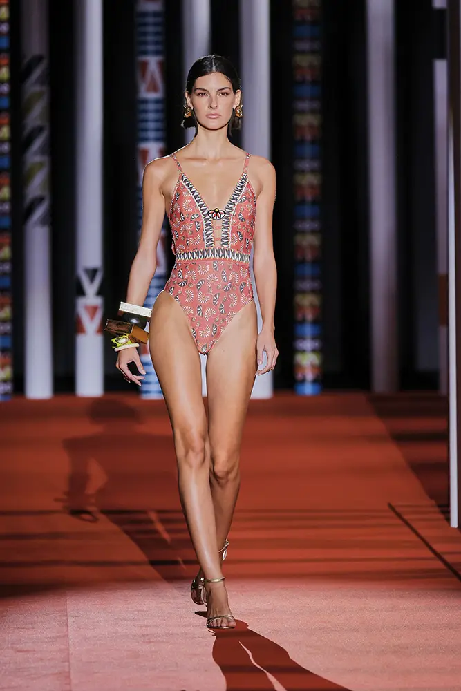 Ndebele parte de la riqueza visual que caracteriza los murales geométricos, donde los colores contrastantes, las formas angulares y los patrones repetitivos crean una estética gráfica potente. La diseñadora articula sus bañadores, bikinis, túnicas, pareos y accesorios como lienzos que dialogan con el cuerpo, diseñados para proyectar movimiento, personalidad y presencia. La paleta cromática fluye entre tonos tierra, azul oceánico, negro, blanco y contrastes vibrantes, evocando tanto la naturaleza como el exotismo propio de las manifestaciones artísticas africanas. Se suman detalles artesanales como flecos y abalorios, que no solo embellecen, sino que refuerzan la conexión entre tradición y modernidad.