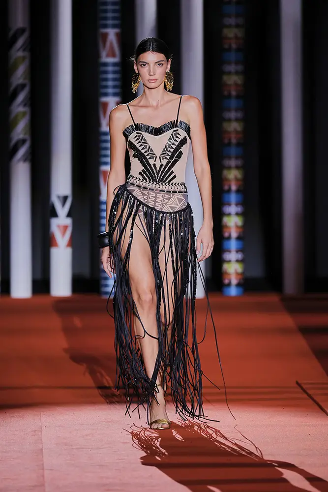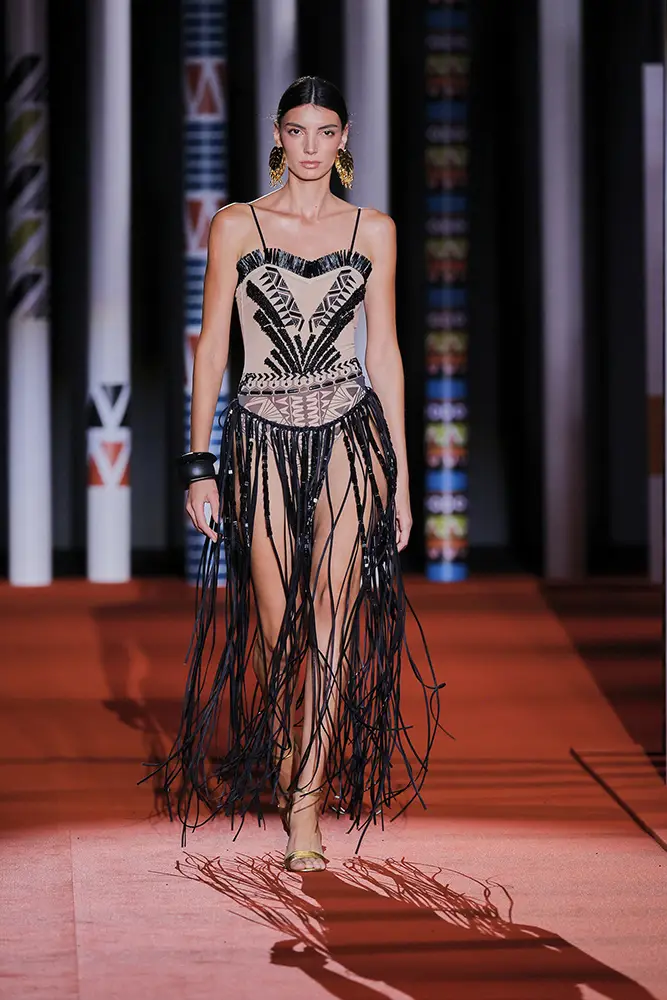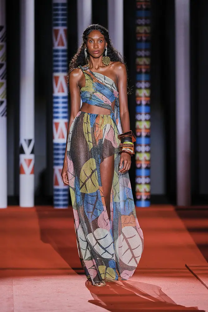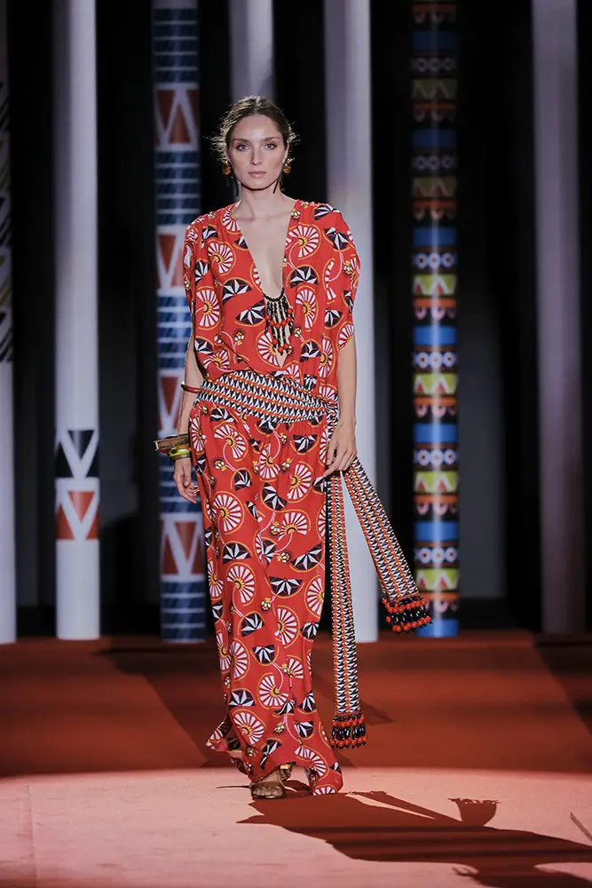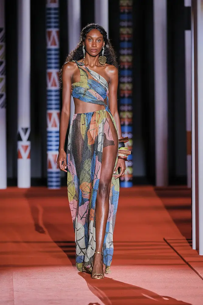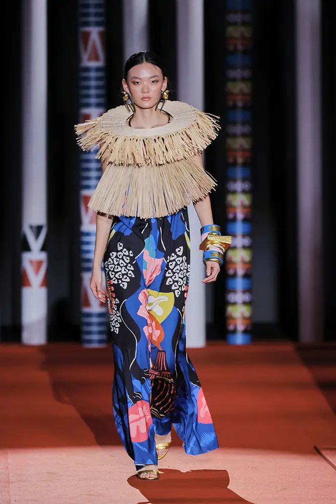 La colección Pasarela 026 de la diseñadora Dolores Cortés toma como referencia el arte mural y visual del pueblo Ndebele del sur de África. Esta propuesta reinterpreta con sensibilidad contemporánea códigos estéticos tradicionales, combinando lujo artesanal, estampados contundentes y siluetas sofisticadas.